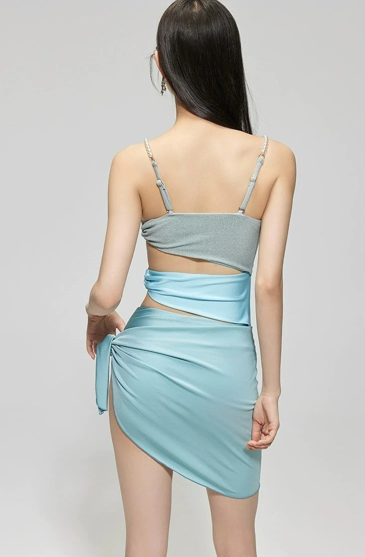 Crafted with a flattering shimmer fabric, this bikini set features a luxurious faux pearl strap adding a touch of sophistication. The side tie on the bottoms allows for a personalized fit, ensuring both comfort and style in a single design. Its solid color pattern exudes a chic, monochromatic look that pairs perfectly with sun-kissed skin.