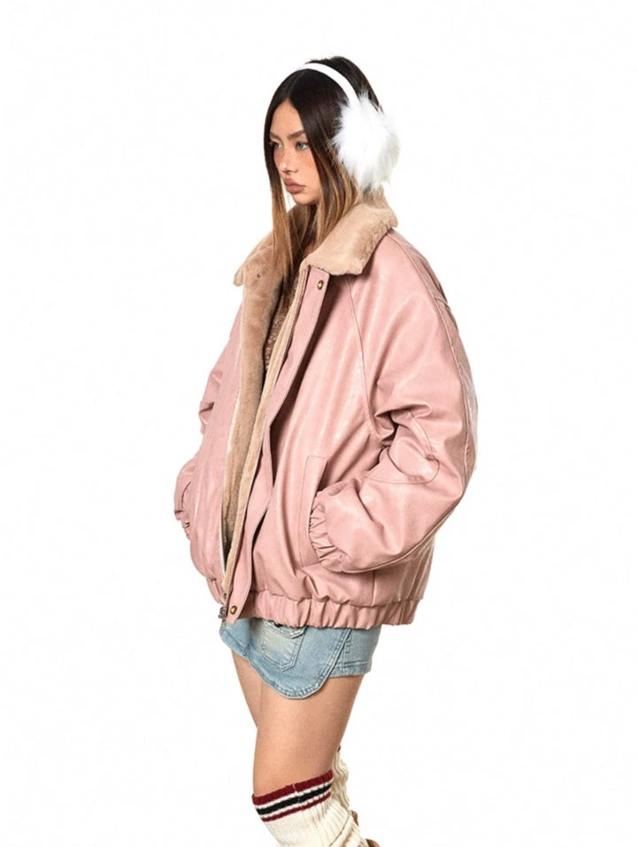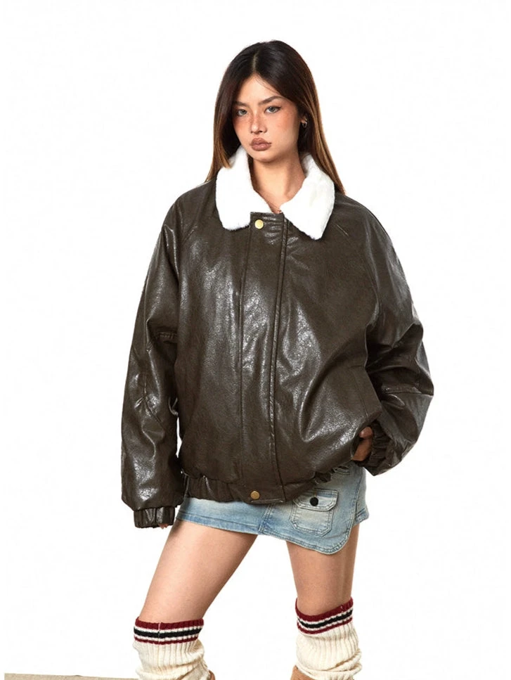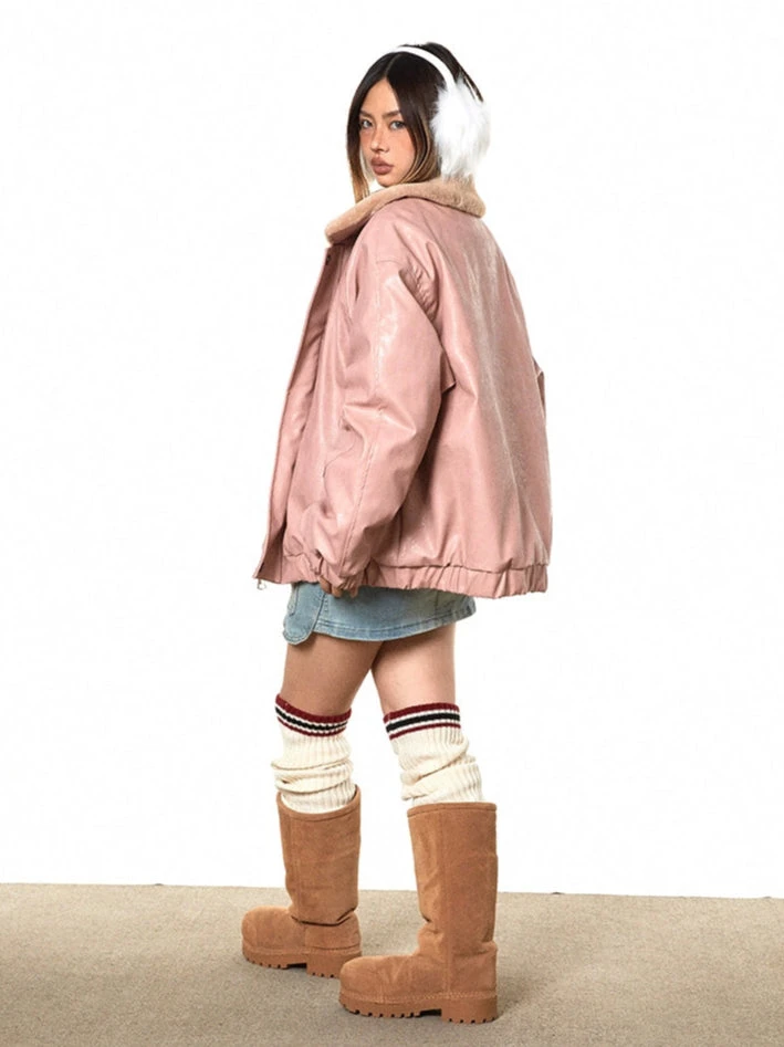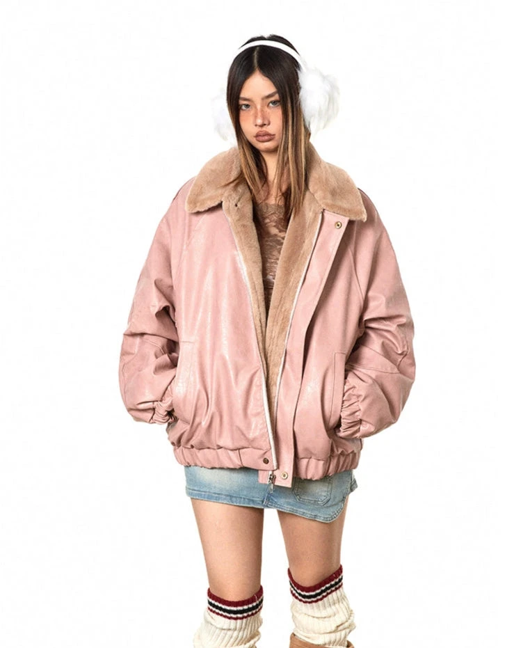 With a glossy faux leather exterior and plush fleece lining, it’s made for layering without sacrificing style. The structured silhouette is softened by padding for extra insulation, while ribbed cuffs lock in warmth. A zip-up front adds practicality, and the fold-over collar gives it a vintage-inspired touch. The subtly oversized fit makes it easy to throw on over anything, from laid-back denim to a fitted mini skirt.