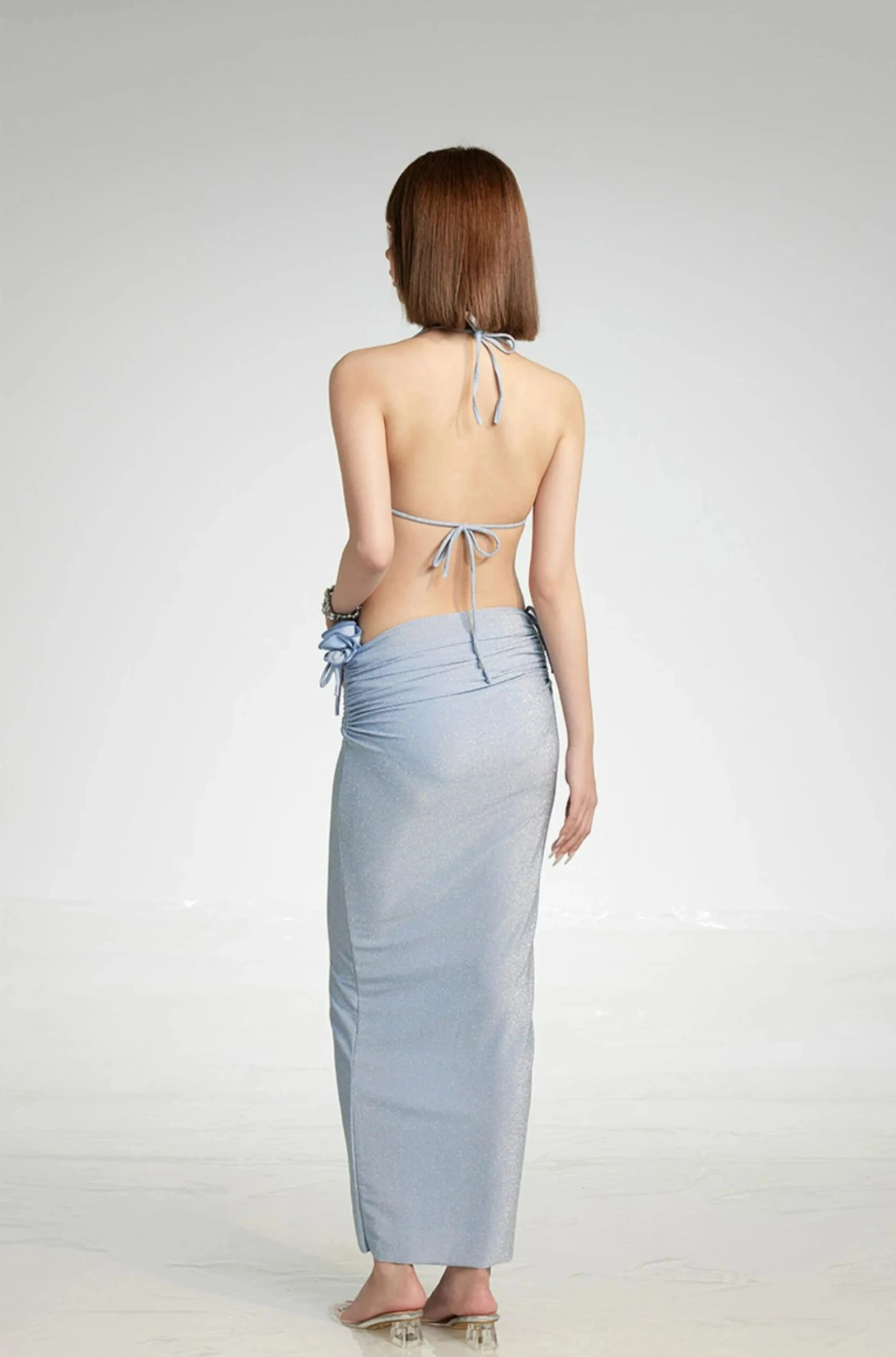 Paired effortlessly with slides for a day by the water or dressed up with wedges for an evening soiree, this set encapsulates a carefree spirit that resonates across sunny seasons. Its light blue hue and refined craftsmanship embody an understated luxury that speaks to your individuality.