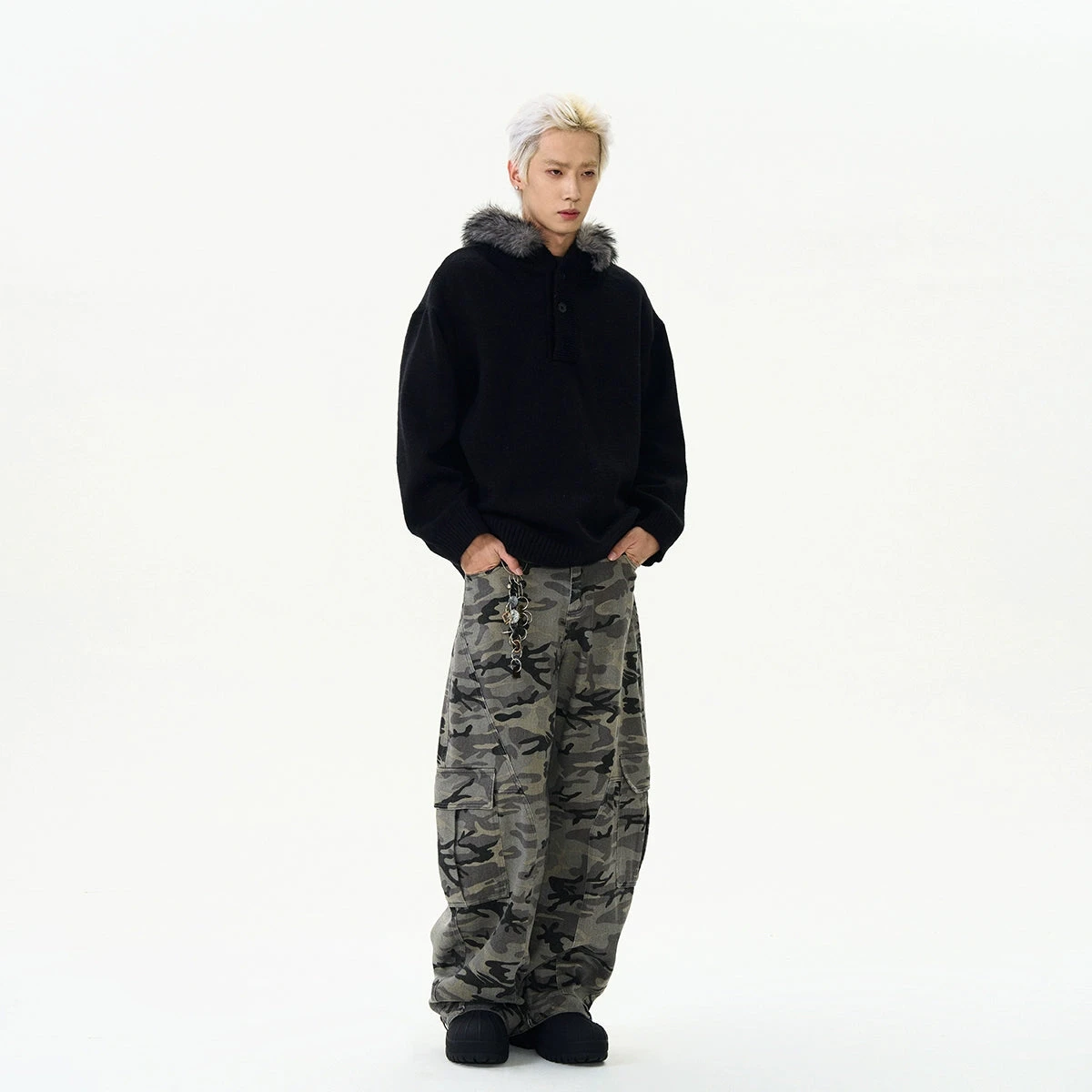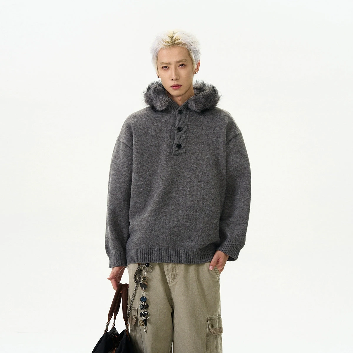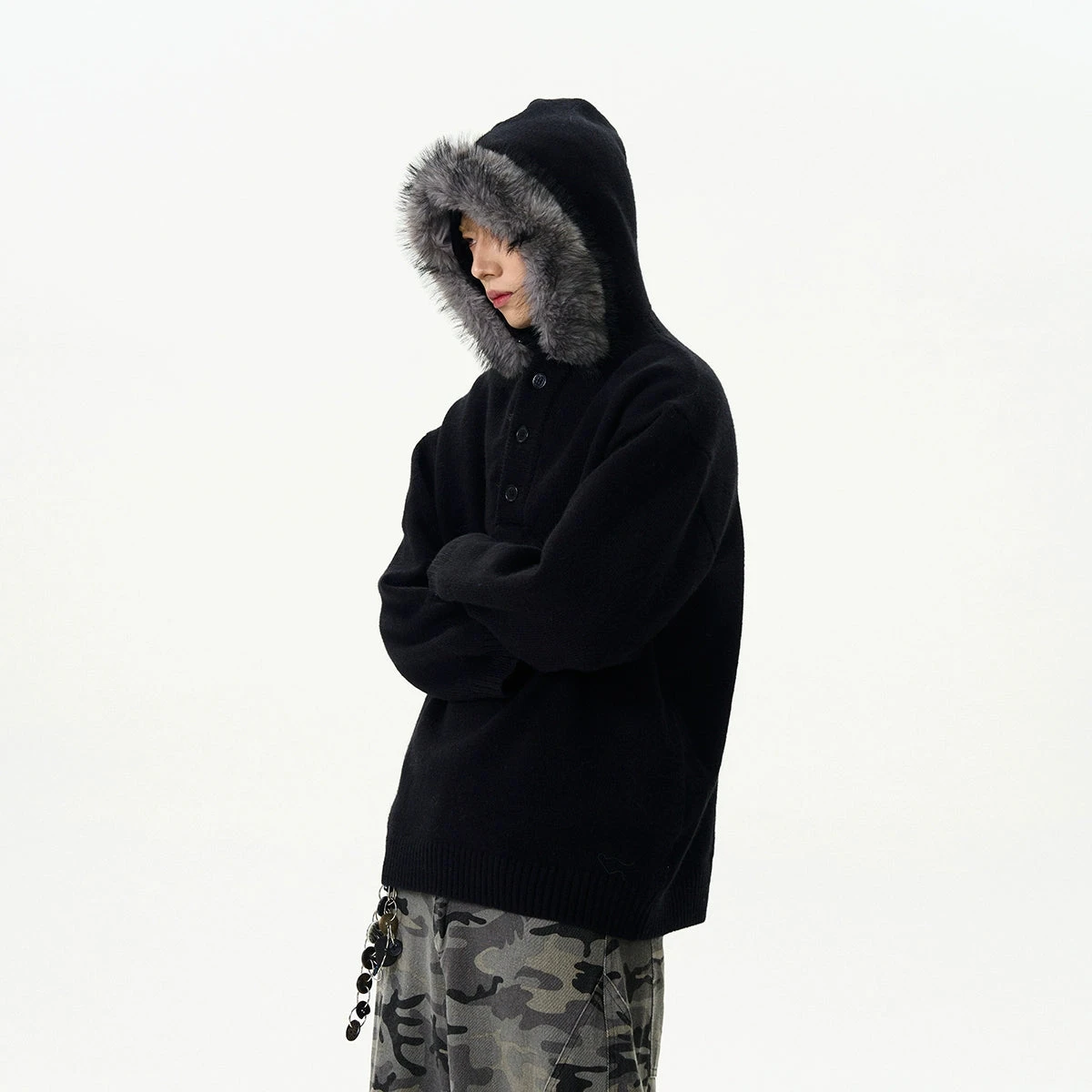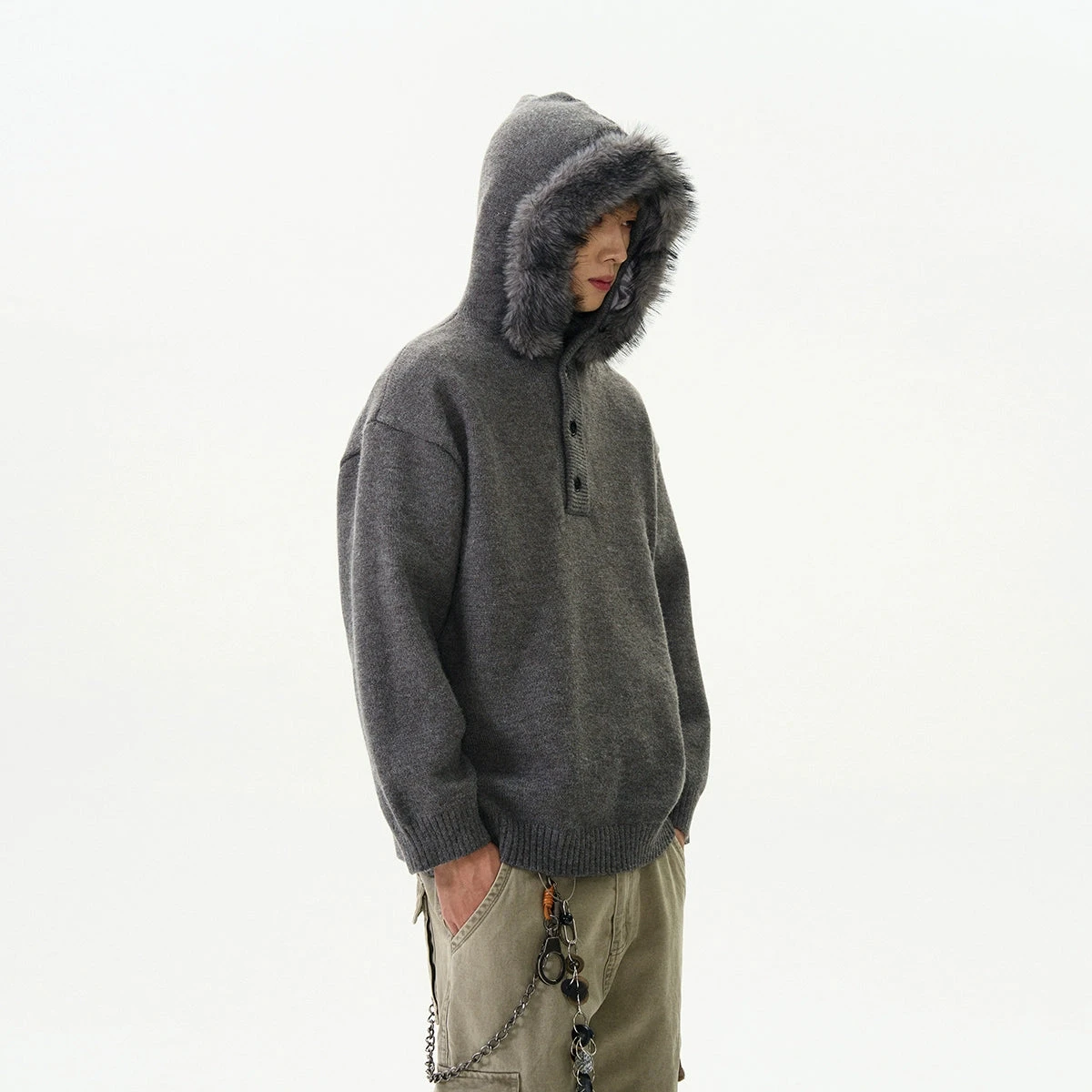 Crafted with meticulous attention to detail, this sweater boasts soft knit fabric that ensures both comfort and durability. The sleek solid color design is accentuated by subtle sideline details, and the removable velvety hood trim adds a touch of versatility to your wardrobe.