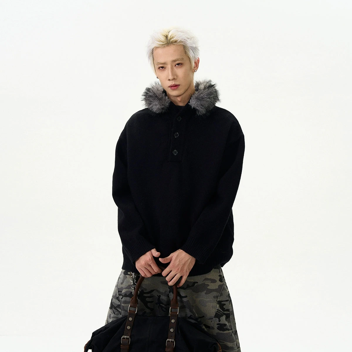 Elevate your casual ensemble with this moody half-zip knit sweater featuring a luxurious fur-trimmed hood.