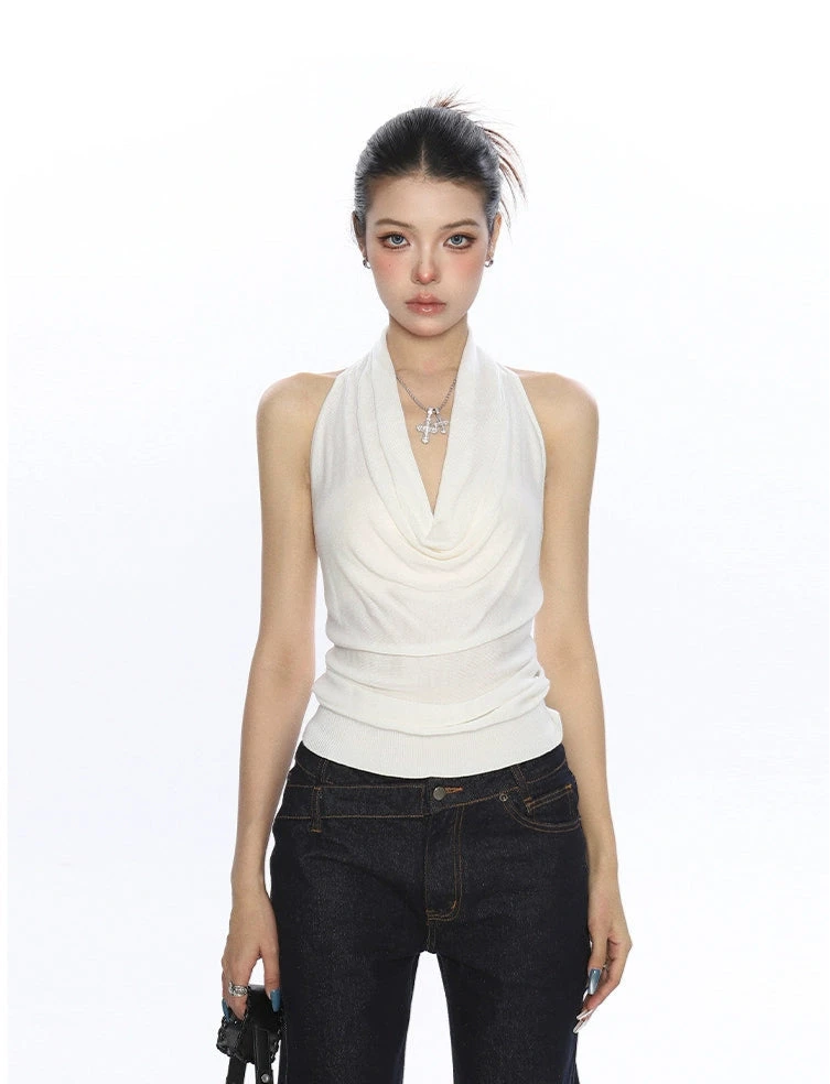 The open-back silhouette gives it a laid-back confidence, while the ribbed texture adds structure and subtle detailing. Made from a lightweight knit, this sleeveless top is soft with just enough stretch to contour your shape. The draped neckline and halter tie give it a fluid, unbothered look that pairs easily with everything from worn-in denim to tailored trousers.