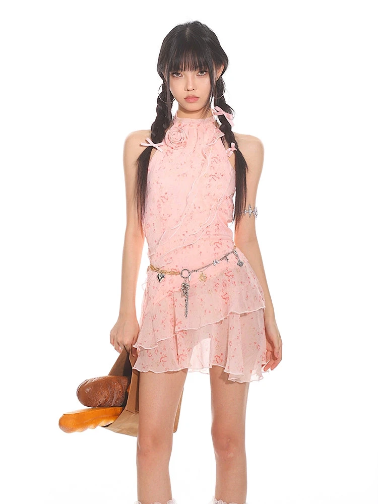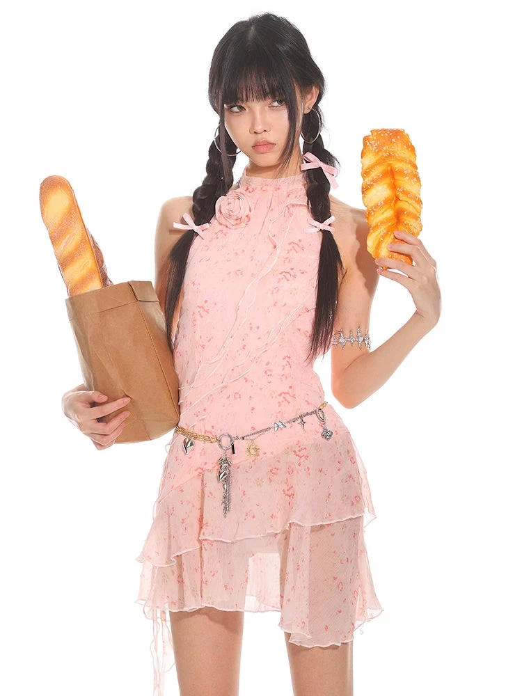 Expertly crafted with lightweight materials, this dress features a flattering halter neckline adorned with an intricate rosette detail. Its array of tiered ruffles cascades down to create a playful yet sophisticated silhouette, complemented by a soft floral mesh pattern that dances with each movement, embodying the spirit of a late-night summer soiree.