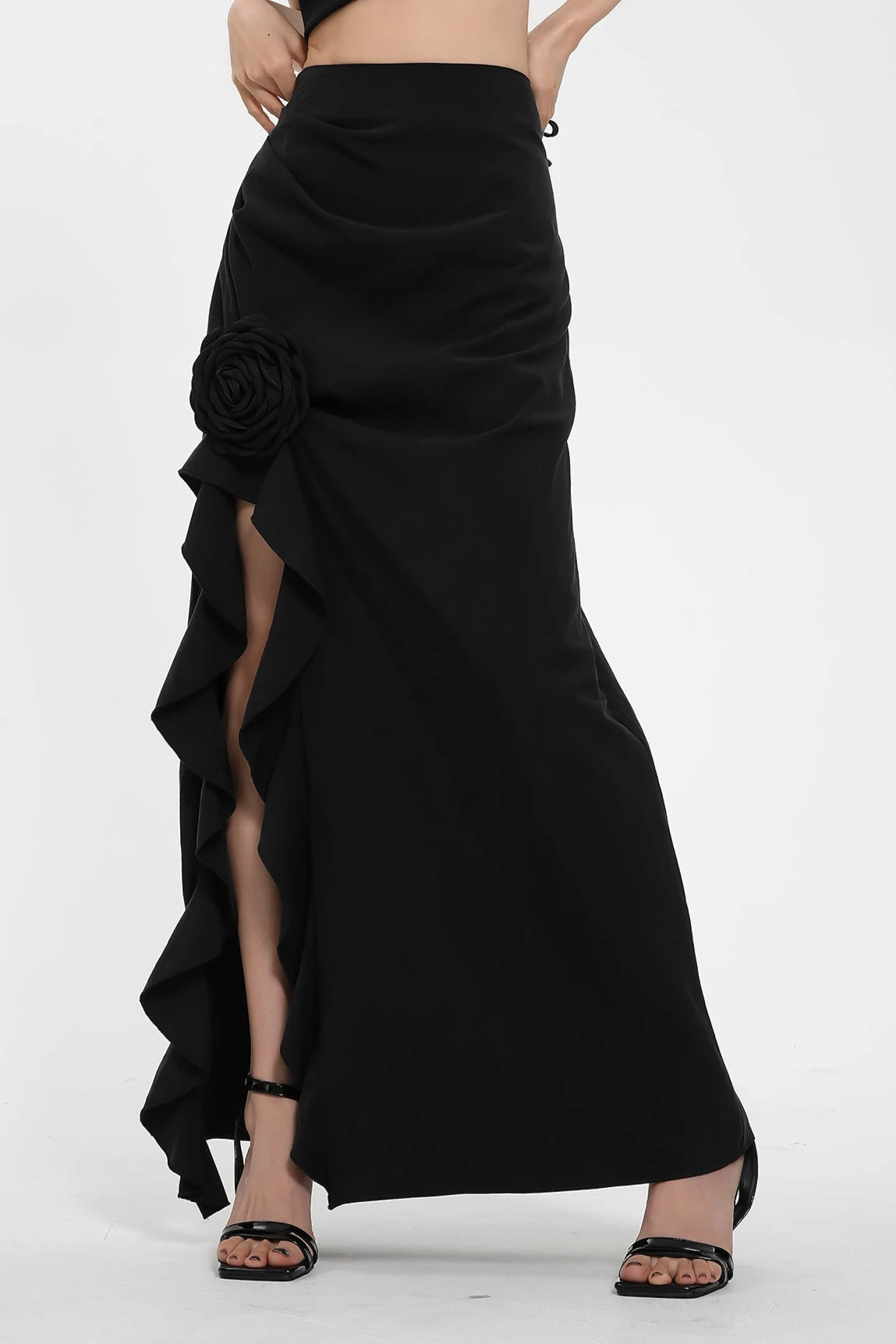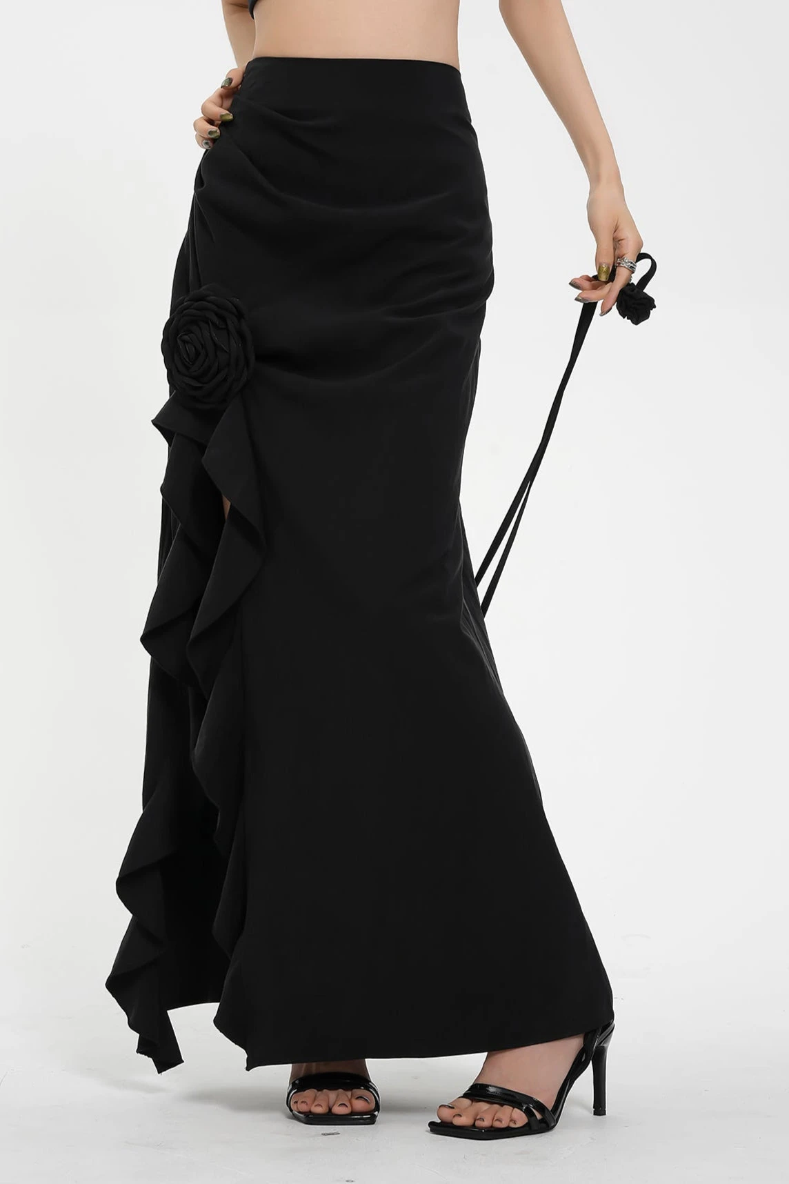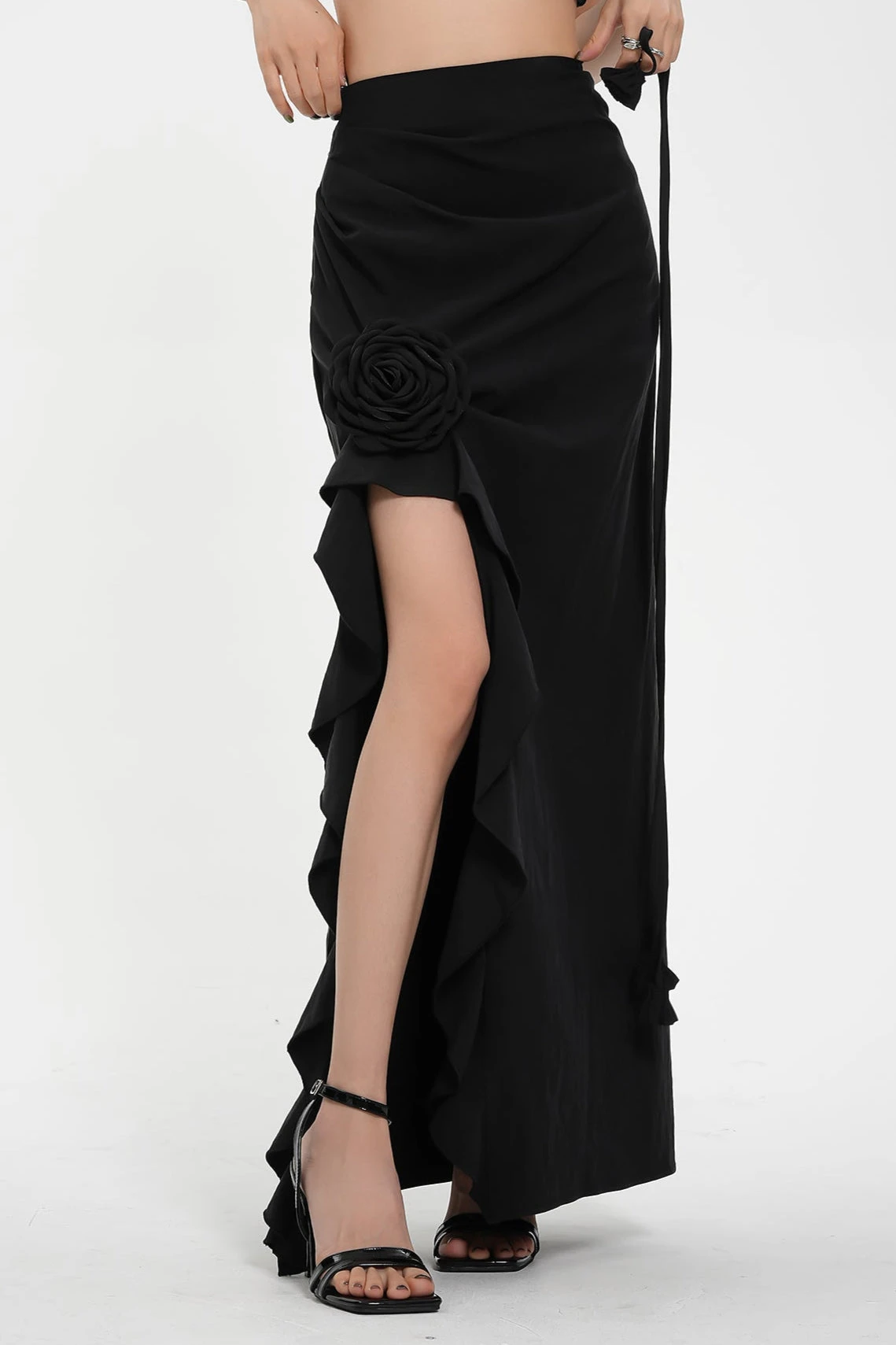Made from a smooth, structured blend with a matte finish, this skirt features asymmetrical draping, soft pleating, and a three-dimensional flower accent at the slit. The cascading ruffle trim down the leg draws the eye while adding texture and movement.