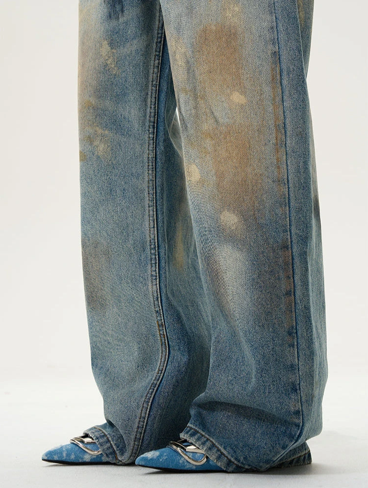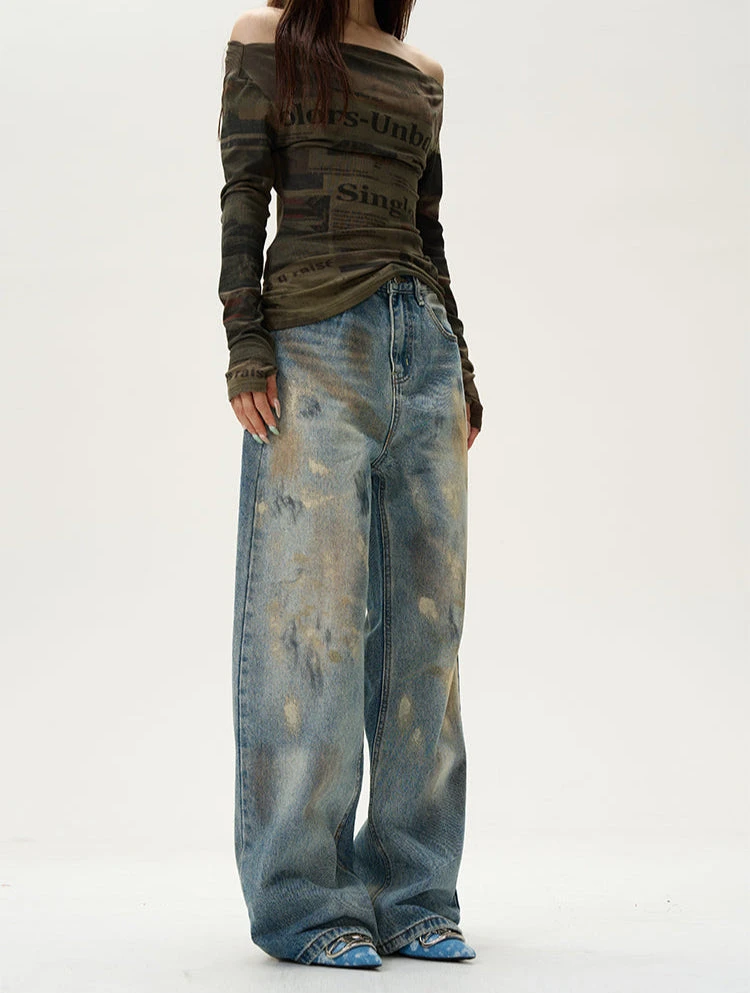 Effortlessly cool with an edge, these high-waisted wide-leg jeans bring a laid-back nonchalance to any outfit. The paint-smudge effect adds a worn-in, artistic touch, making them feel like an old favorite from the first wear.