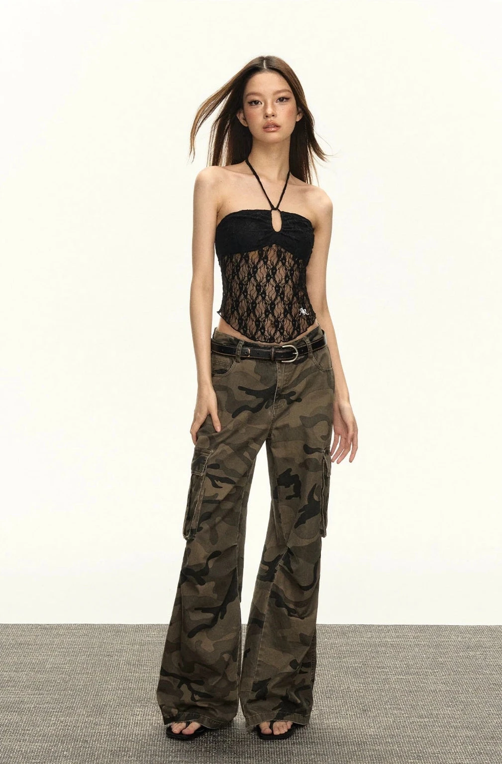 Crafted from a blend of polyamide fiber and spandex, this top offers both comfort and a flattering fit. The delicate lace overlay provides a textured, nuanced look, while the unique halter neck adds a touch of street-inspired flair. Perfect for those who appreciate a garment that marries sophistication with a bit of an edge.