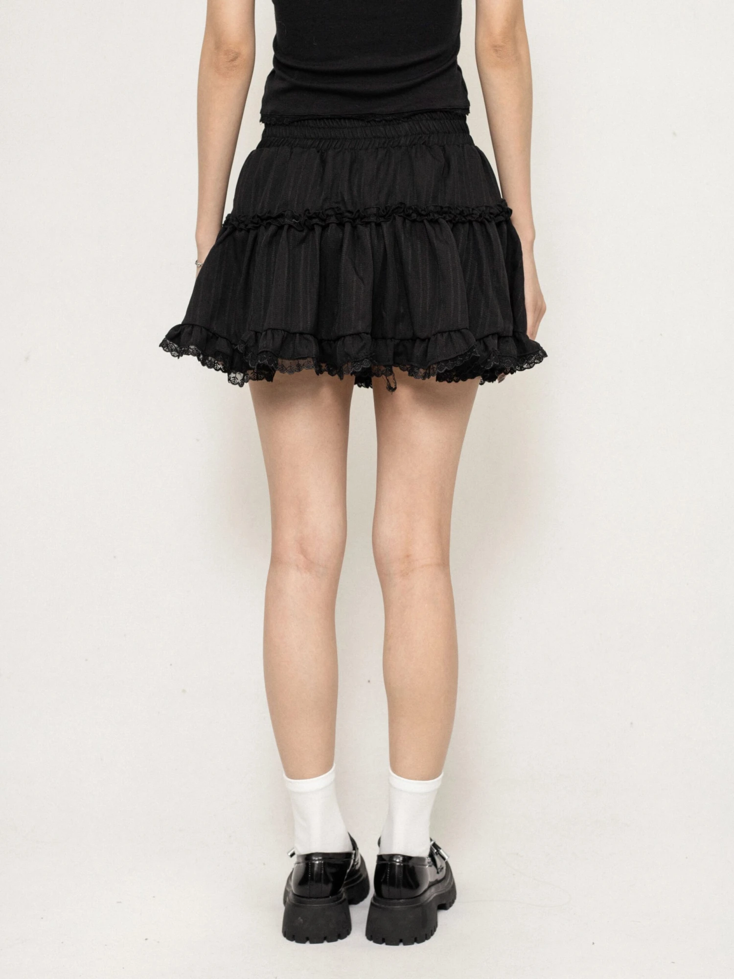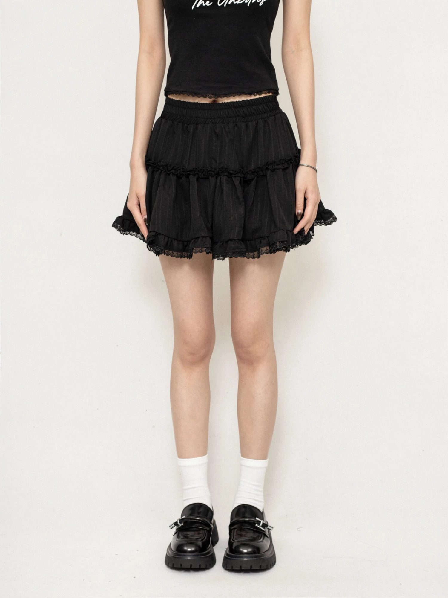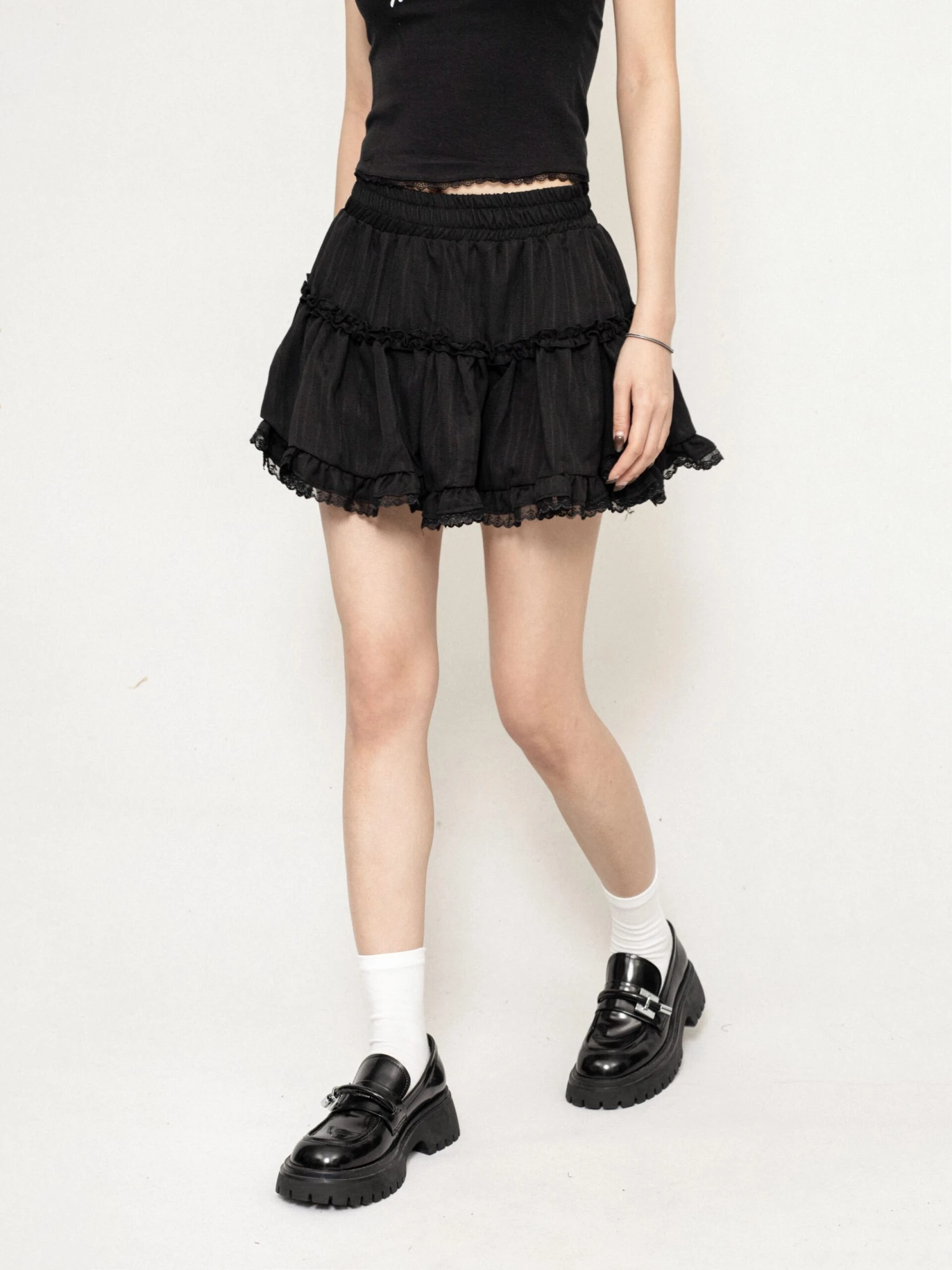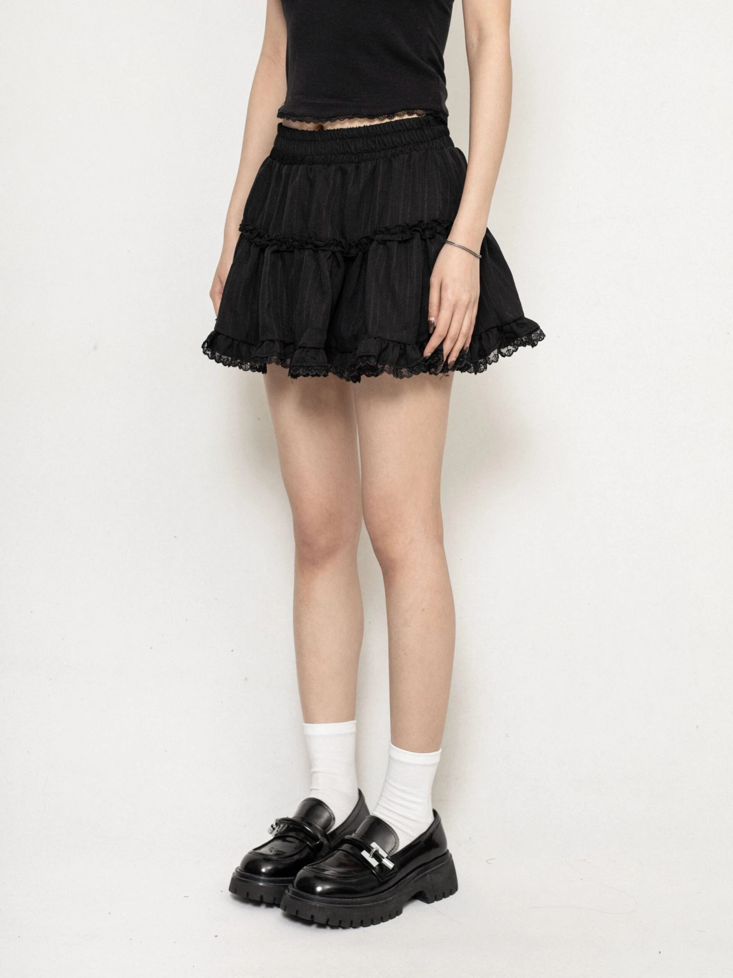 Exude confidence with every step in this moody Layered Ruffle Mini Skirt with Lace Trim, where edgy meets delicacy in perfect harmony.