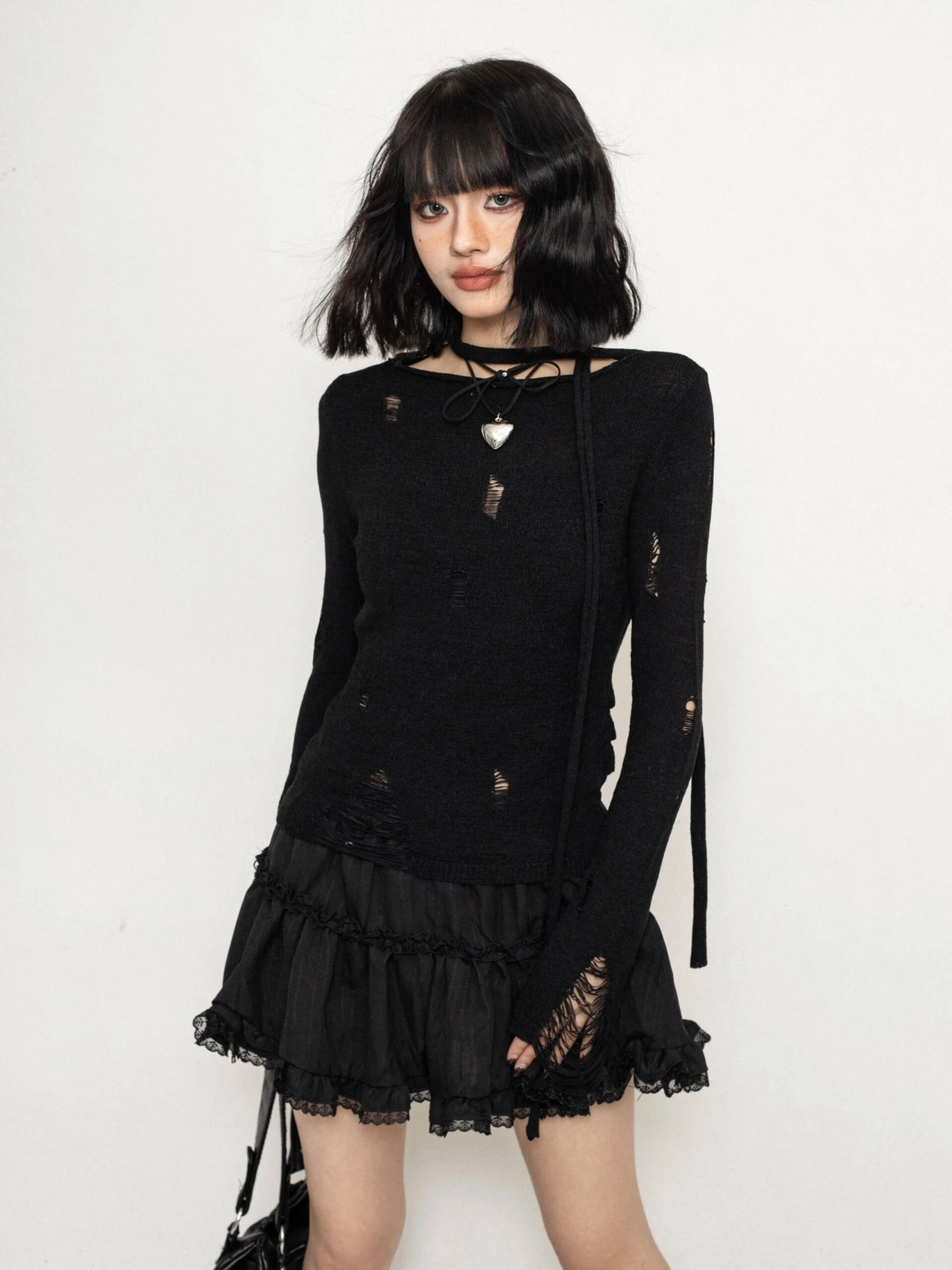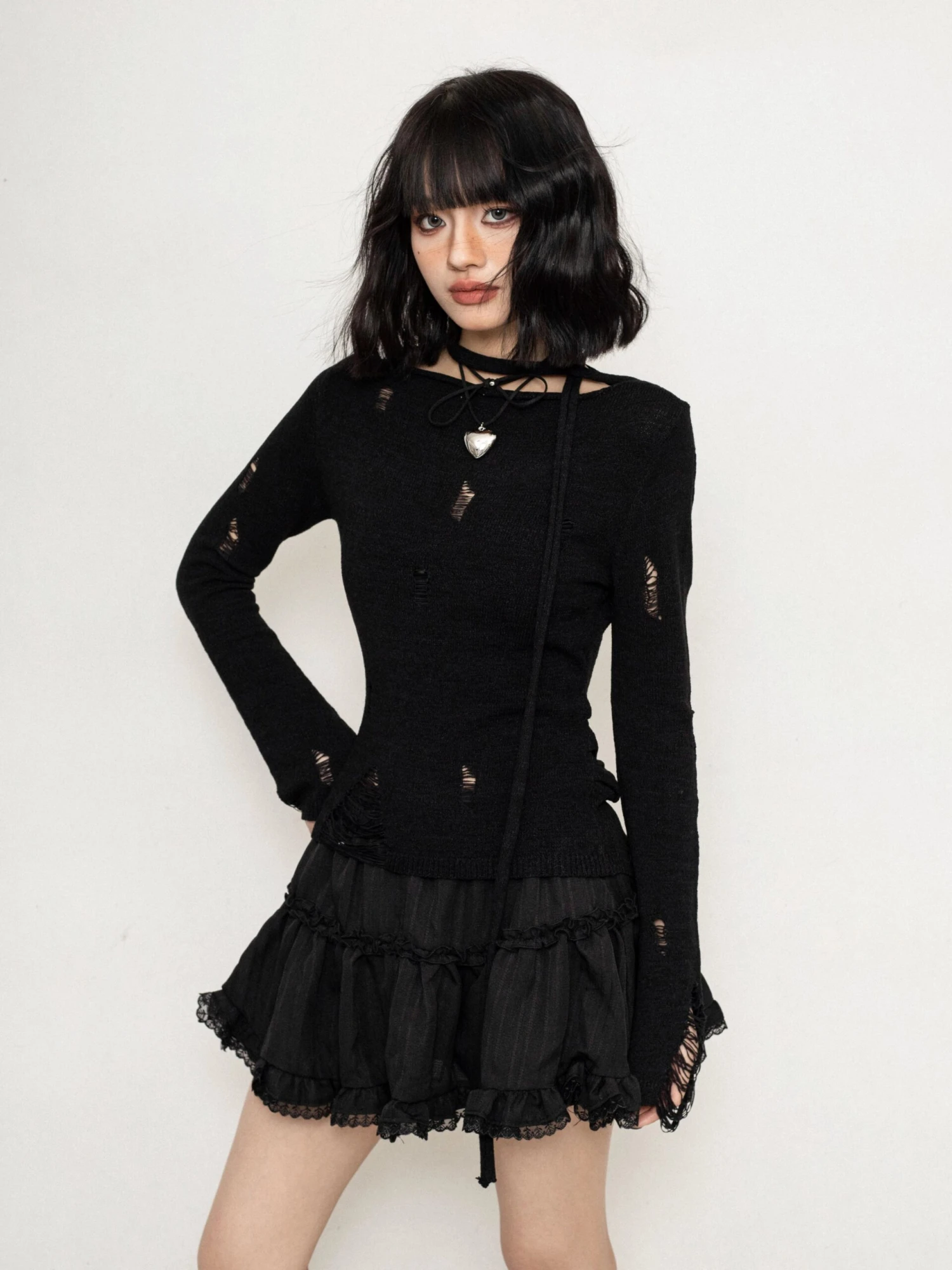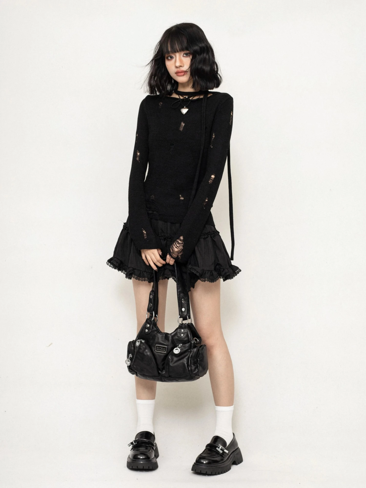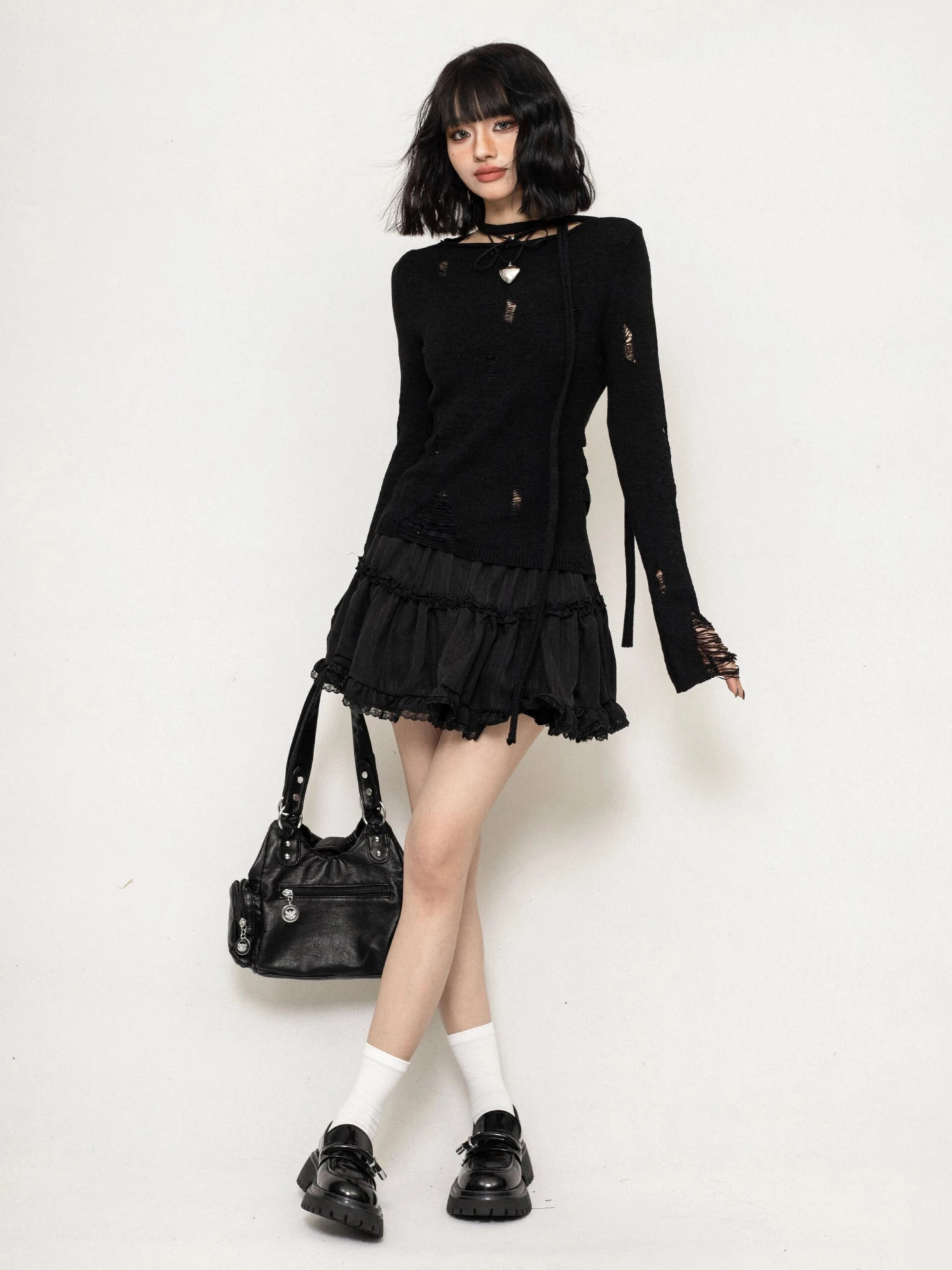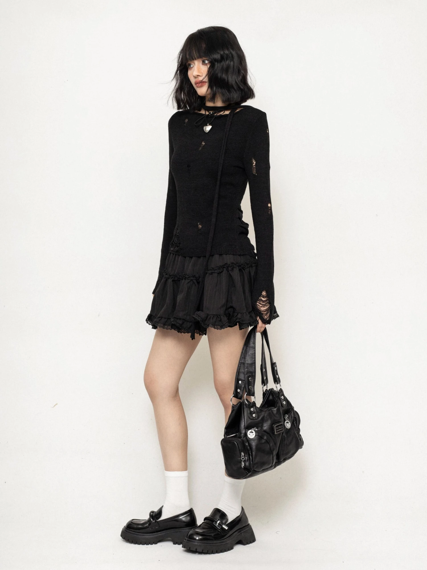 Exude confidence with every step in this moody Layered Ruffle Mini Skirt with Lace Trim, where edgy meets delicacy in perfect harmony.