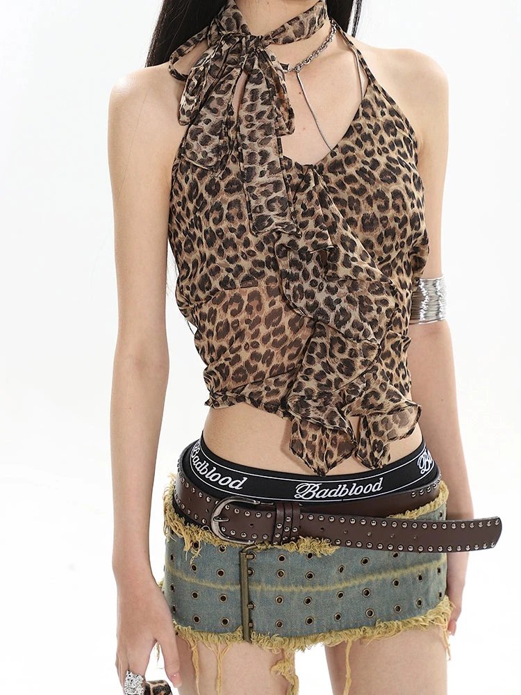 Unleash your wild side with this Leopard Print Halter Neck Tie-Back Crop Cami Top, a perfect blend of edgy design and effortless charm.