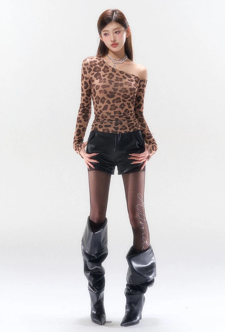 Unleash your wild side with our Leopard Print One-Shoulder Long Sleeve Top, the perfect blend of edgy allure and sophisticated style.