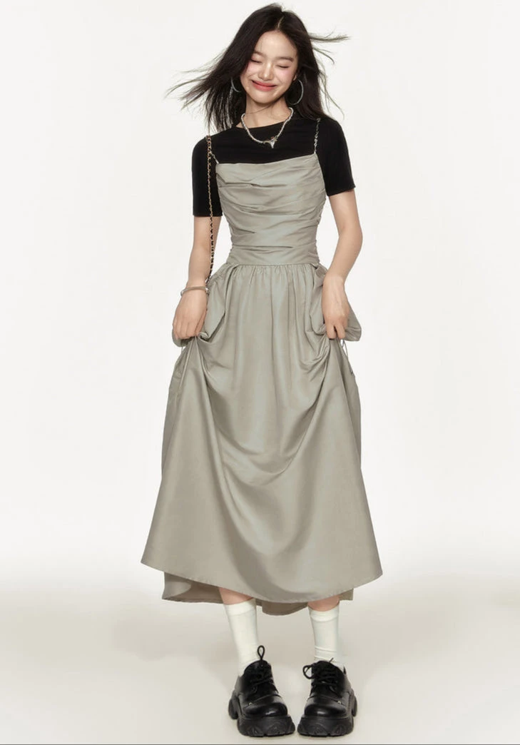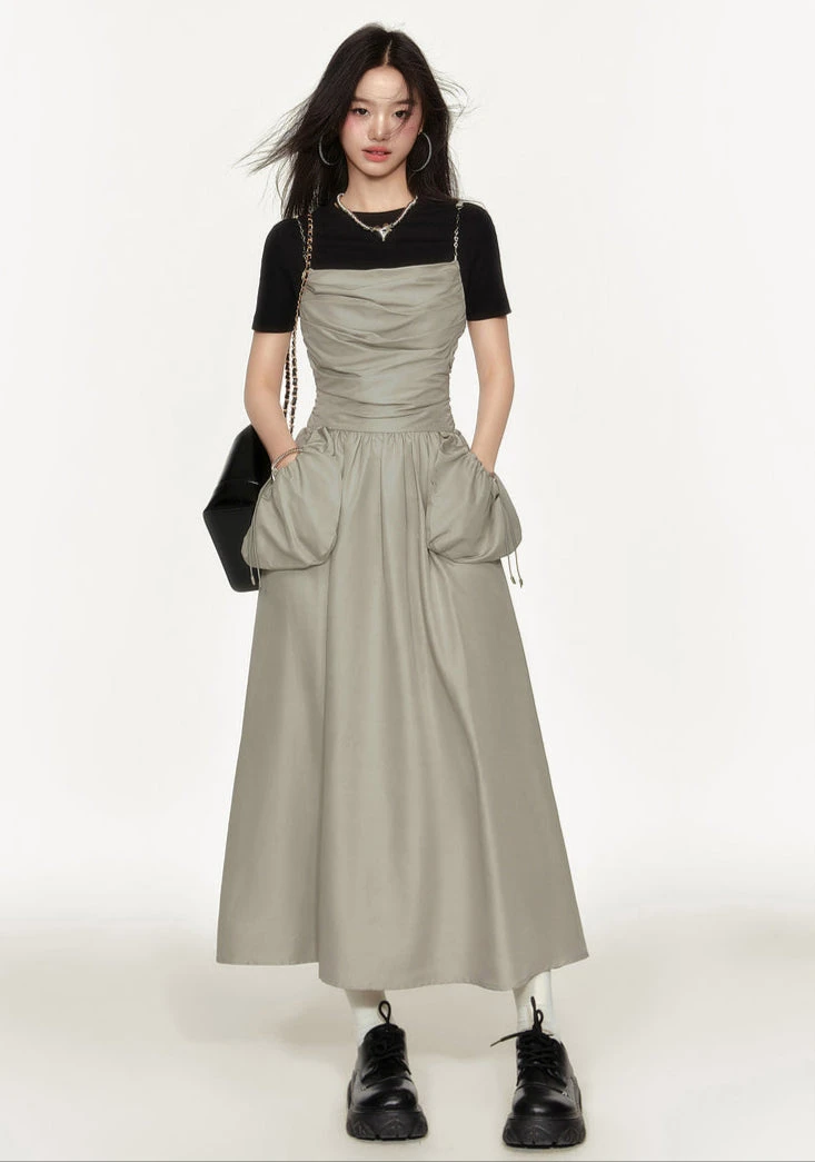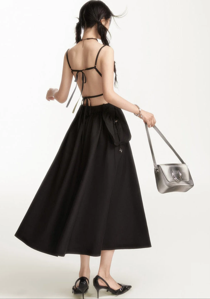 An effortless balance of edge and elegance, this backless midi dress delivers attitude without trying too hard. The ruched bodice and delicate link chain straps create sharp contrast against the fluid drape of the A-line skirt, giving it a structured yet relaxed feel.