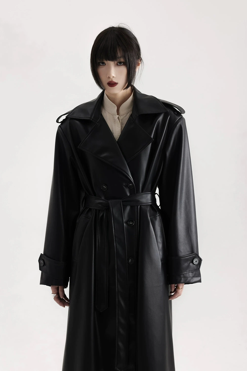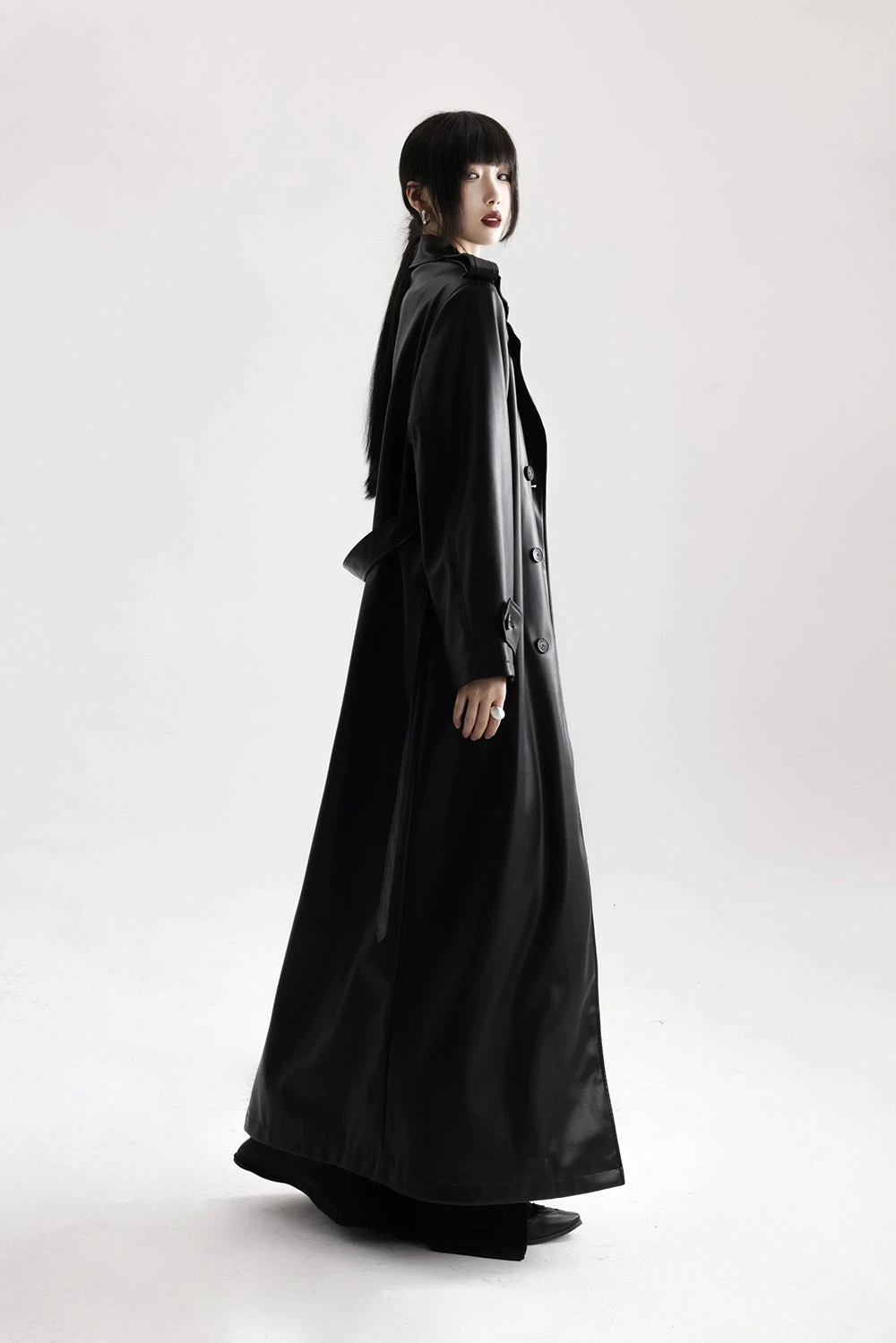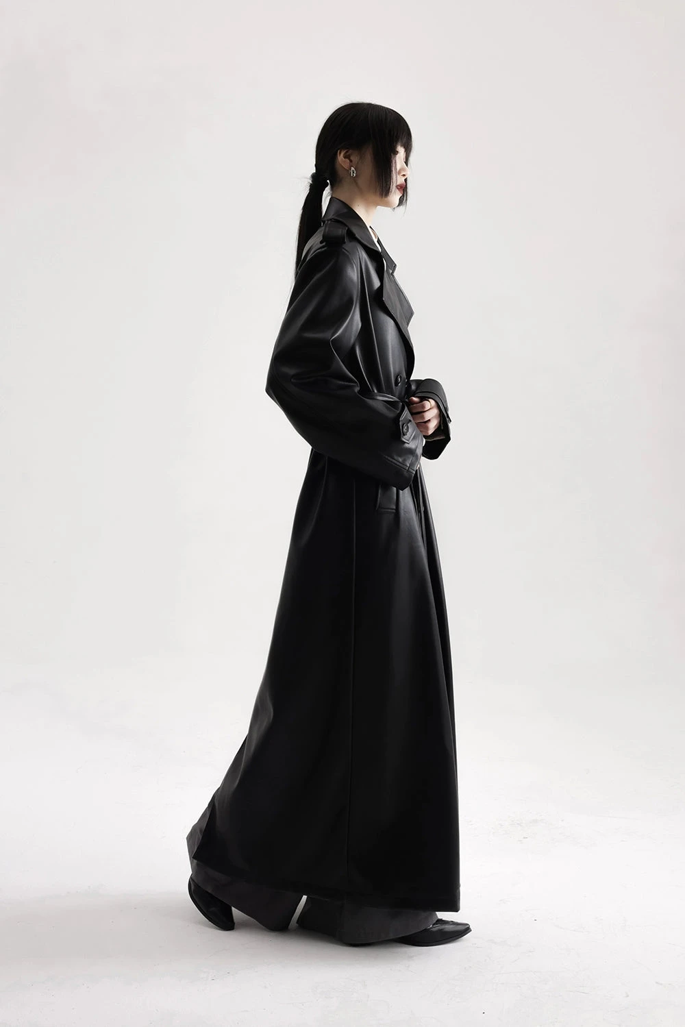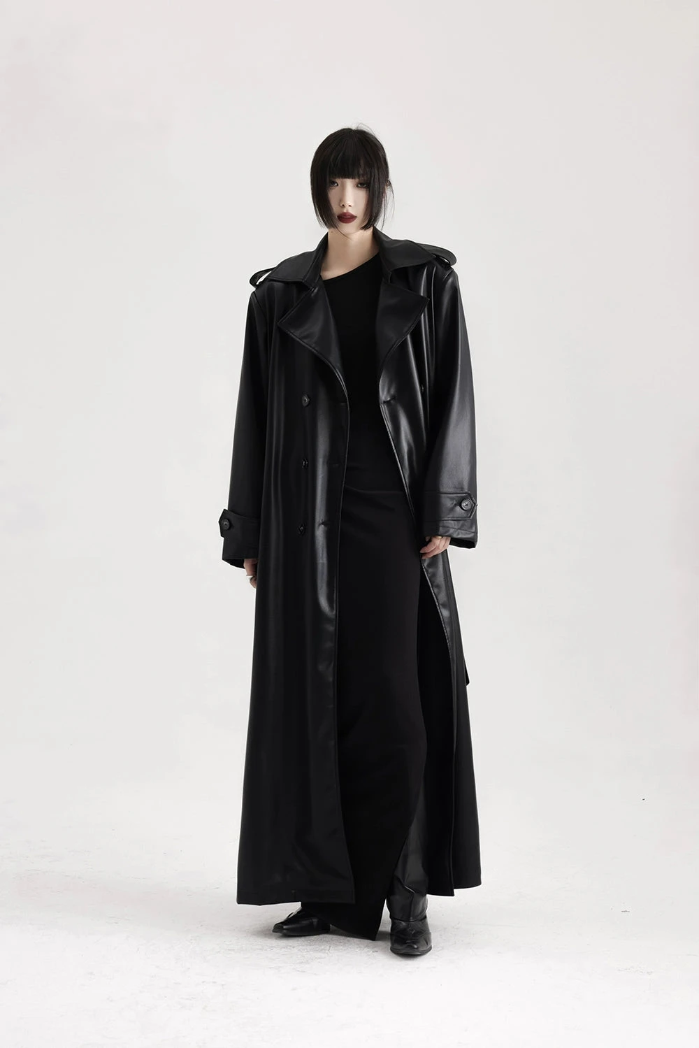 Sharp lines and a long silhouette set this faux leather trench apart, giving it presence without trying too hard.