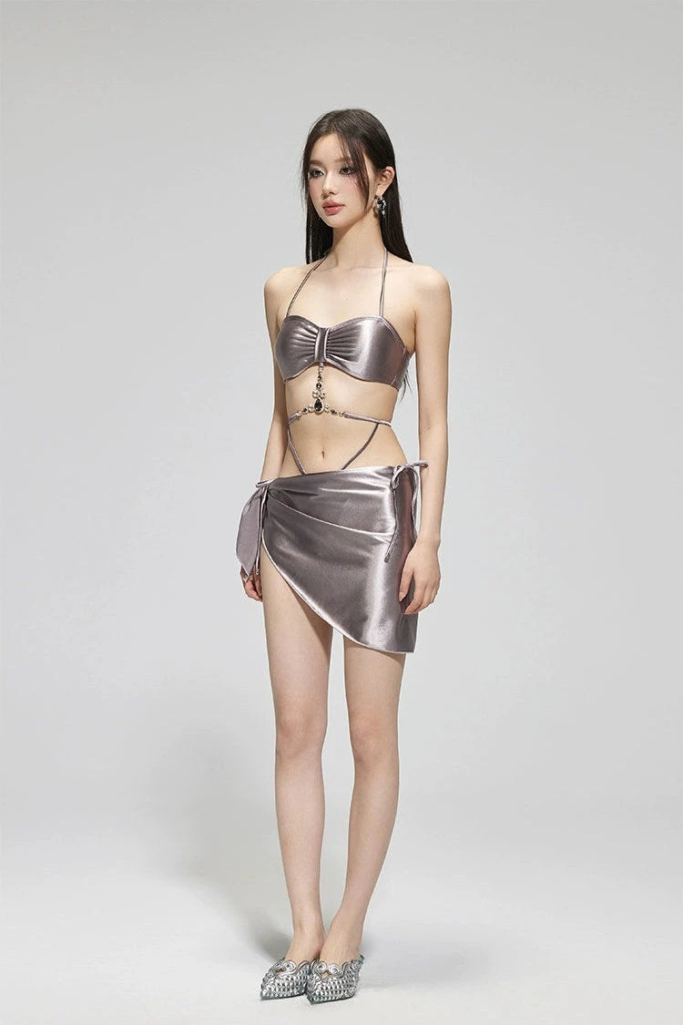Accentuate your summer look with this opulent set, adaptable for pool parties or a chic getaway. Its gleaming fabric and jewel embellishments bring a sense of nonchalant sophistication to your swimwear collection, making it essential for the discerning and style-savvy individual.