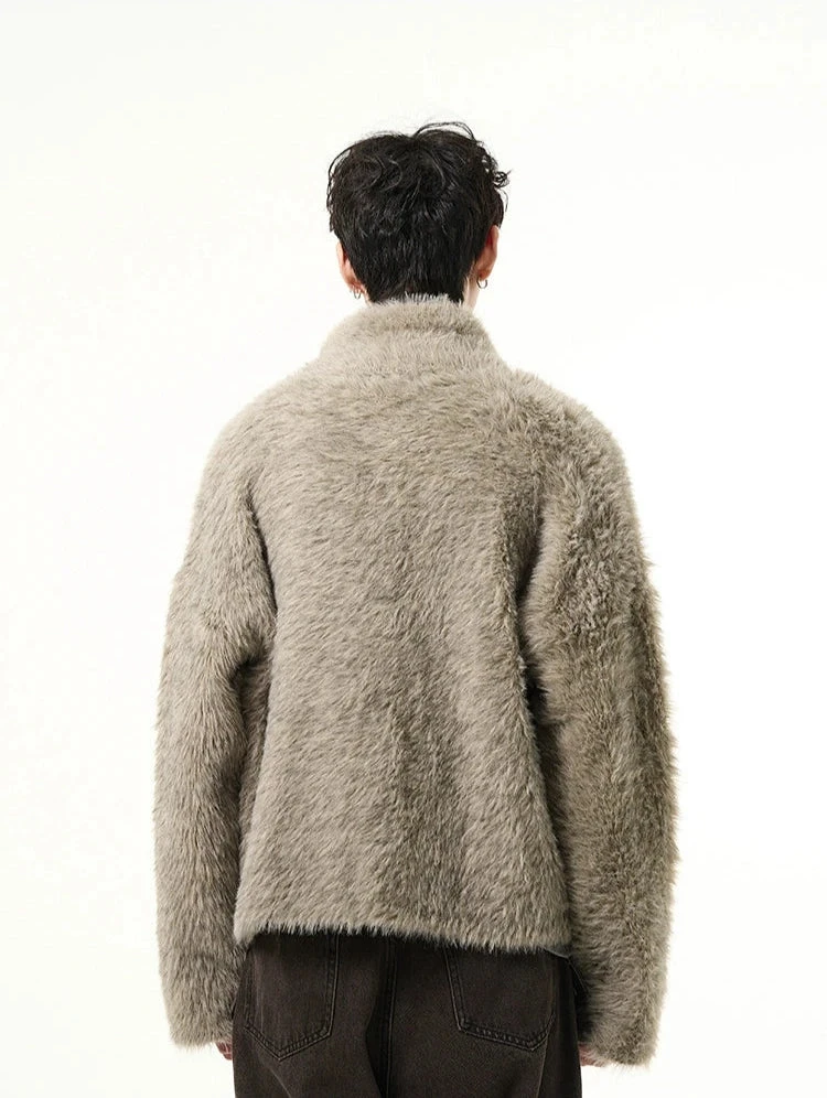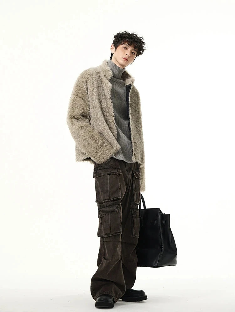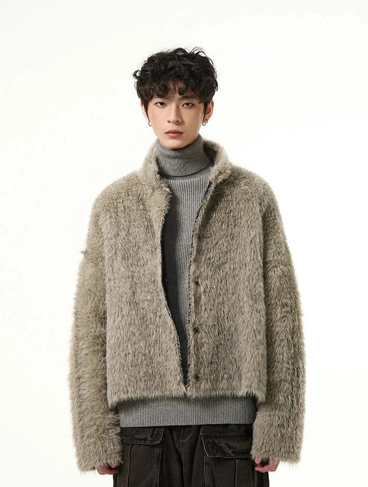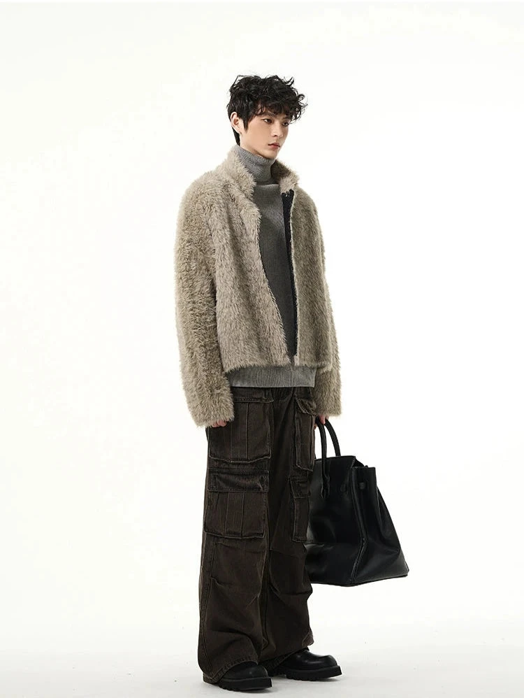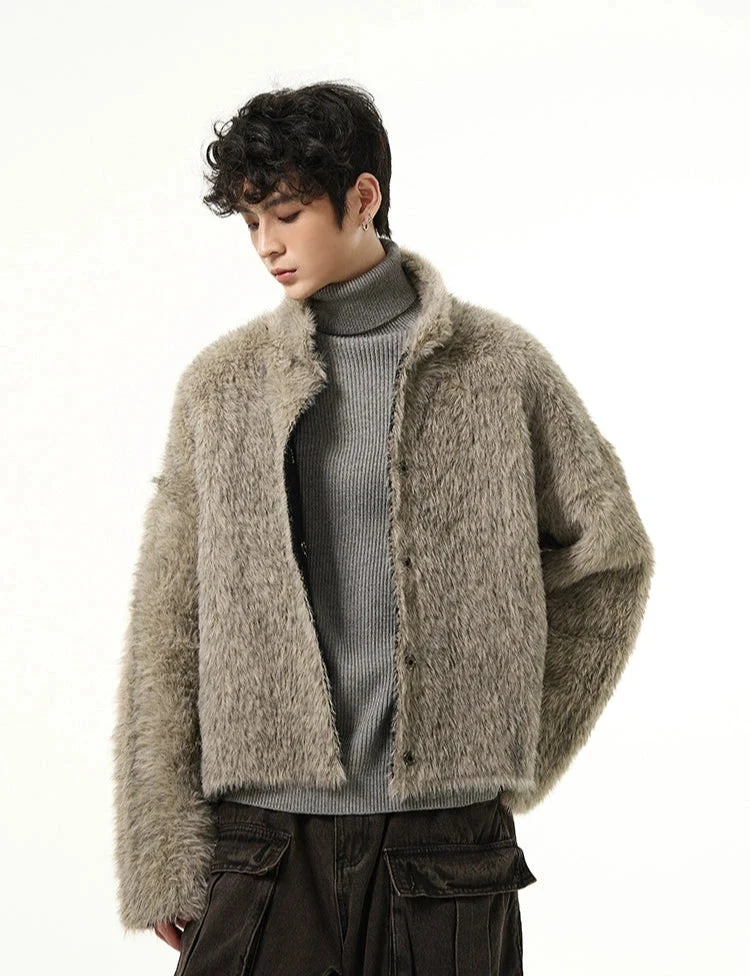 Embrace the fusion of luxury and streetwear with our Mid-Crop Faux Fur Stand Collar Zip Jacket, tailored for the modern man.