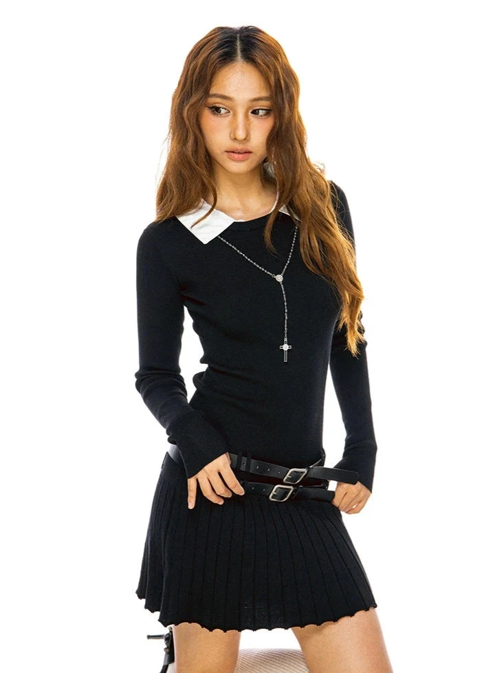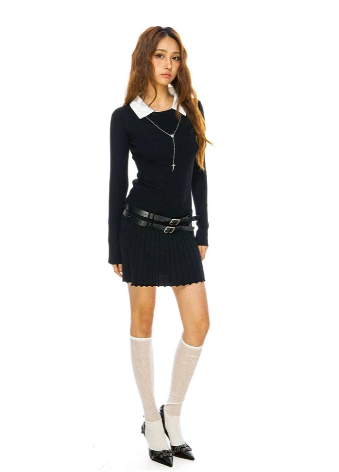 Effortlessly blending sophistication with a touch of whimsy, the Mock Two Piece Long Sleeve Pleated Mini Dress is the epitome of modern-day chic.