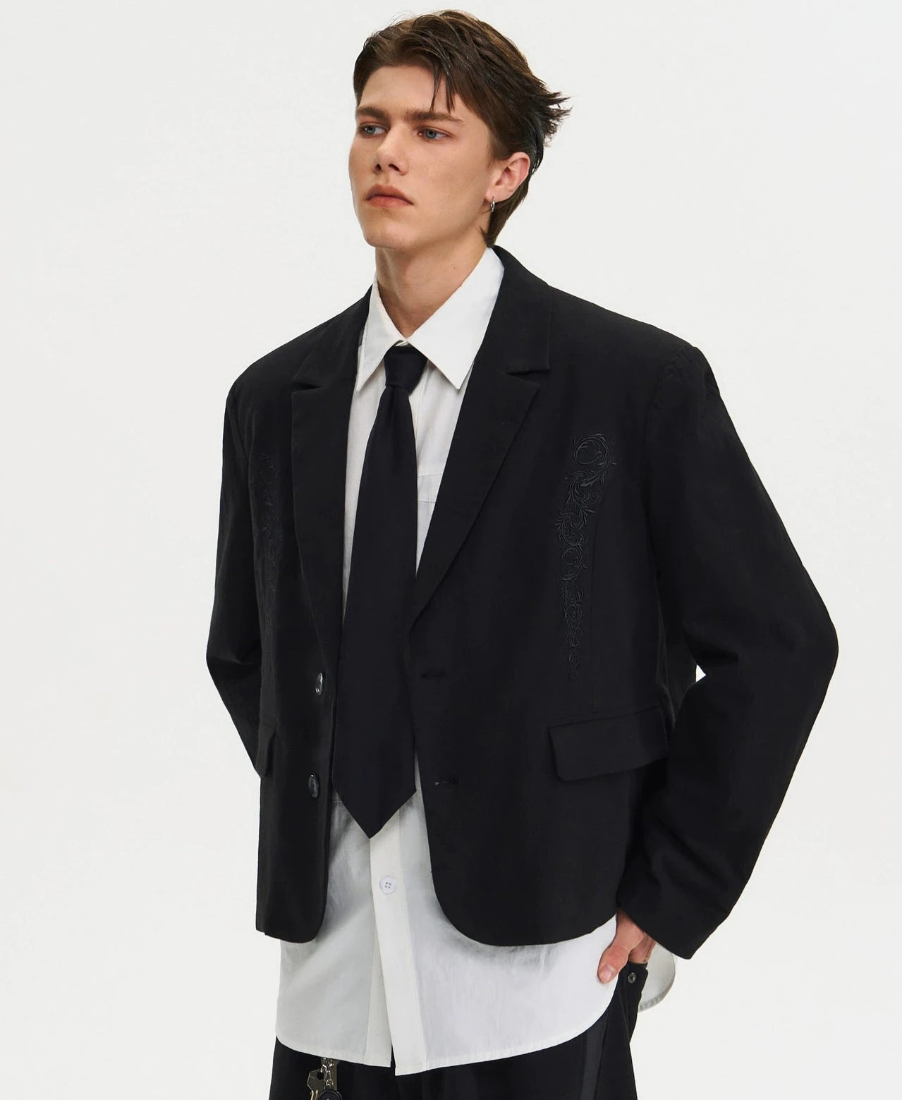 Design details: Embroidered front panels, notched lapel, rear mid-slit