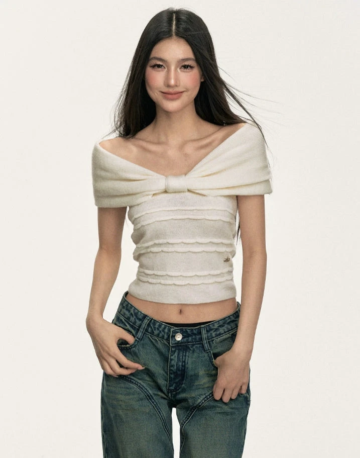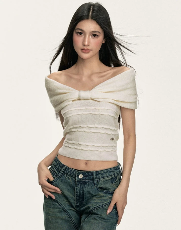 The off-shoulder bow knit top brings subtle drama and fresh texture to any wardrobe.