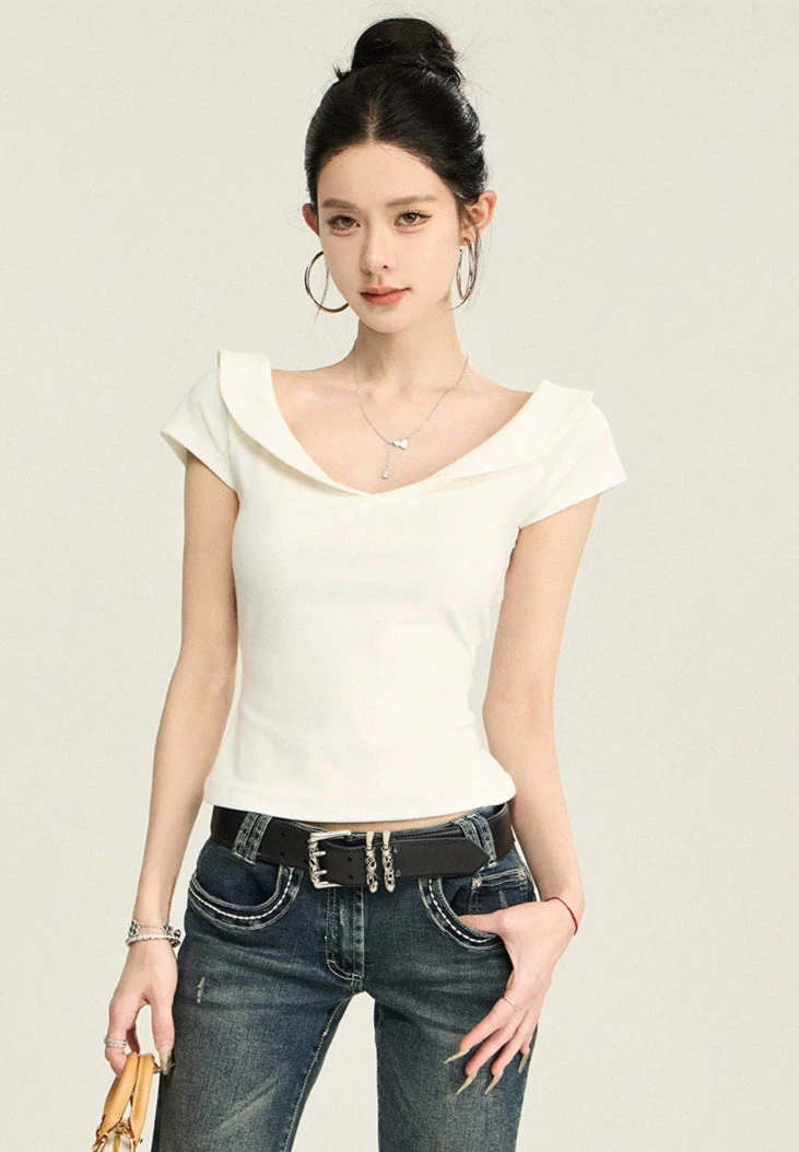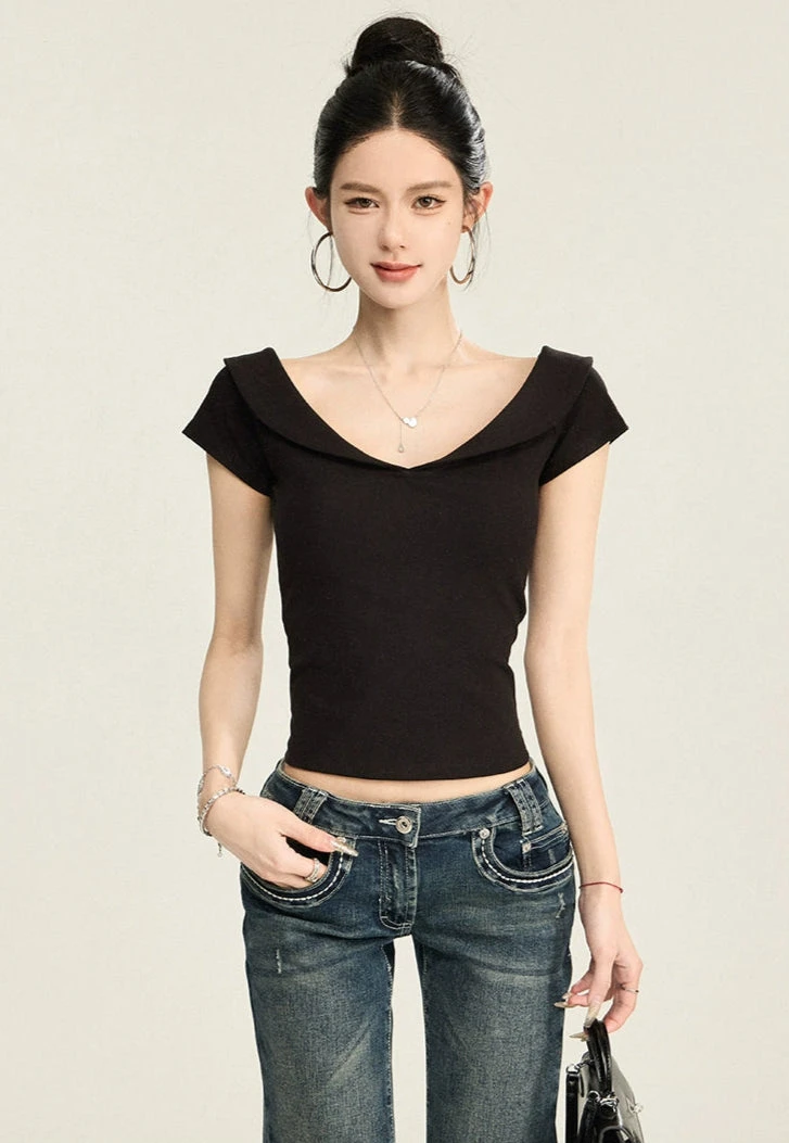 The folded collar off-shoulder neckline gives this top an edge that’s both clean and unexpected.