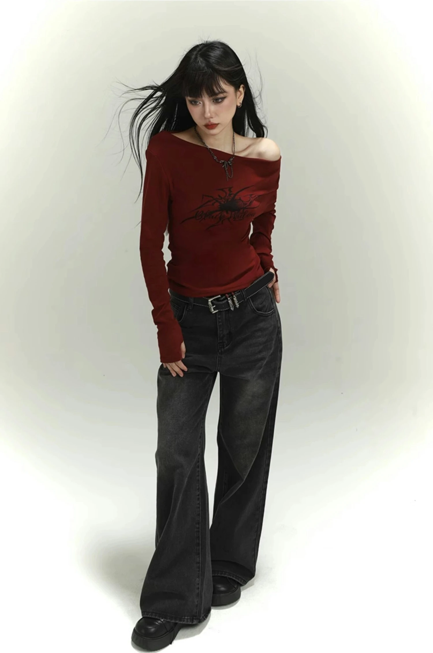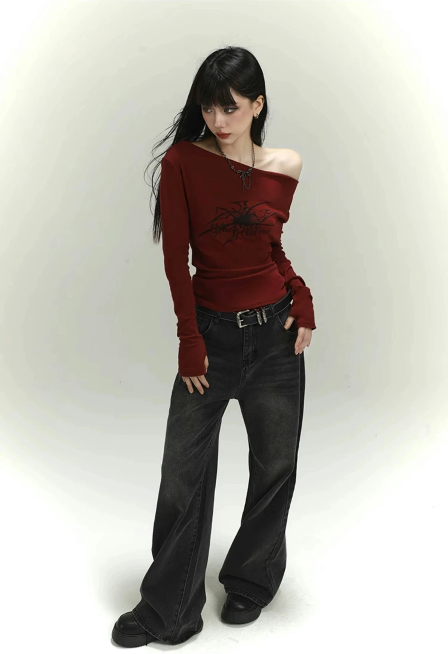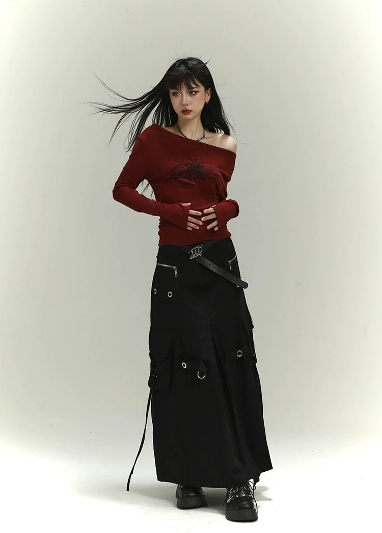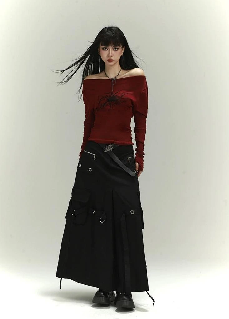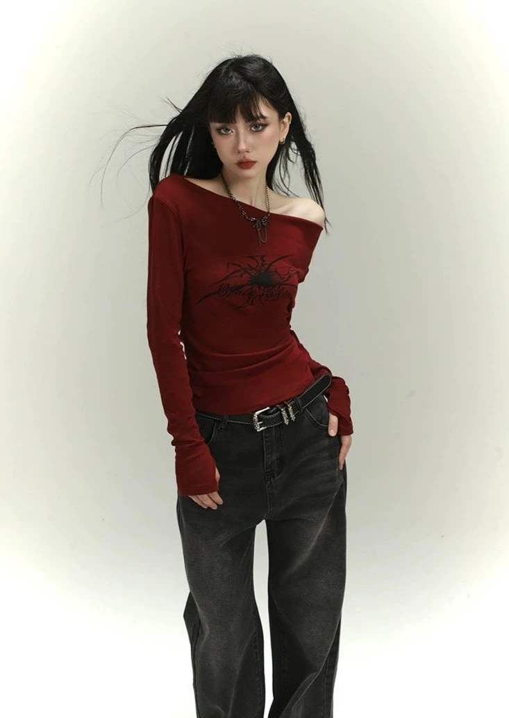 Crafted from a stretchy knit cotton fabric, this top offers both comfort and durability. Sporting a versatile wide neckline, it transforms effortlessly between a straight off-shoulder and an asymmetric look. The bold spider tattoo print adds a touch of dark aesthetic, making it the perfect piece for those who dare to stand out. This piece transcends simplicity with its edgy appeal.