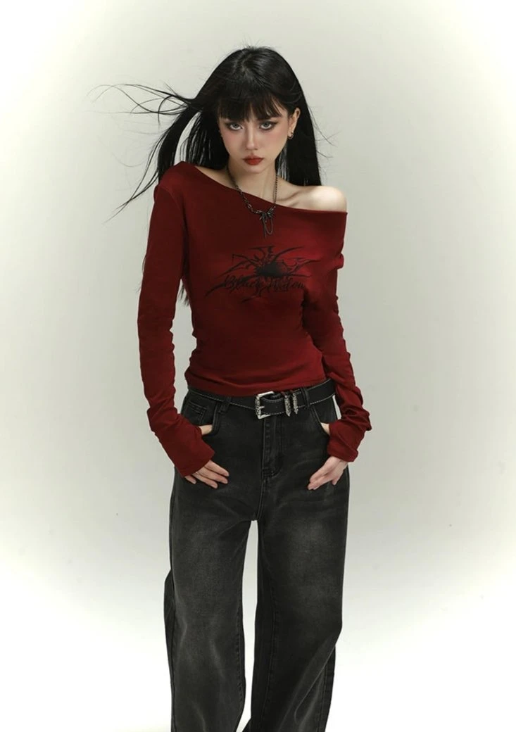 Make a statement with this Off-Shoulder Long Sleeve Tattoo Print Top, a fresh take on the classic red shirt with a rebellious twist.