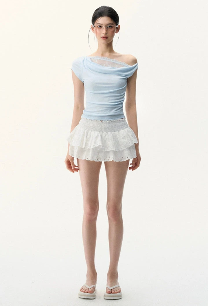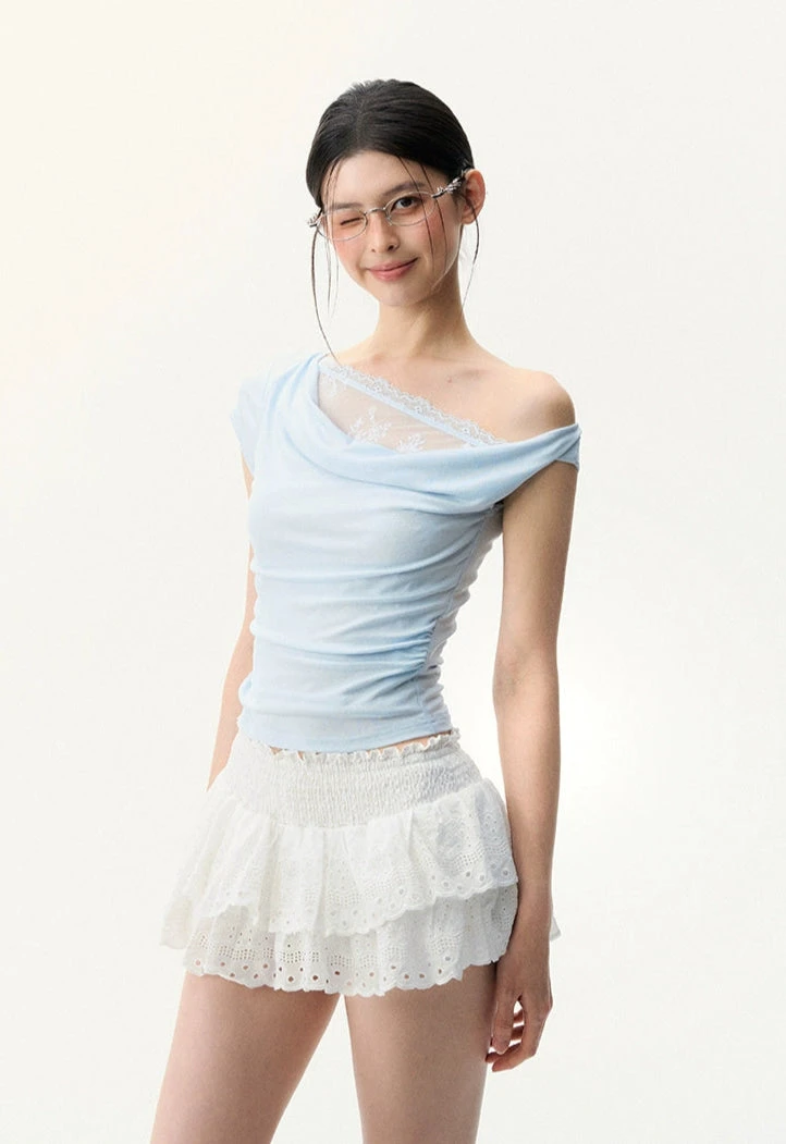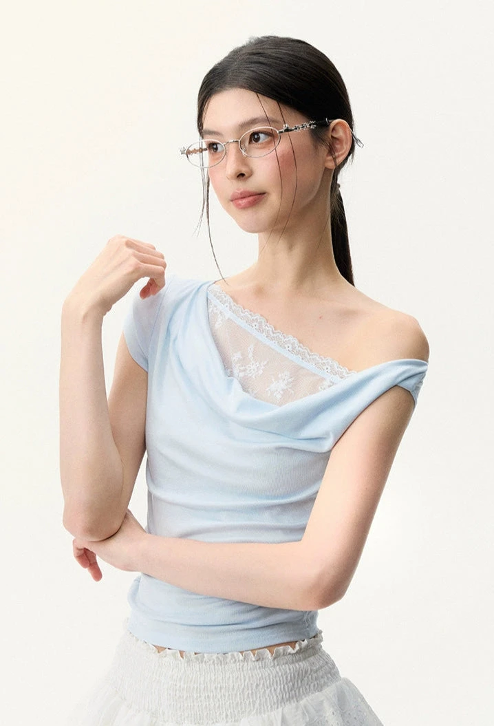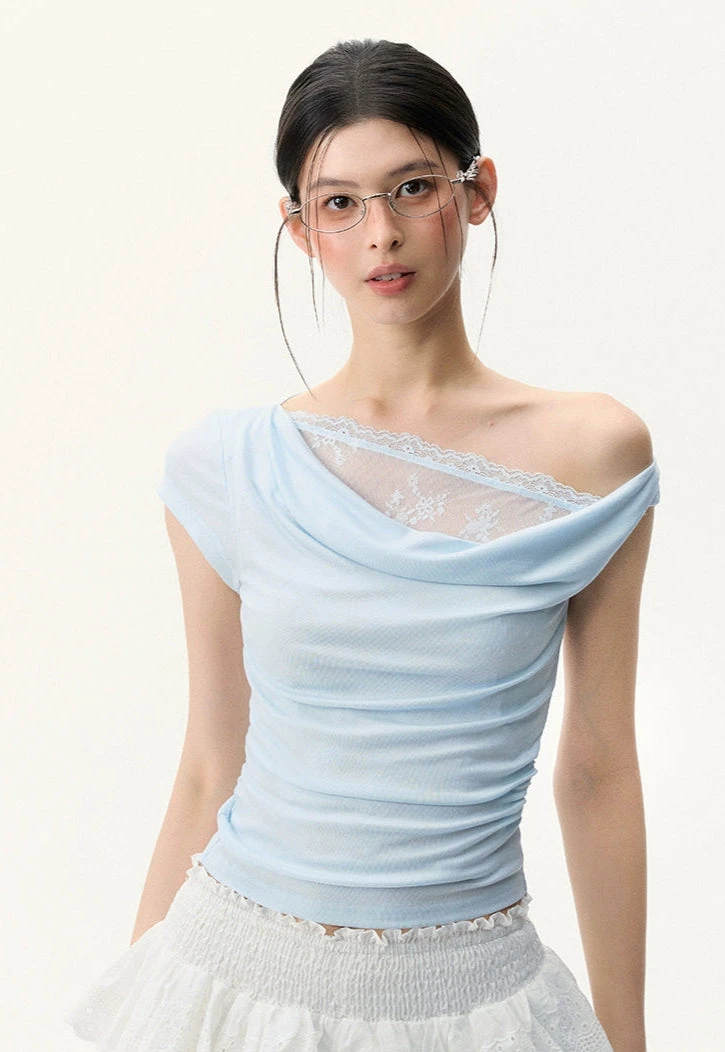 This off-shoulder asymmetric top leans into effortless elegance with a sheer lace mesh panel that adds just the right edge.