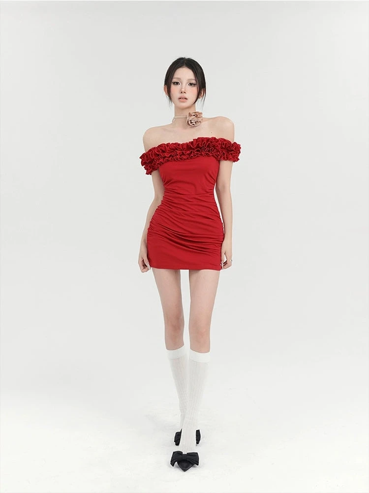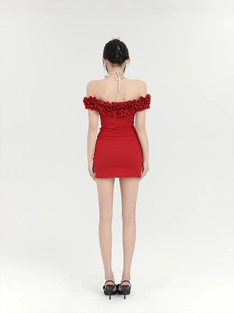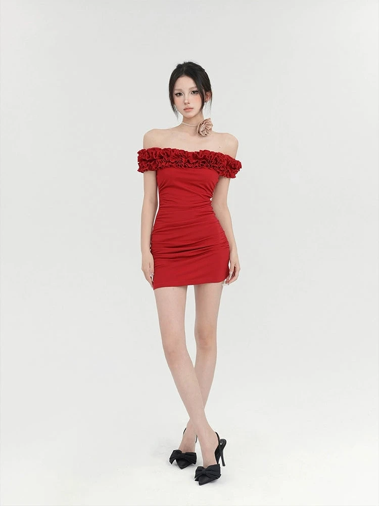 Embrace a blend of sophistication and allure with our Off-Shoulder Ruffle Trim Bodycon Mini Dress, tailored to accentuate your silhouette.