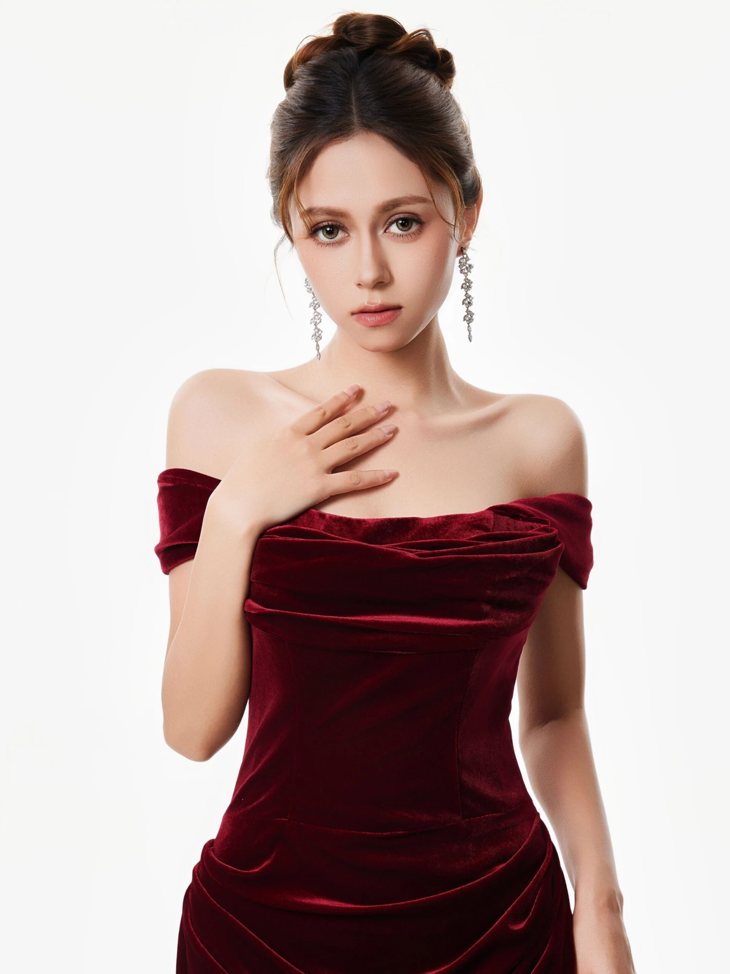 Crafted from a rich, smooth velvet material, the structured bodice and soft draping at the hips flatter your shape with ease. The off-shoulder cut adds a hint of drama without being over the top, while the fishtail hem gives the look quiet movement and a refined finish.