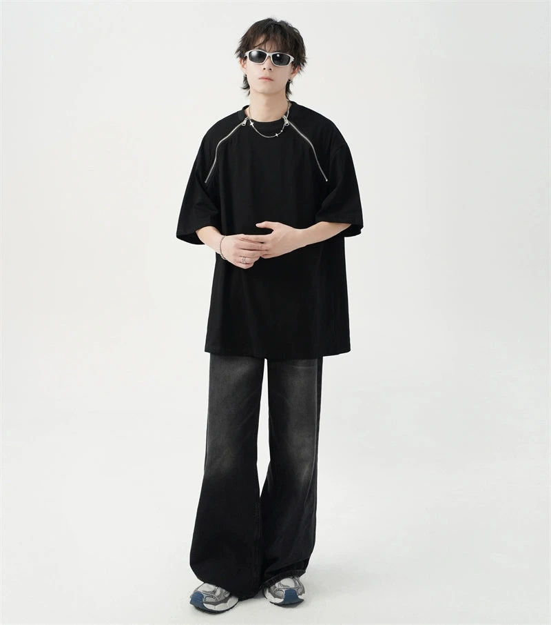 Introducing our Oversized Black T-Shirt with Zipper Shoulder Detail, a statement piece that blends comfort with cutting-edge design.