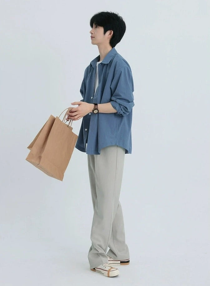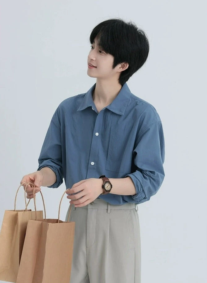 Crafted from 100% soft cotton fabric, this shirt is designed with a relaxed, oversized fit and features a unique slide-in chest pocket that adds a subtle edge. The solid blue-purple hue and conventional thickness pair well with the classic long-sleeved, button-down style, complemented by a sharp collar. This versatile piece is tailor-made for the modern wardrobe, suitable for both leisurely weekends and smart-casual workplaces.