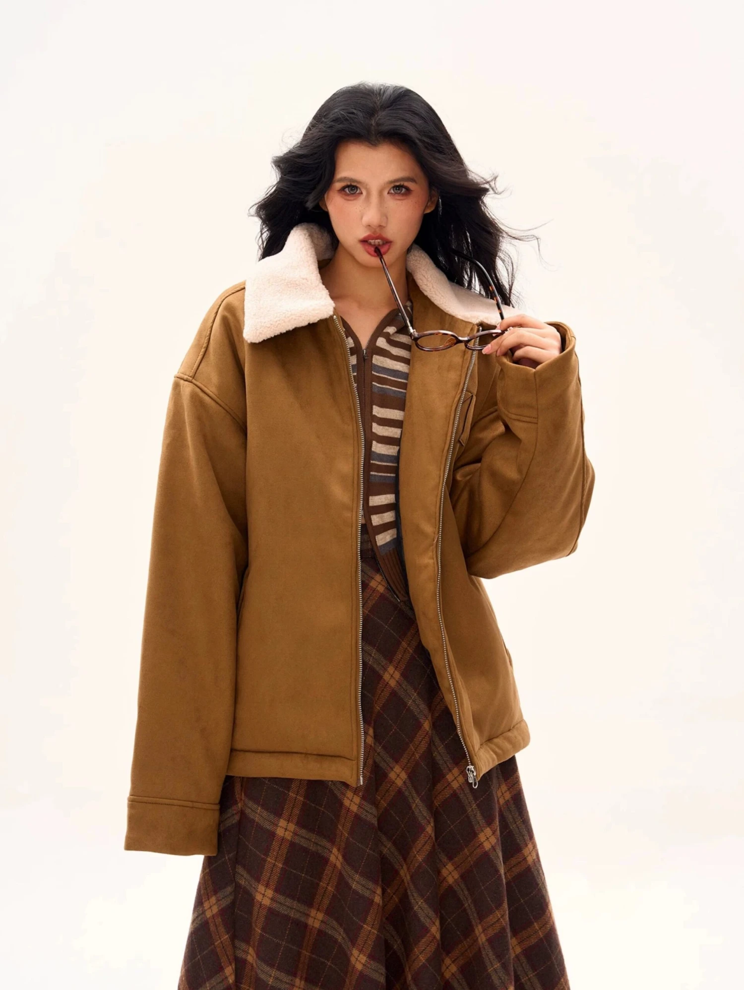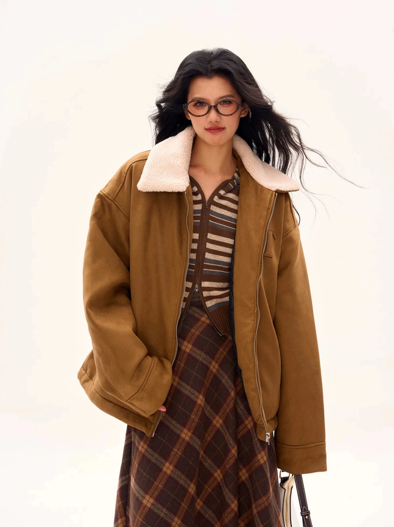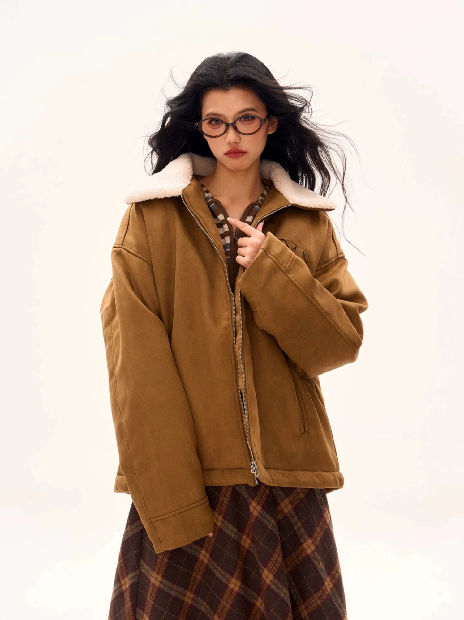 The Oversized Contrast Shearling Collar Zip Jacket combines effortless style with everyday functionality, making it a must-have staple for cooler days.