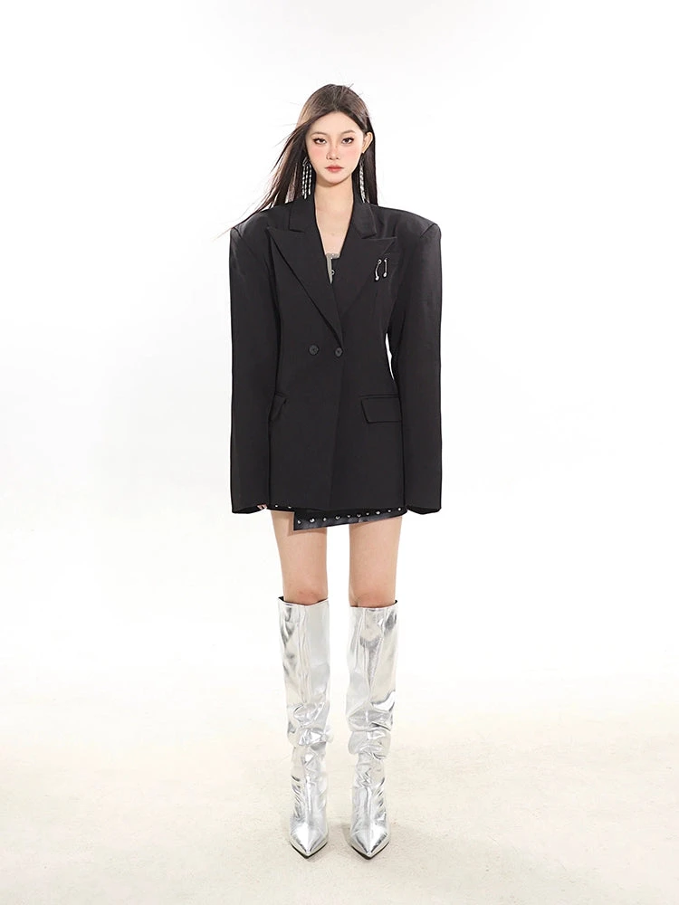 Crafted from quality fabric for a structured and warm finish, this blazer exudes sophistication with its oversized fit and suit collar. Its double-breasted design, complete with a metallic brooch, adds an edgy and nonchalant flair, perfect for making a statement at any event or office setting.