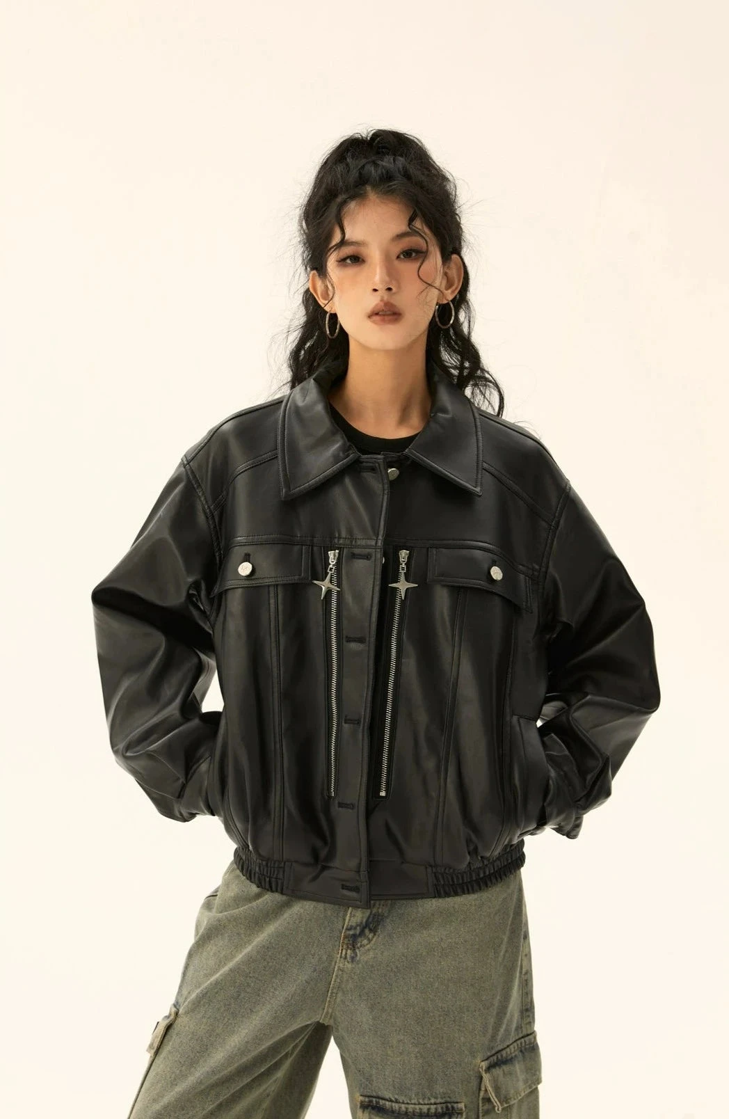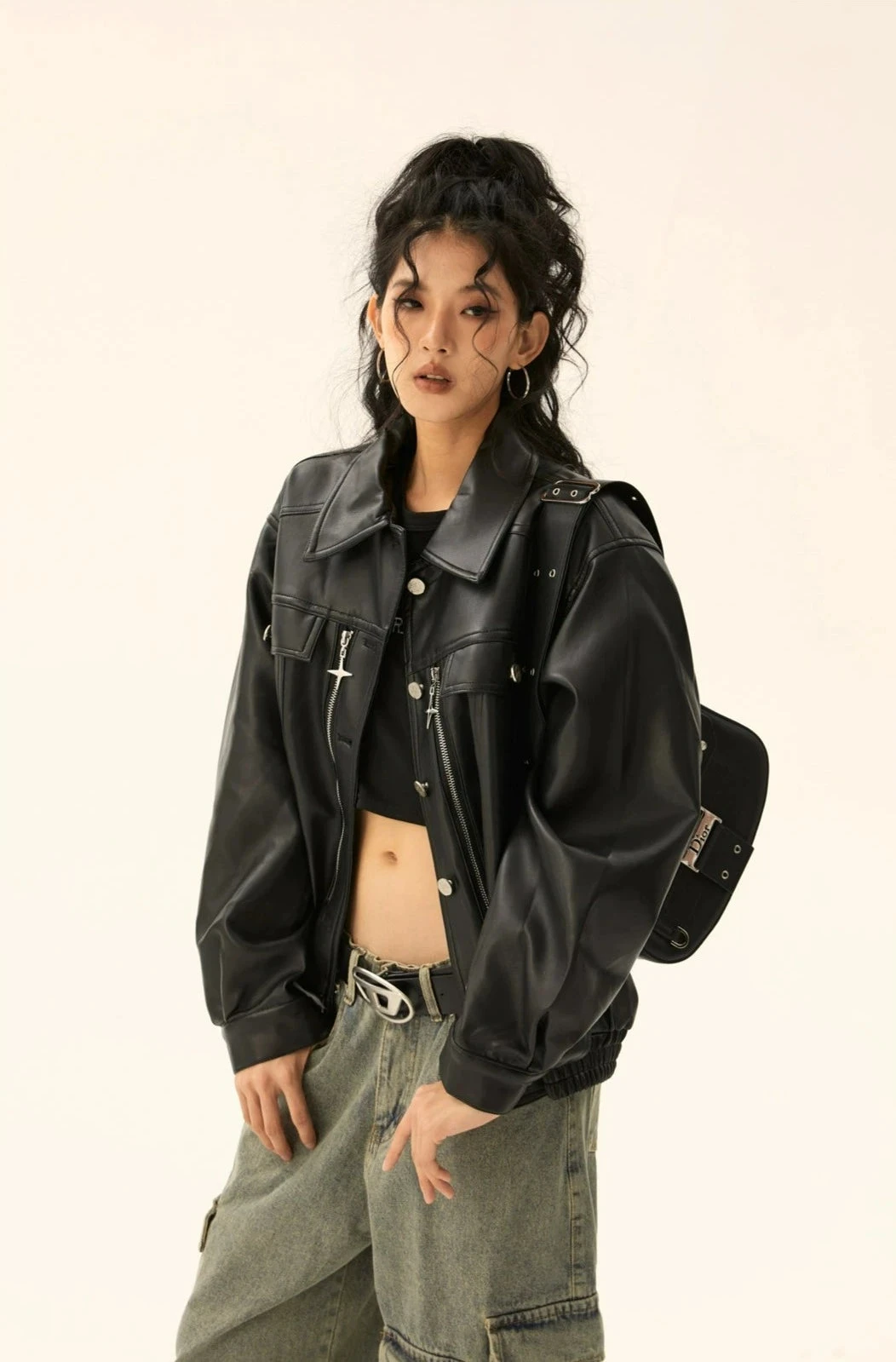 Experience the perfect blend of attitude and comfort with our Oversized Faux Leather Jacket, featuring a unique star pendant zip detail.