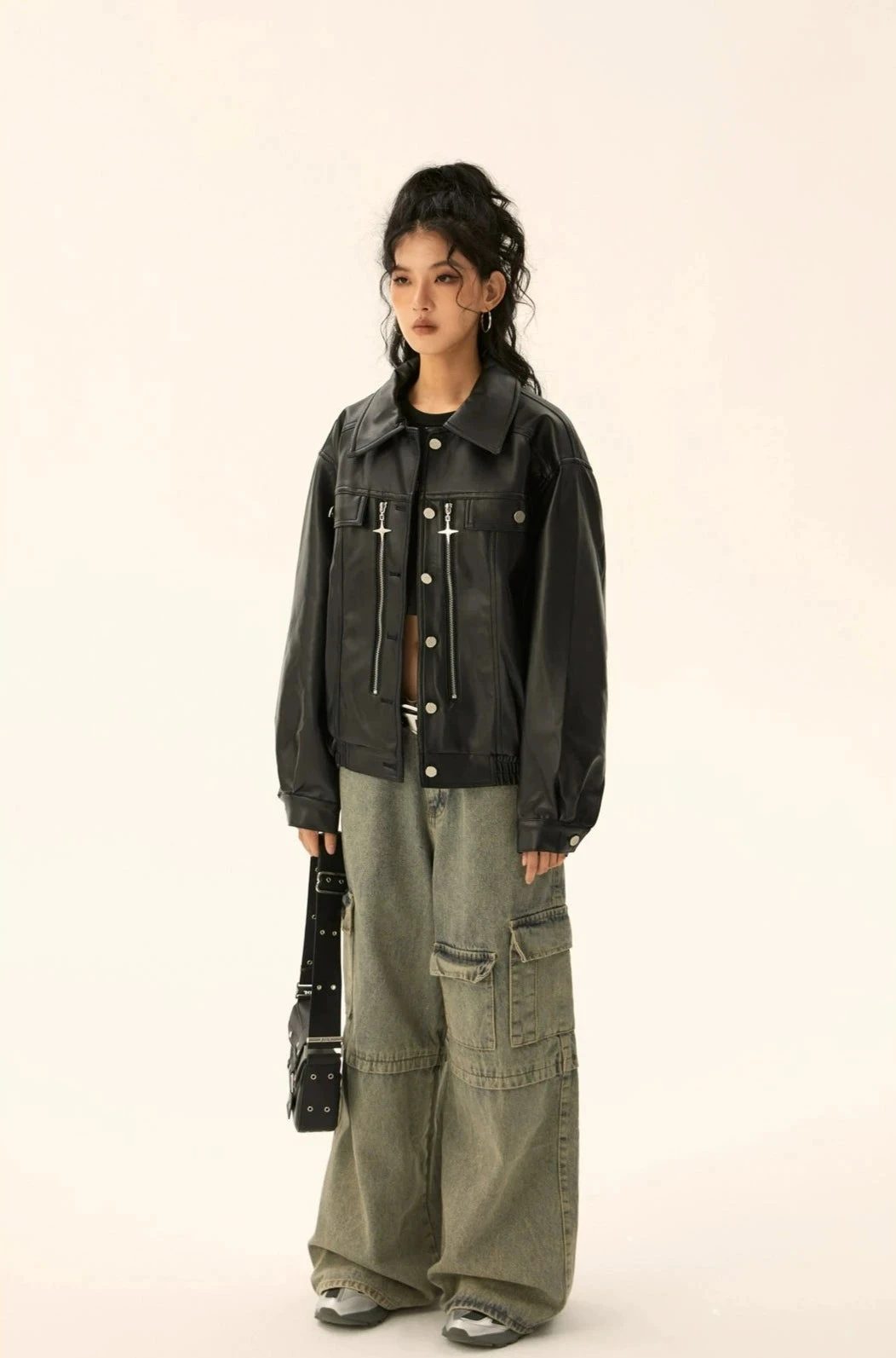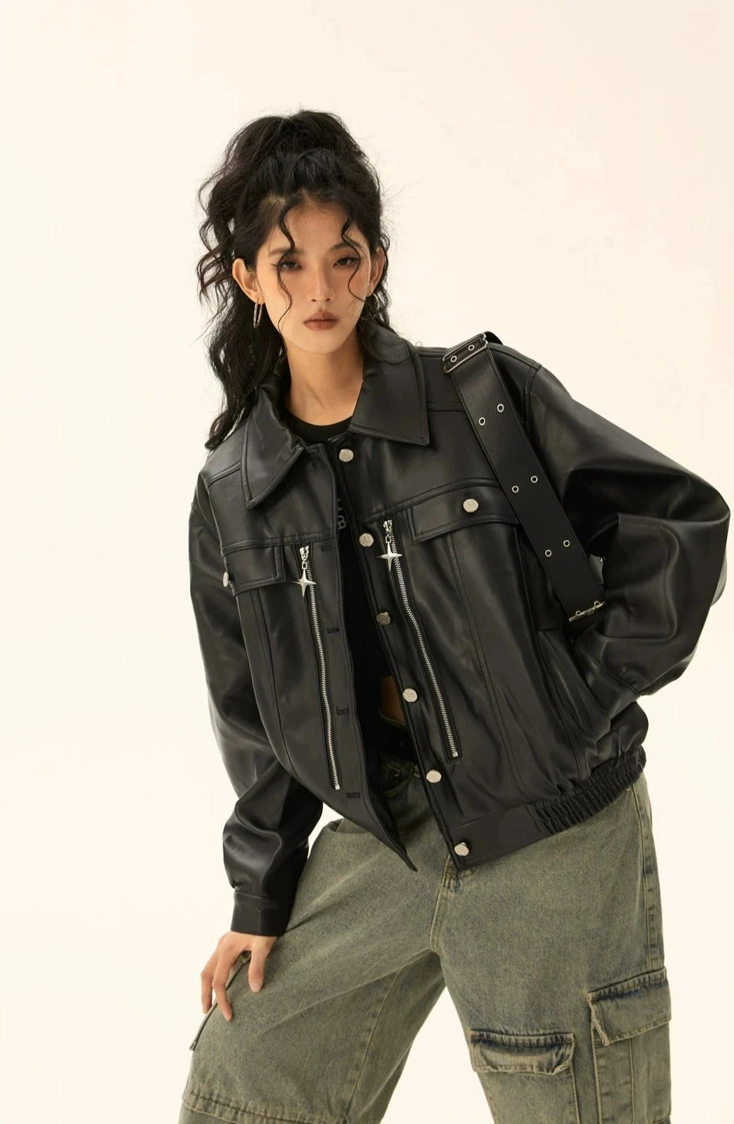 Crafted from smooth faux leather, this jacket exudes a moody vibe with its street-inspired silhouette and multiple pockets for practicality. The distinct star-shaped zippers add a playful twist to the jacket’s design, making it a standout piece in your wardrobe. With a relaxed oversized fit, it offers ample space for layering over your favorite outfits while providing a bold fashion statement.