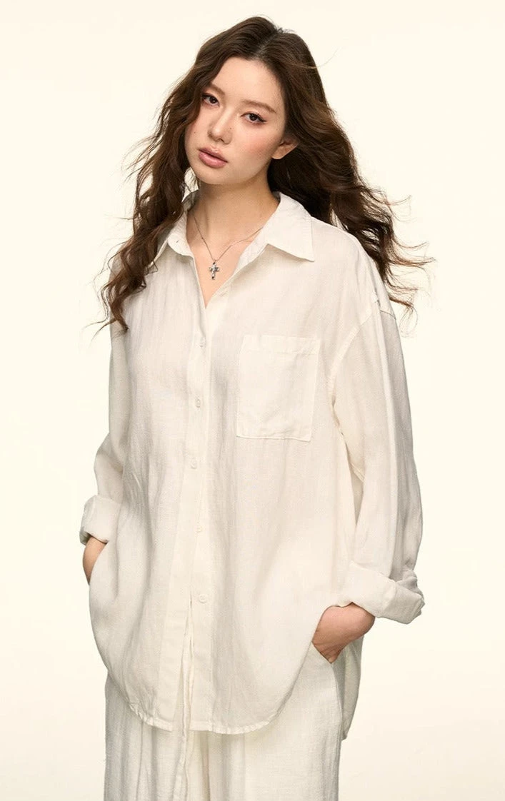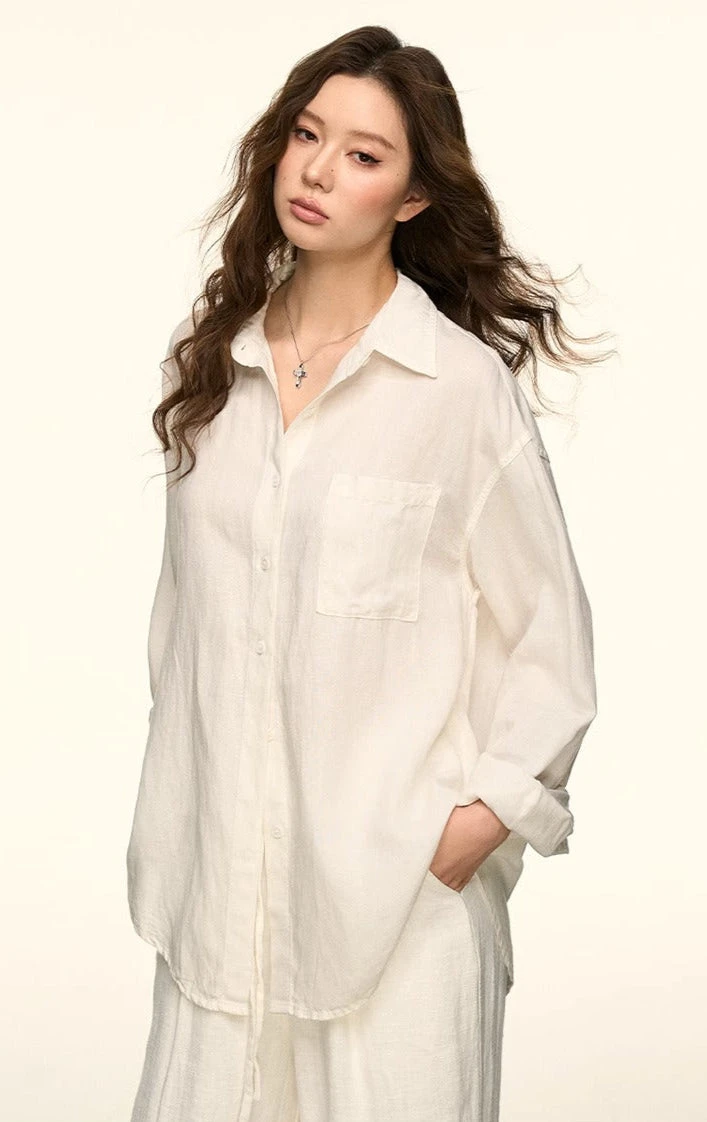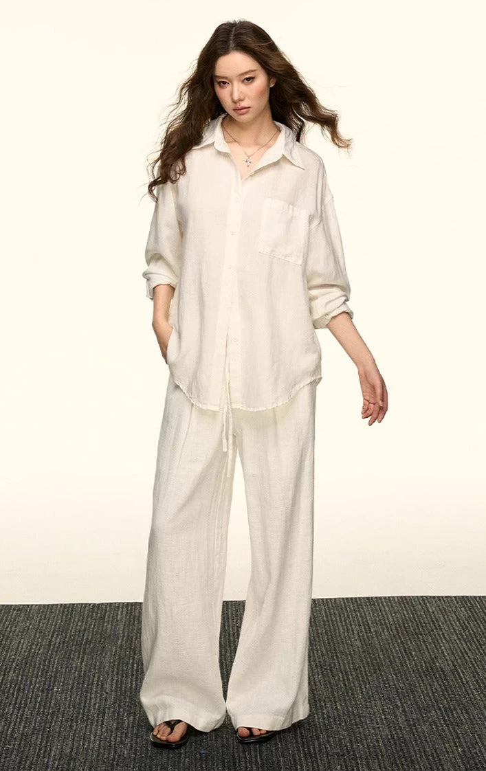 Designed for movement and ease, it’s made to carry you through daily routines or lowkey evenings out with minimal fuss and maximum comfort. The button-up shirt features a soft lapel collar, single chest pocket, and fluid drape, while the wide-leg trousers balance everything with a clean, structured fall. The lightweight blend delivers a breezy, semi-sheer finish with a subtle natural texture, giving this set its easygoing charm without compromising on style.