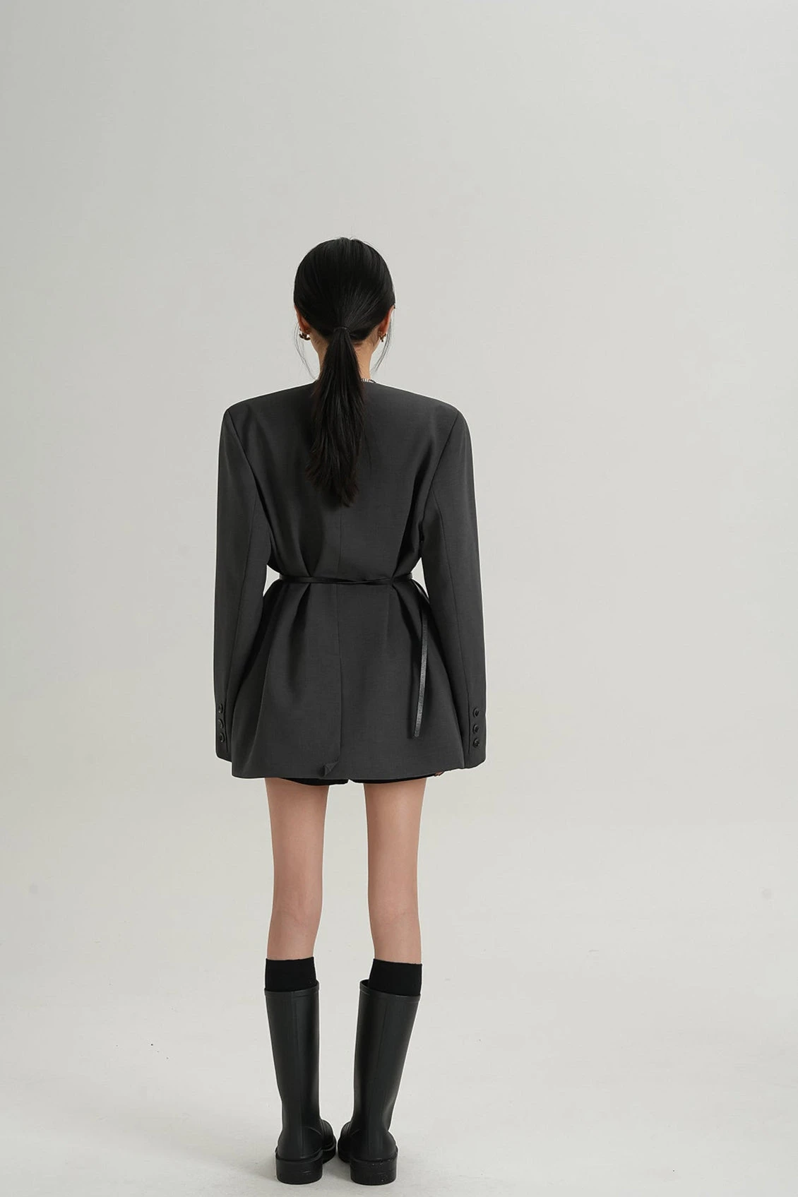 Made from 100% polyester with a structured, non-stretch feel, it offers a refined yet relaxed shape that enhances its oversized cut. Padded shoulders add quiet strength to the profile, while the smooth matte finish and single-button closure keep the look understated. The detachable belt lets you play with definition—worn loose for a slouched vibe or cinched for a more shaped feel.