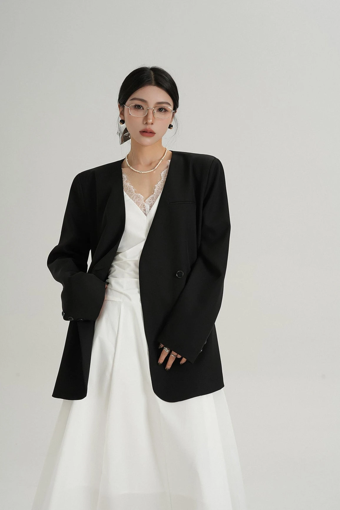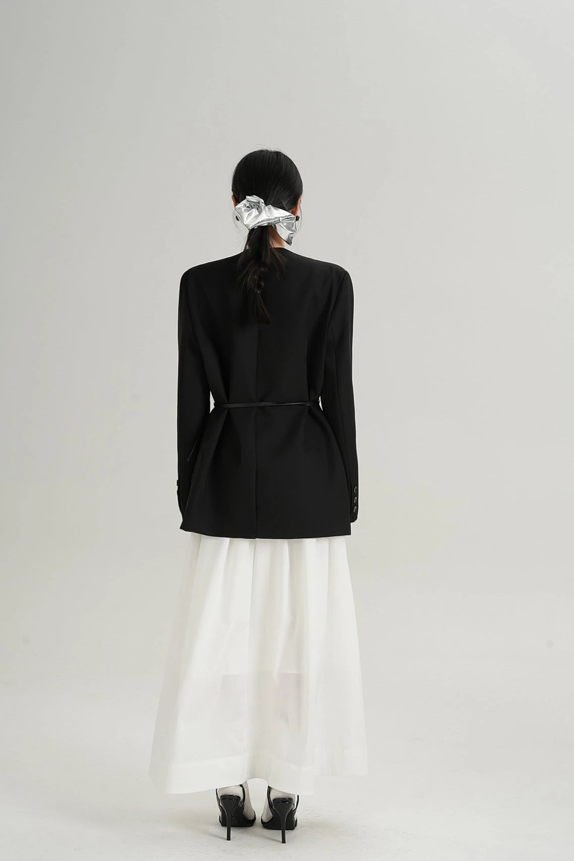 Pair it over wide-leg trousers, slip dresses, or denim for a look that moves easily from studio to street. Designed with modern ease in mind, this blazer fits into curated, low-key wardrobes that value thoughtful design and contrast-infused simplicity.