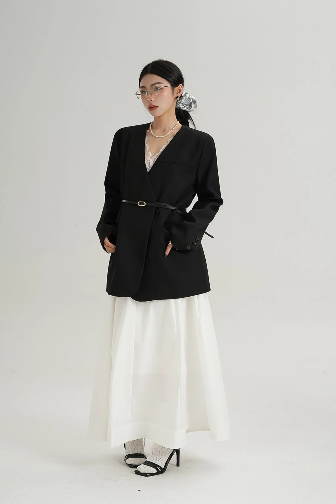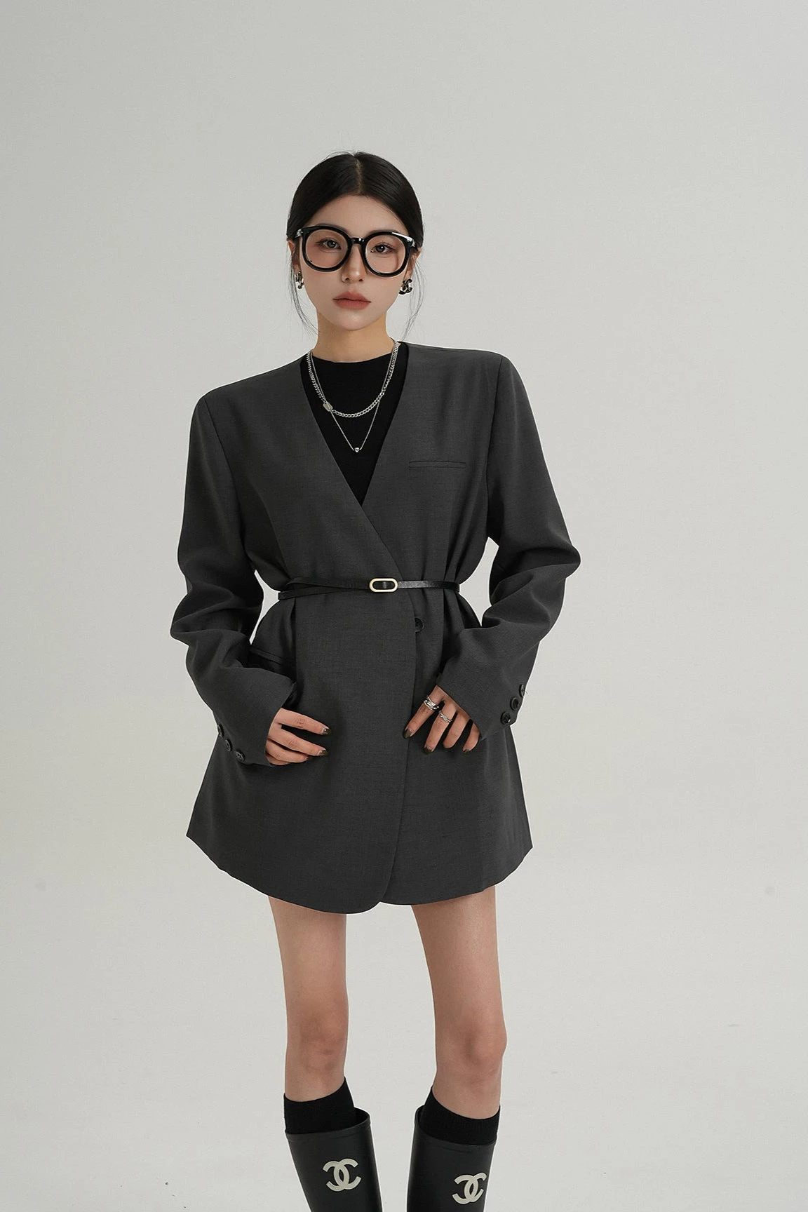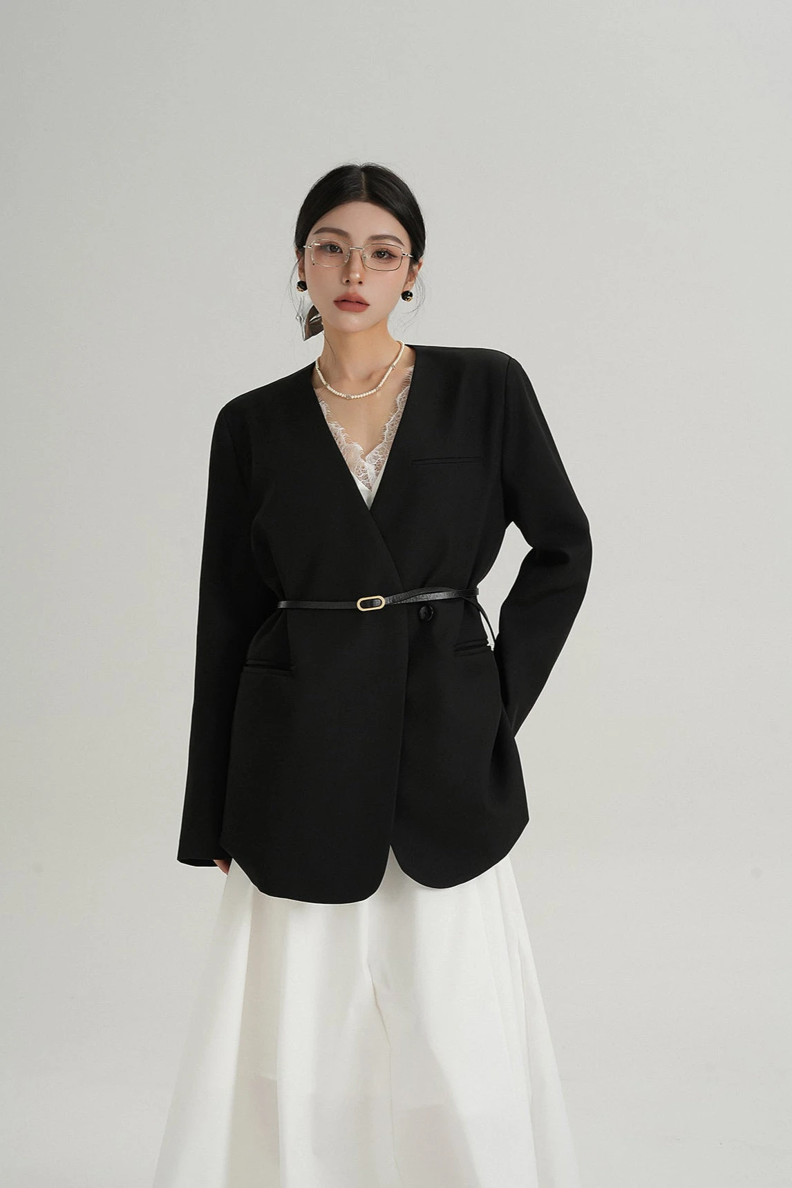 This oversized lapelless blazer brings a sharp edge to minimal tailoring with its sleek, belt-cinched silhouette and clean V-neckline.
