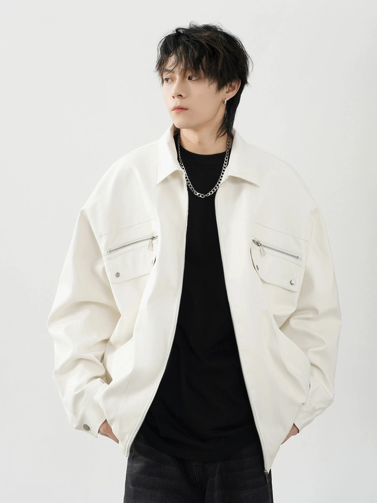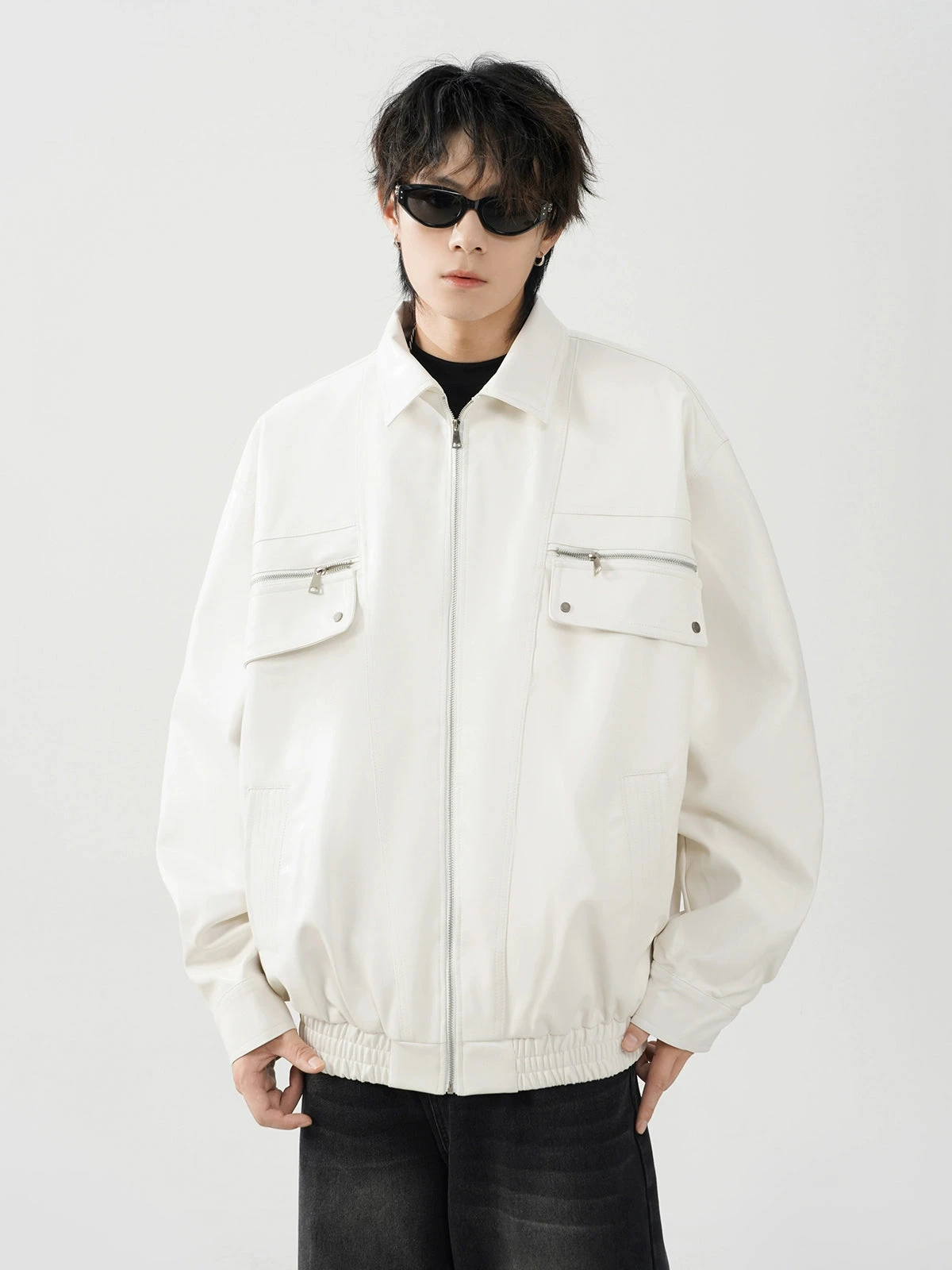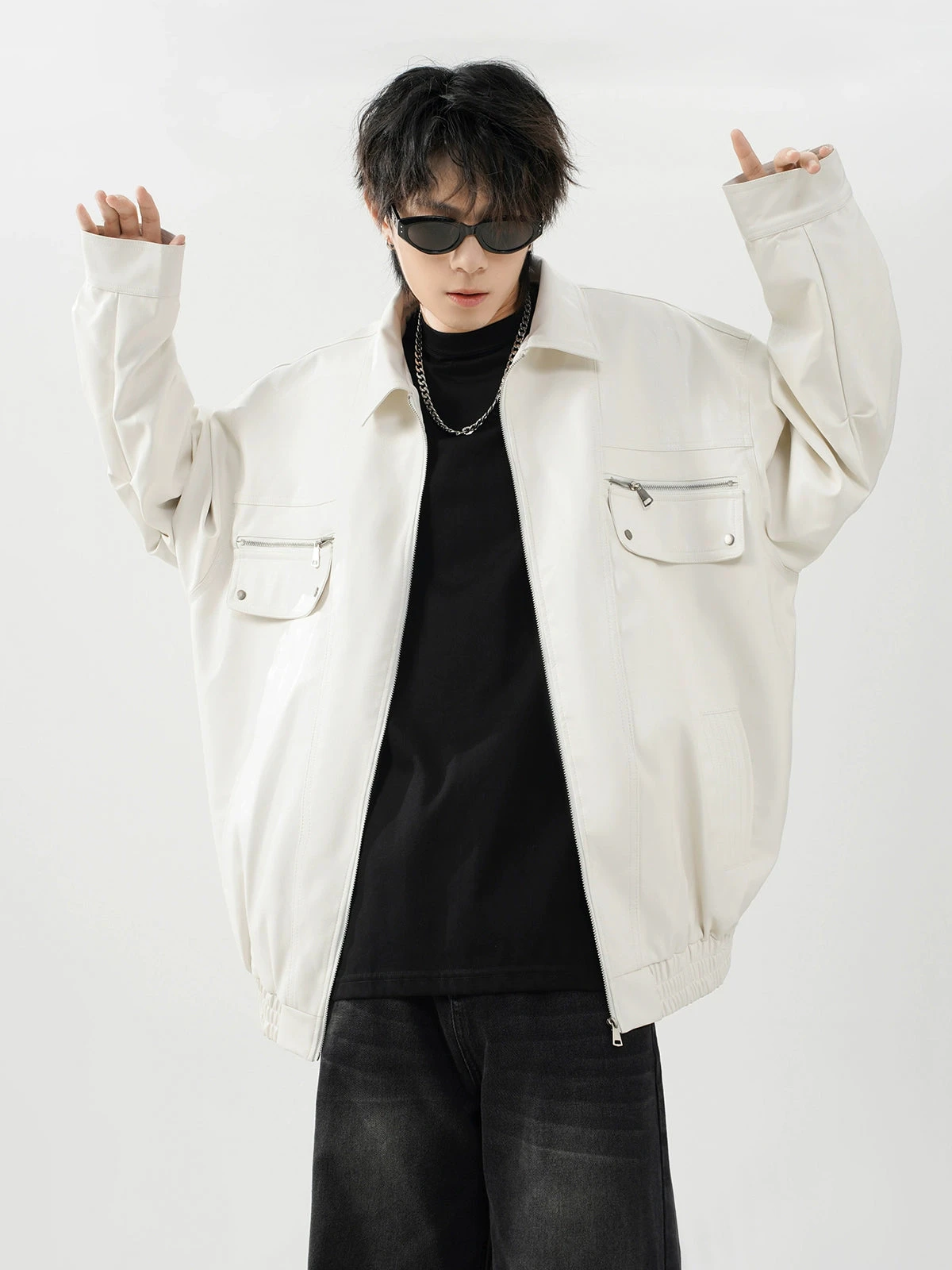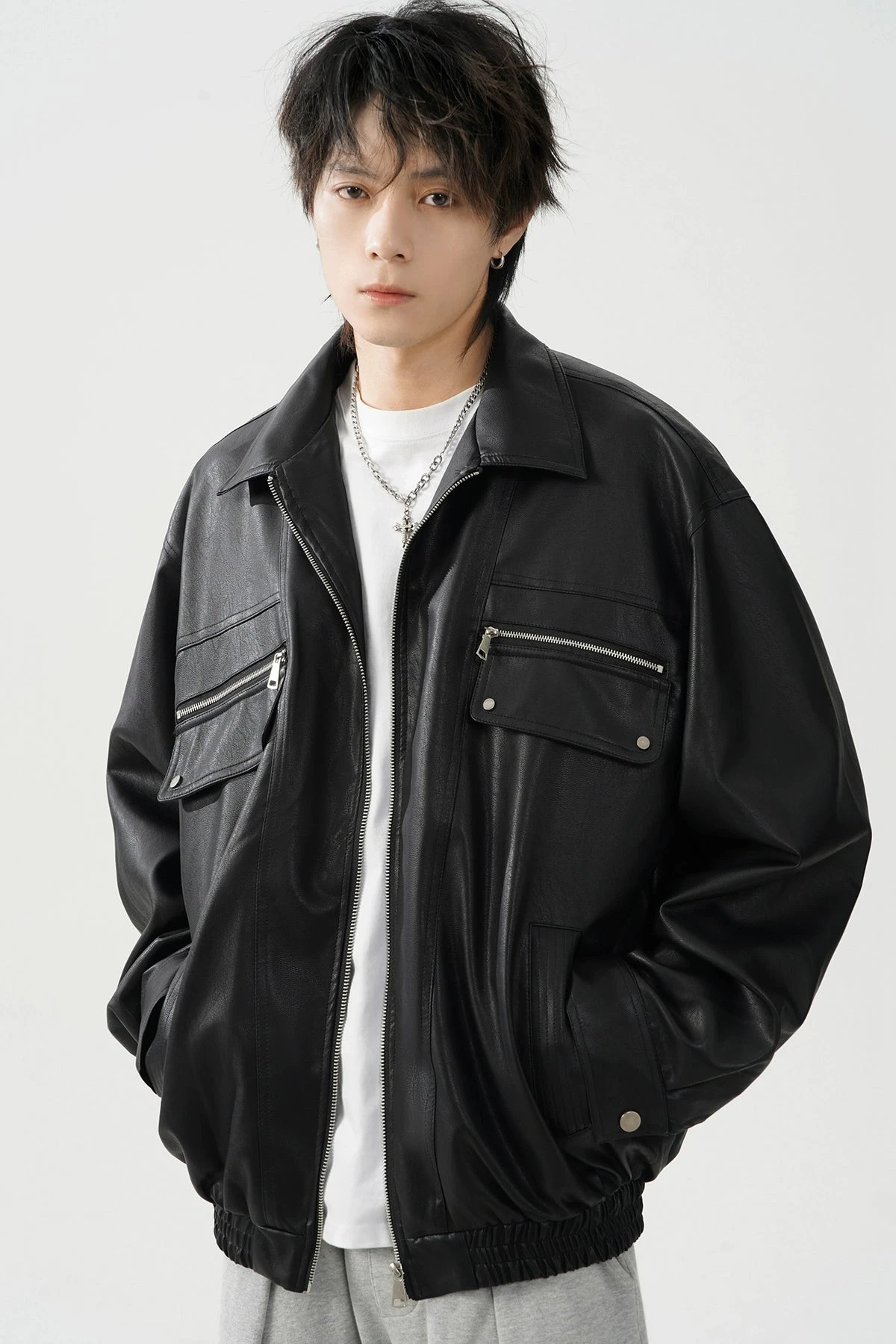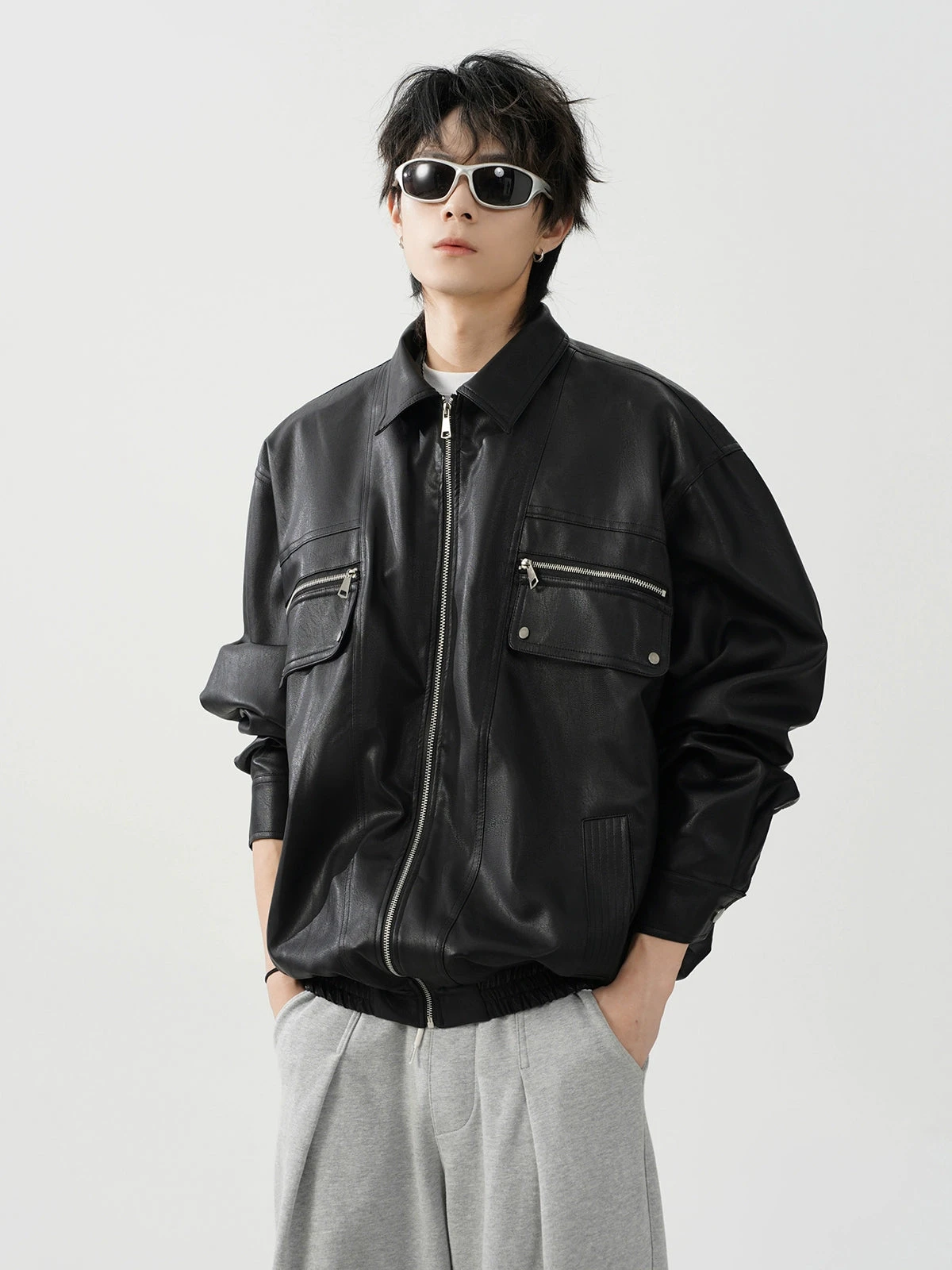 This meticulously crafted jacket features a durable polyurethane outer reminiscent of luxe leather, ensuring a striking appearance without compromising on longevity. The conventional sleeve style and lapel collar add a traditional touch to the otherwise modern oversized fit, making it a statement piece for your wardrobe. Integrated zip pockets offer both utility and style, elevating the jacket’s practicality.