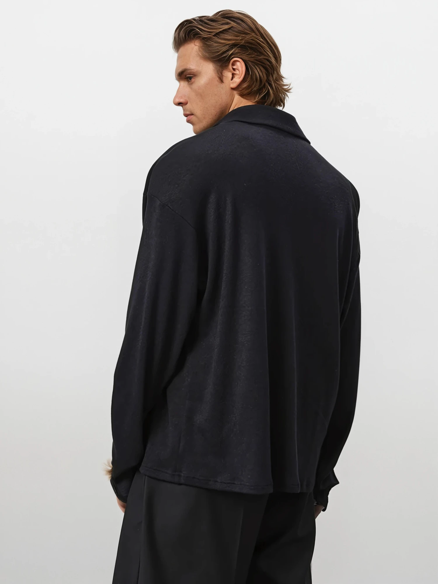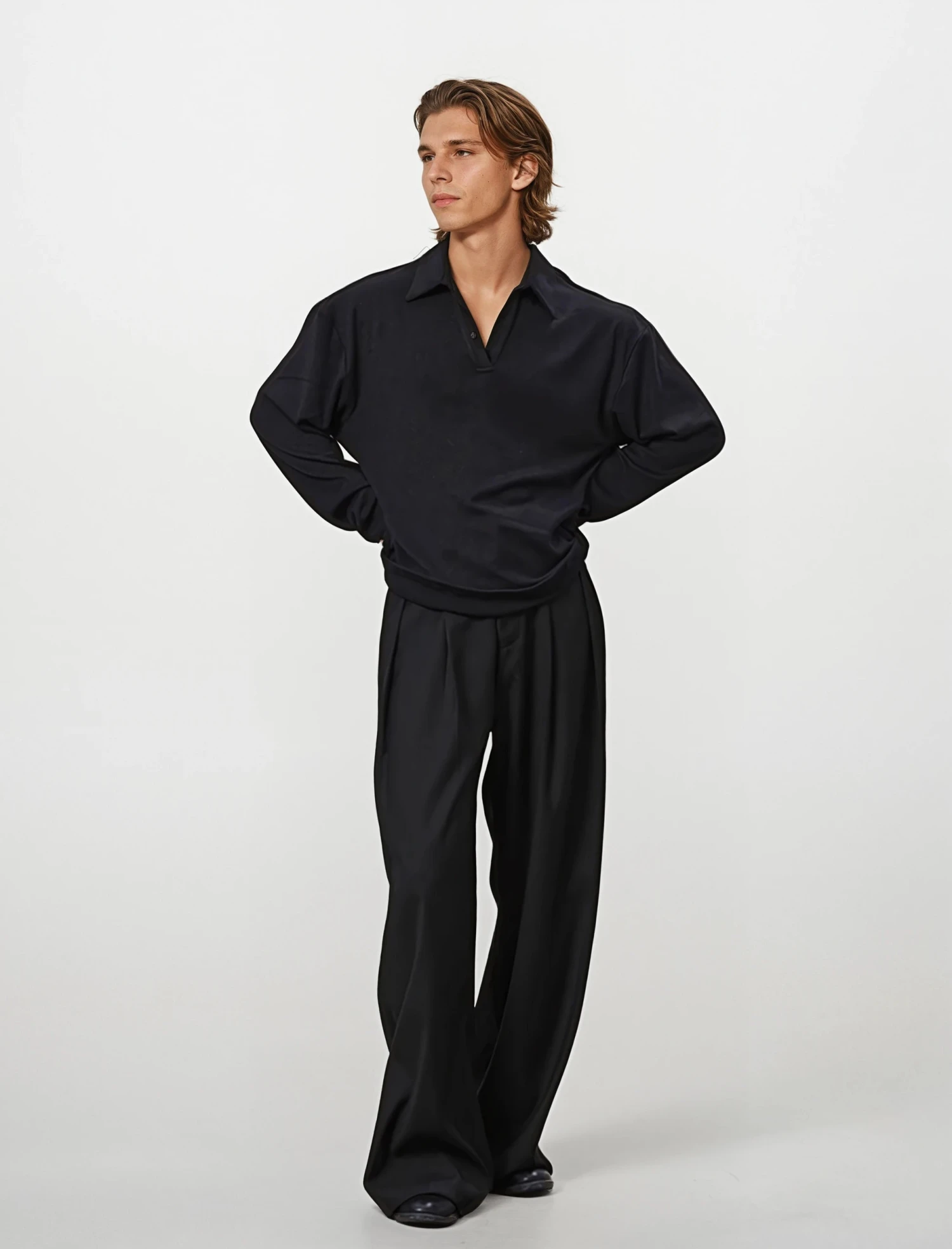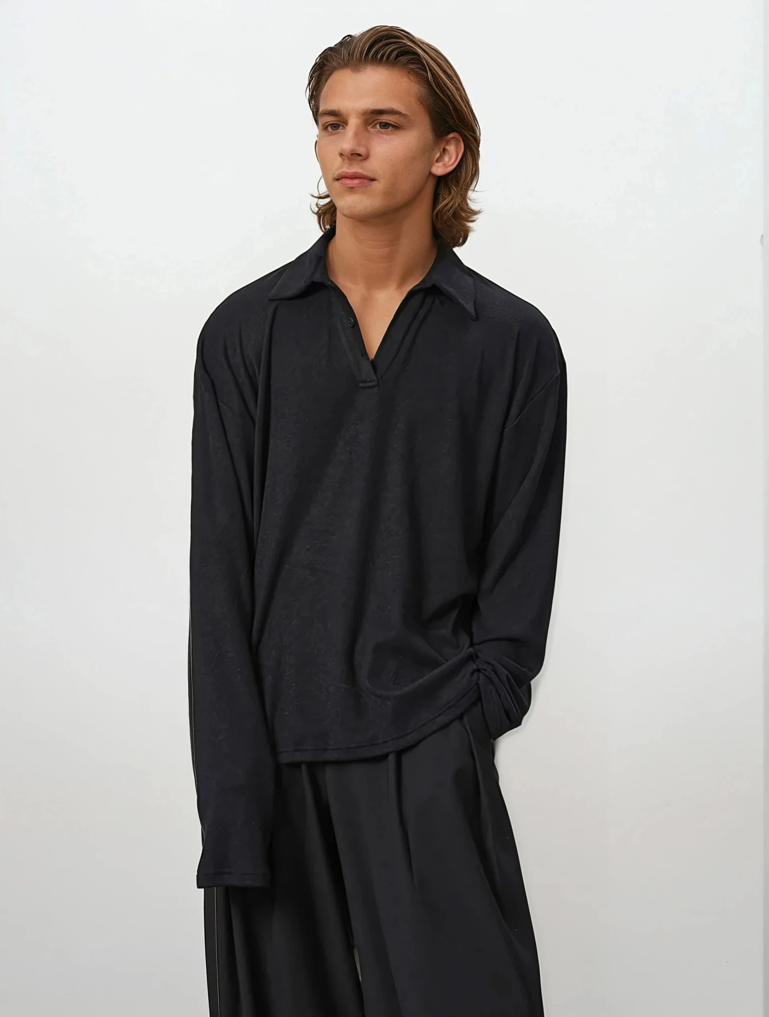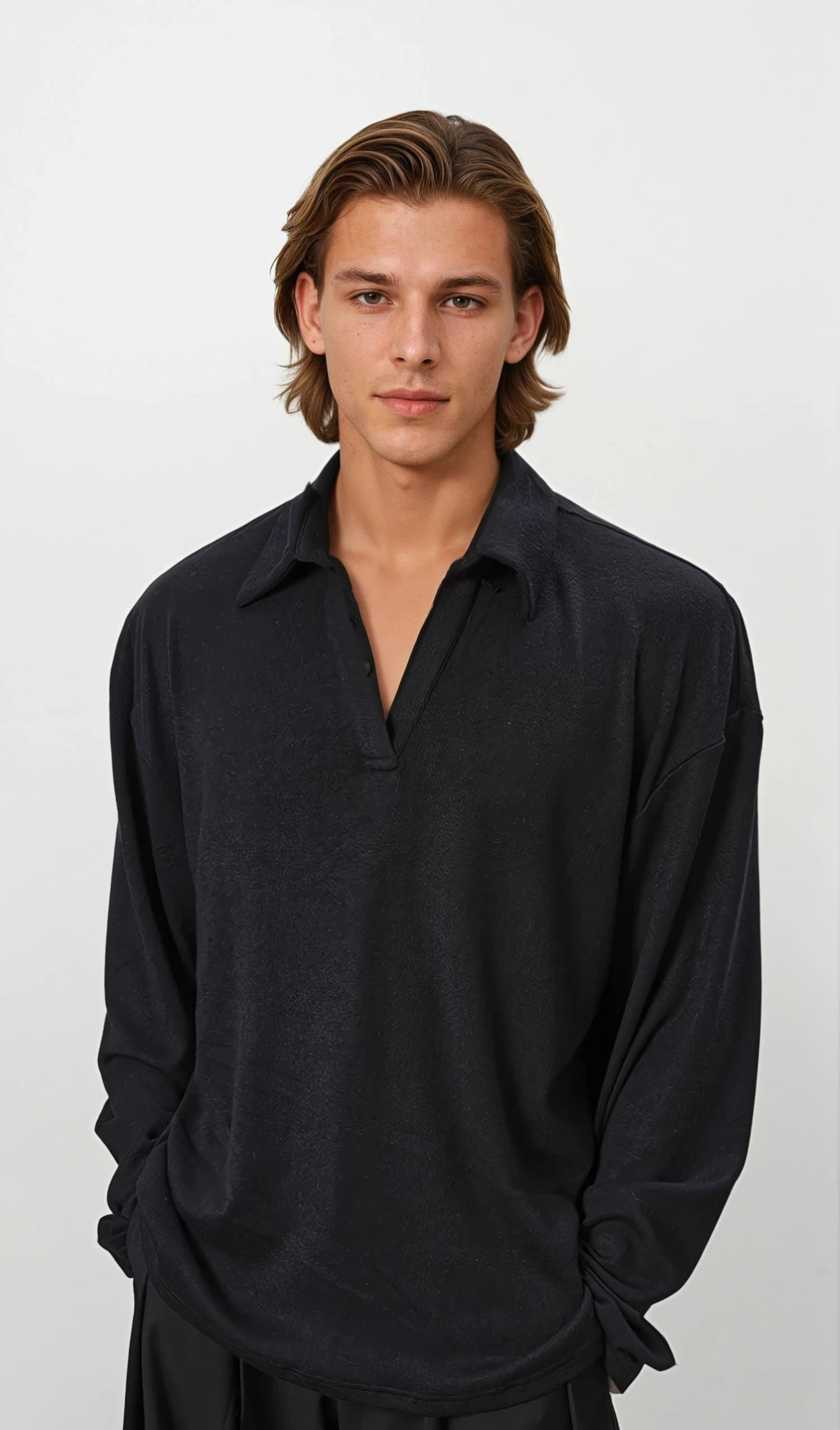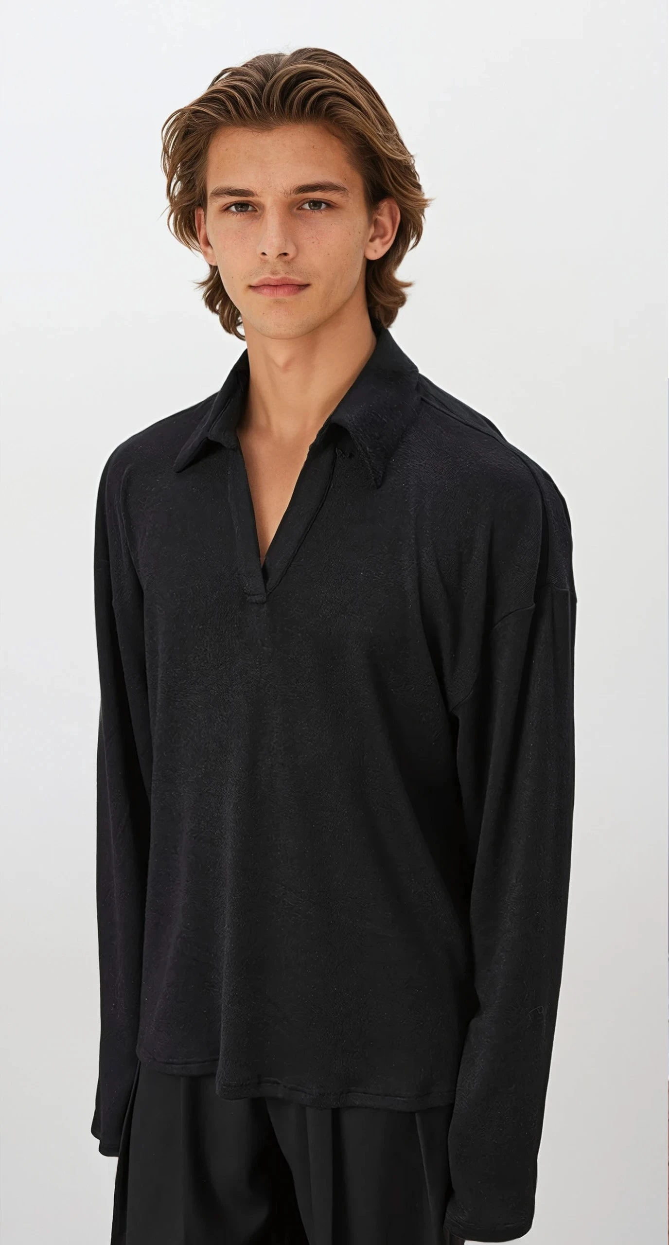 An oversized silhouette meets sharp edge in this long sleeve V-neck polo top — crafted for movement, ease, and a cool, understated attitude.