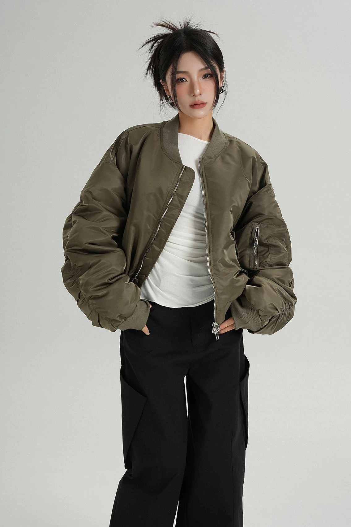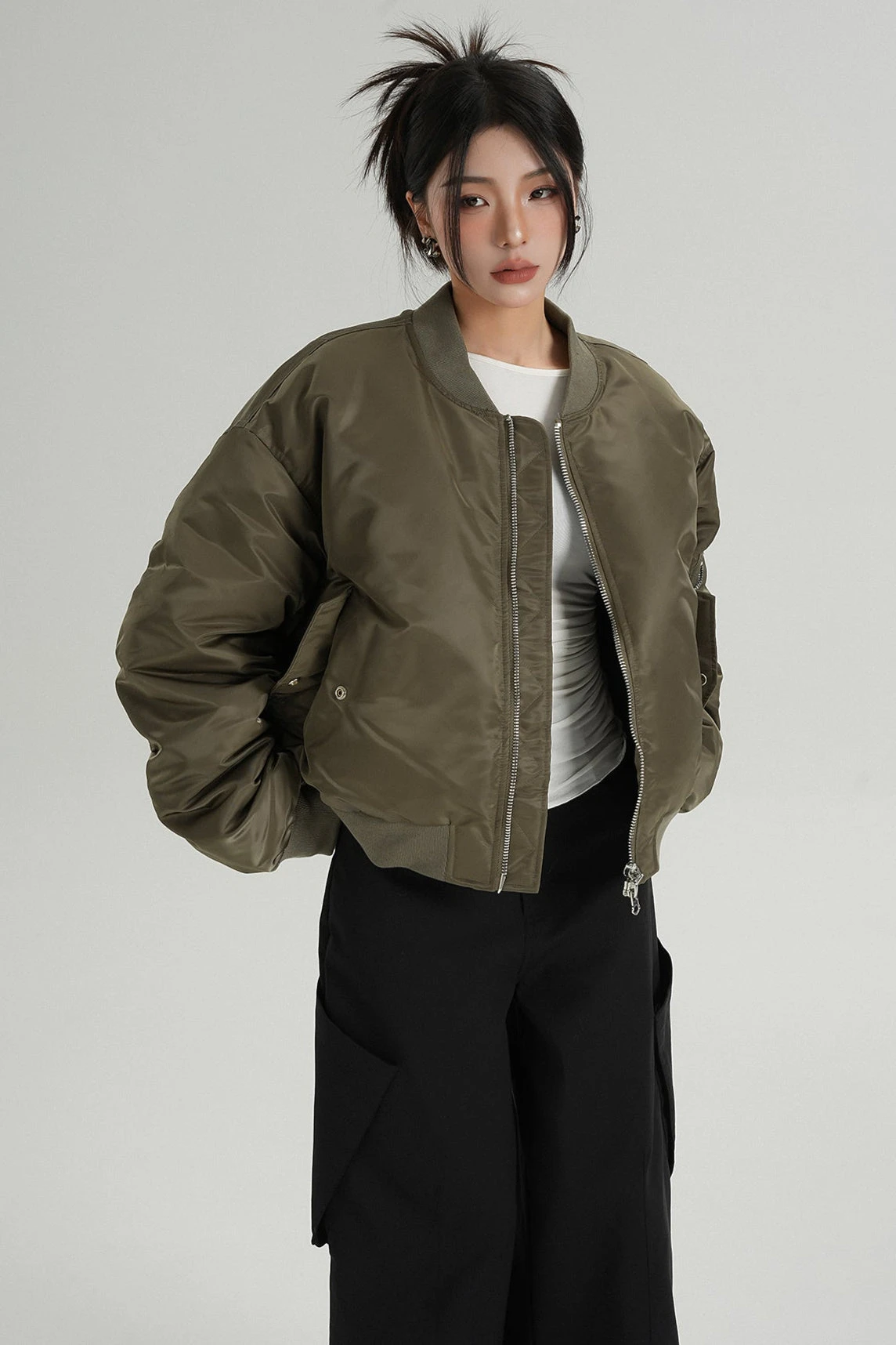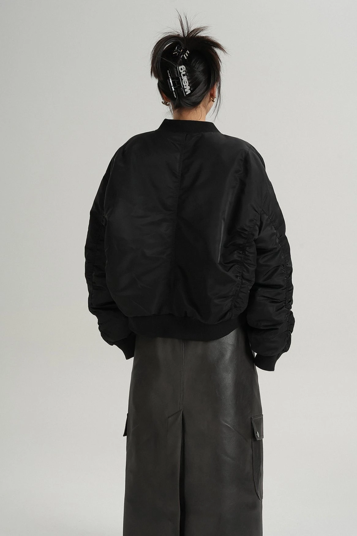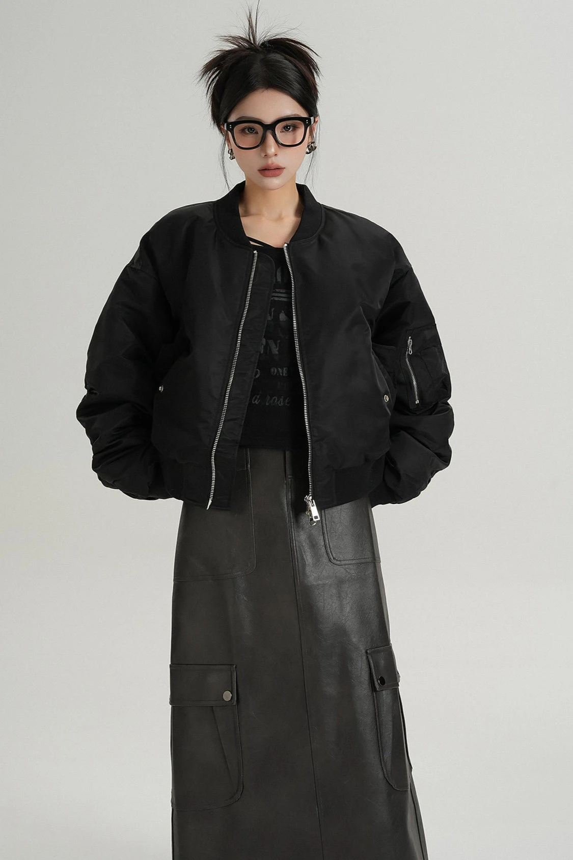 The oversized mid-crop bomber jacket balances bold structure with understated details, anchored by its signature sleeve zipper pocket and effortlessly cool aesthetic.
