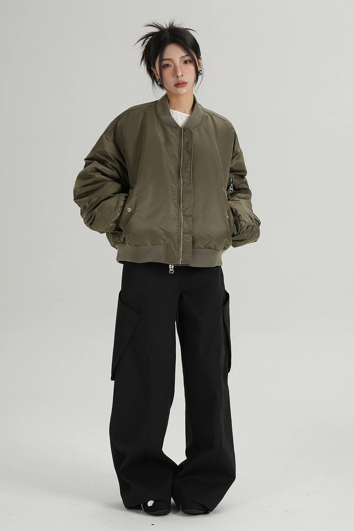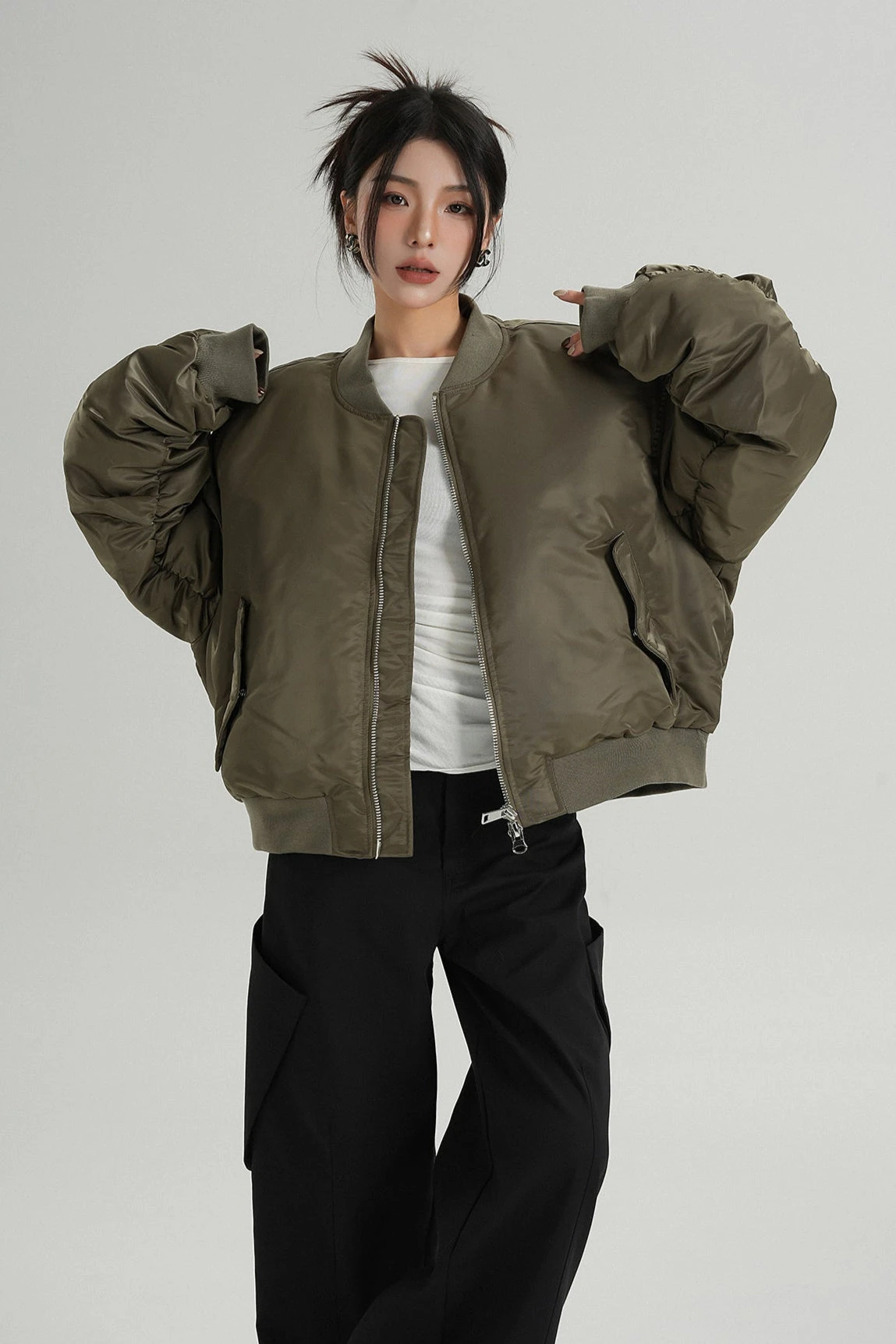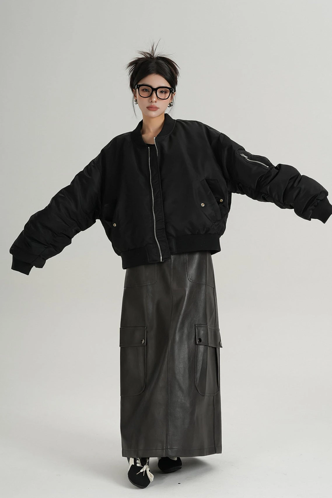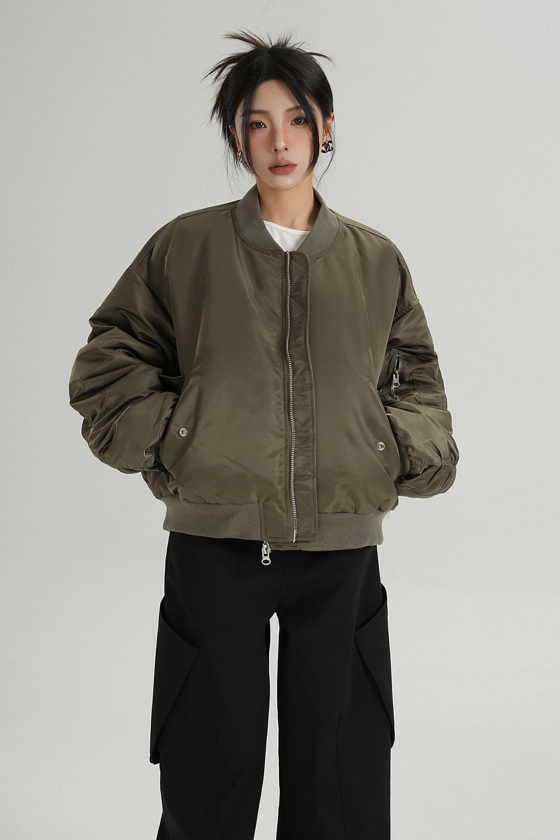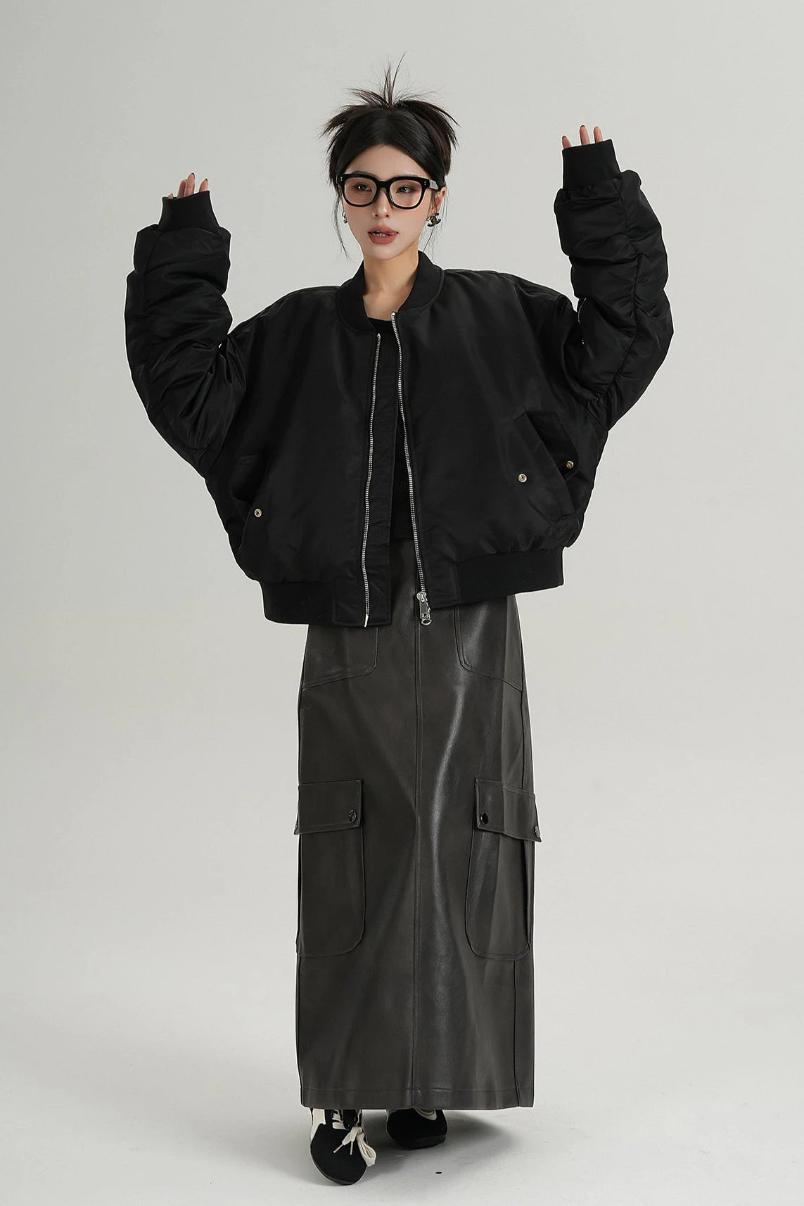 The oversized mid-crop bomber jacket balances bold structure with understated details, anchored by its signature sleeve zipper pocket and effortlessly cool aesthetic.