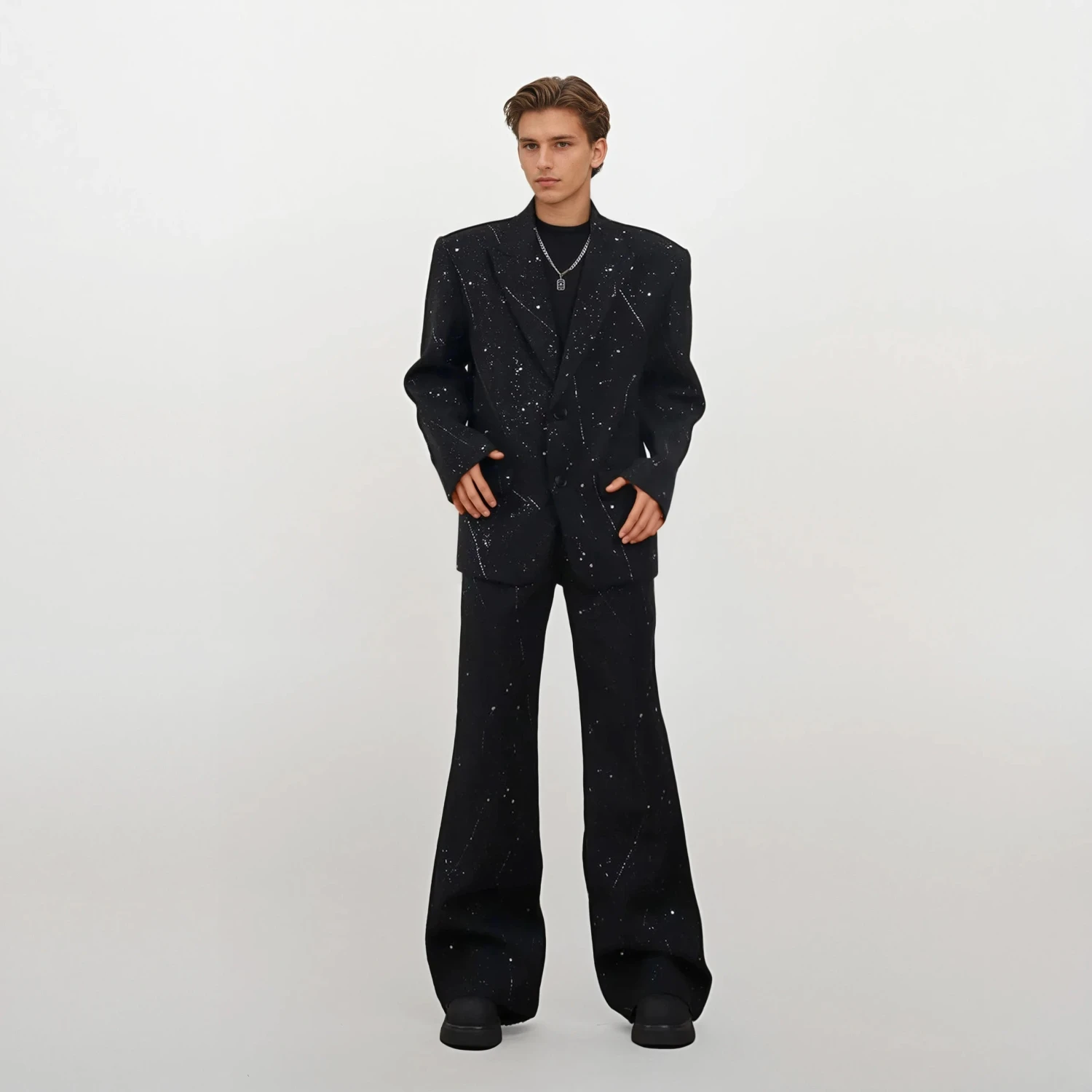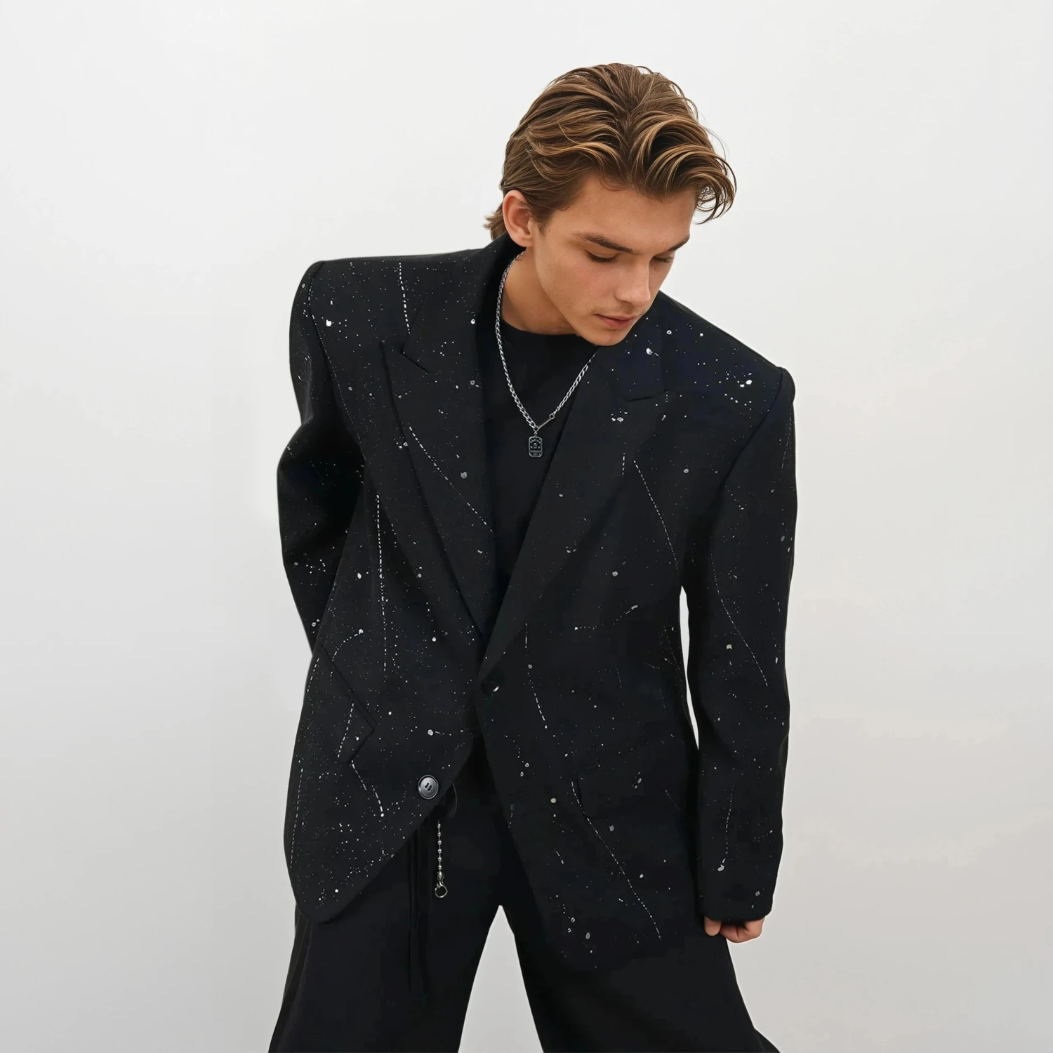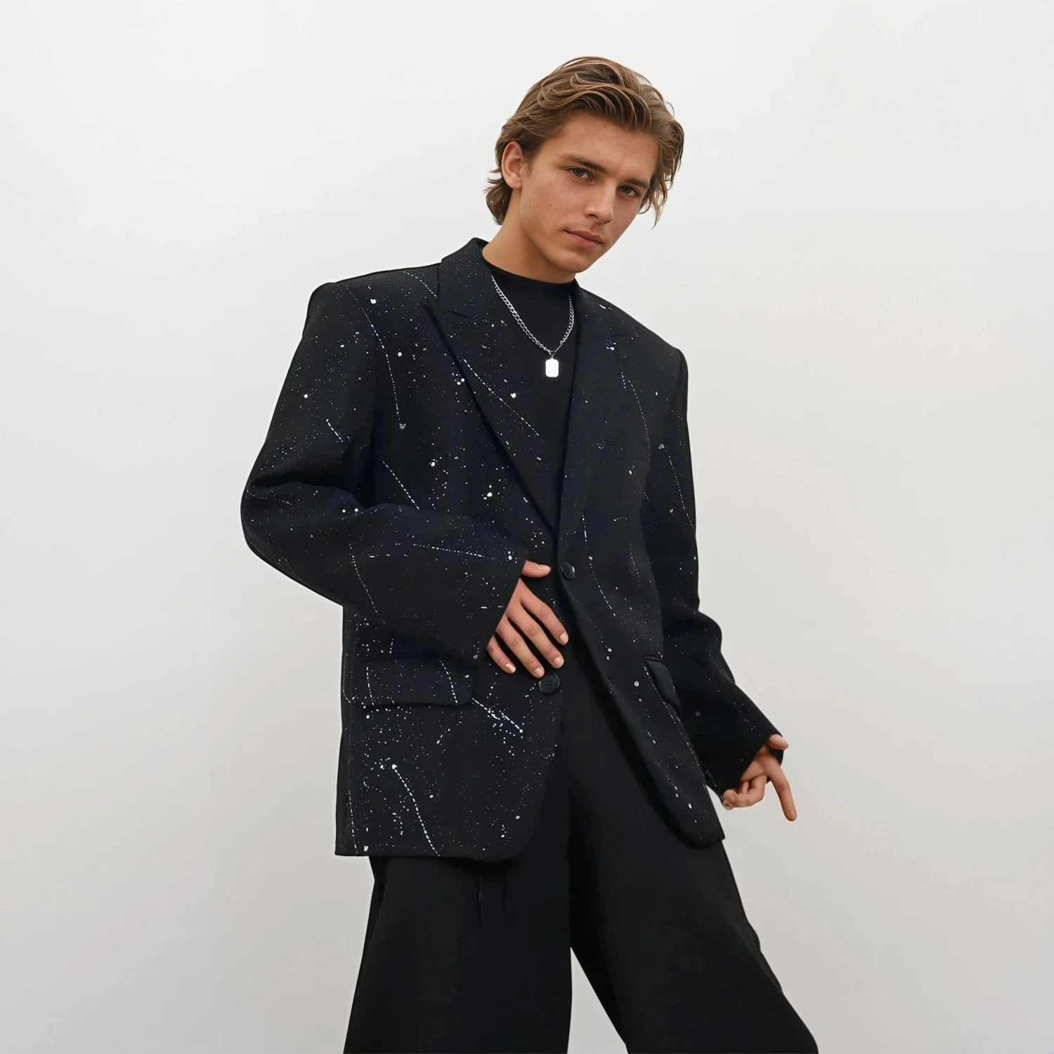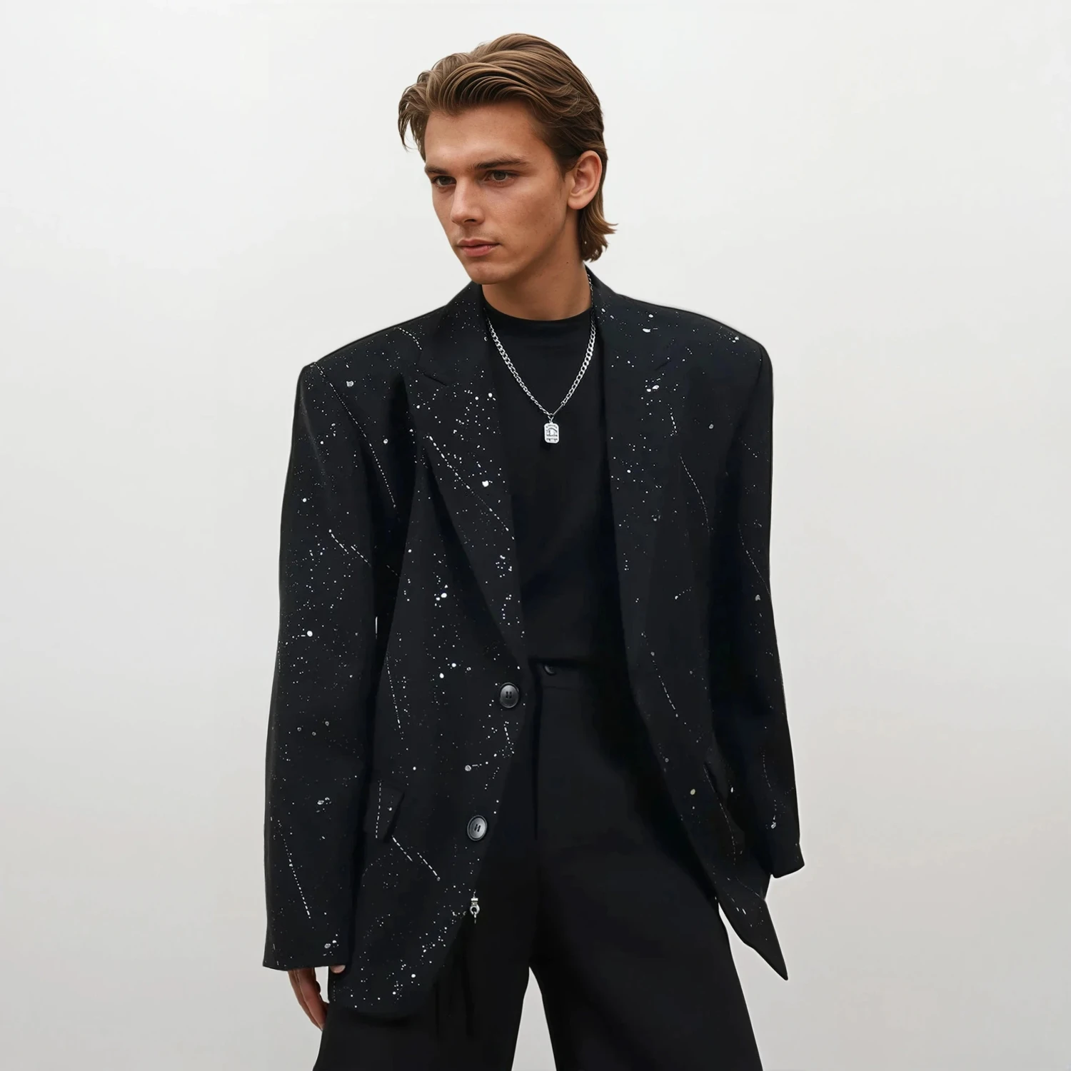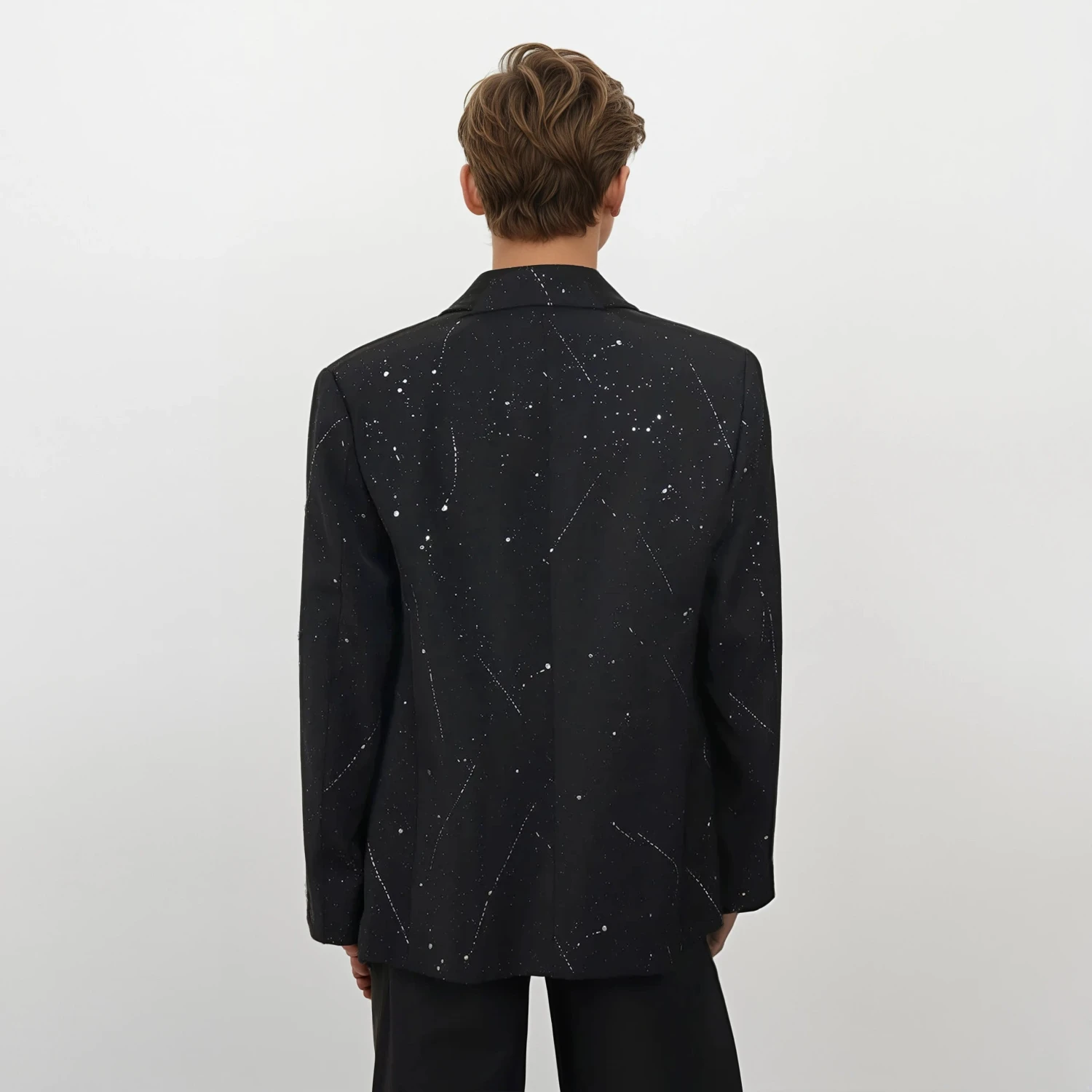 Crafted from a mid-weight woven fabric, this jacket features structured shoulders and wide notch lapels for a bold presence. The all-over paint splatter effect adds texture and movement to the solid black base, giving it a contemporary look that doesn’t try too hard. Its soft interior lining lends comfort, while the slightly loose fit makes it easy to layer over tees or turtlenecks.