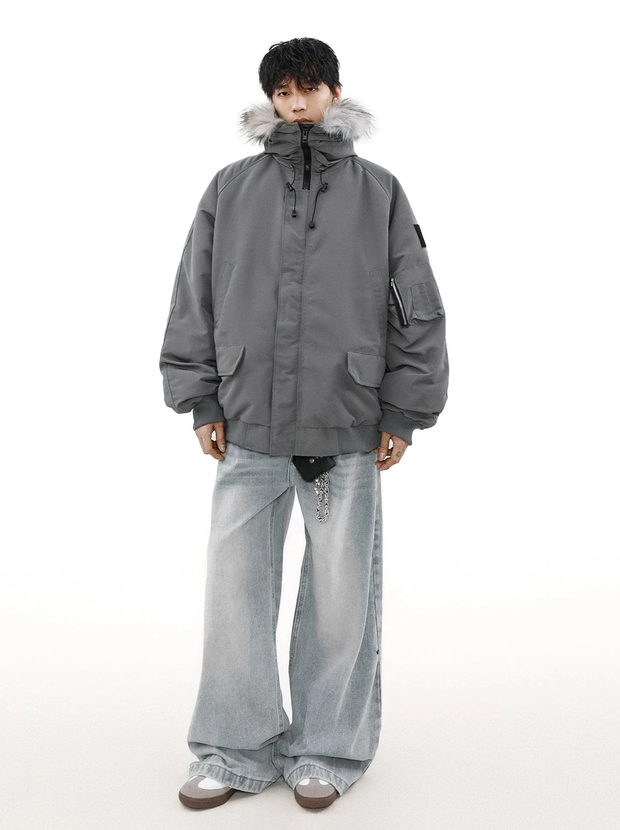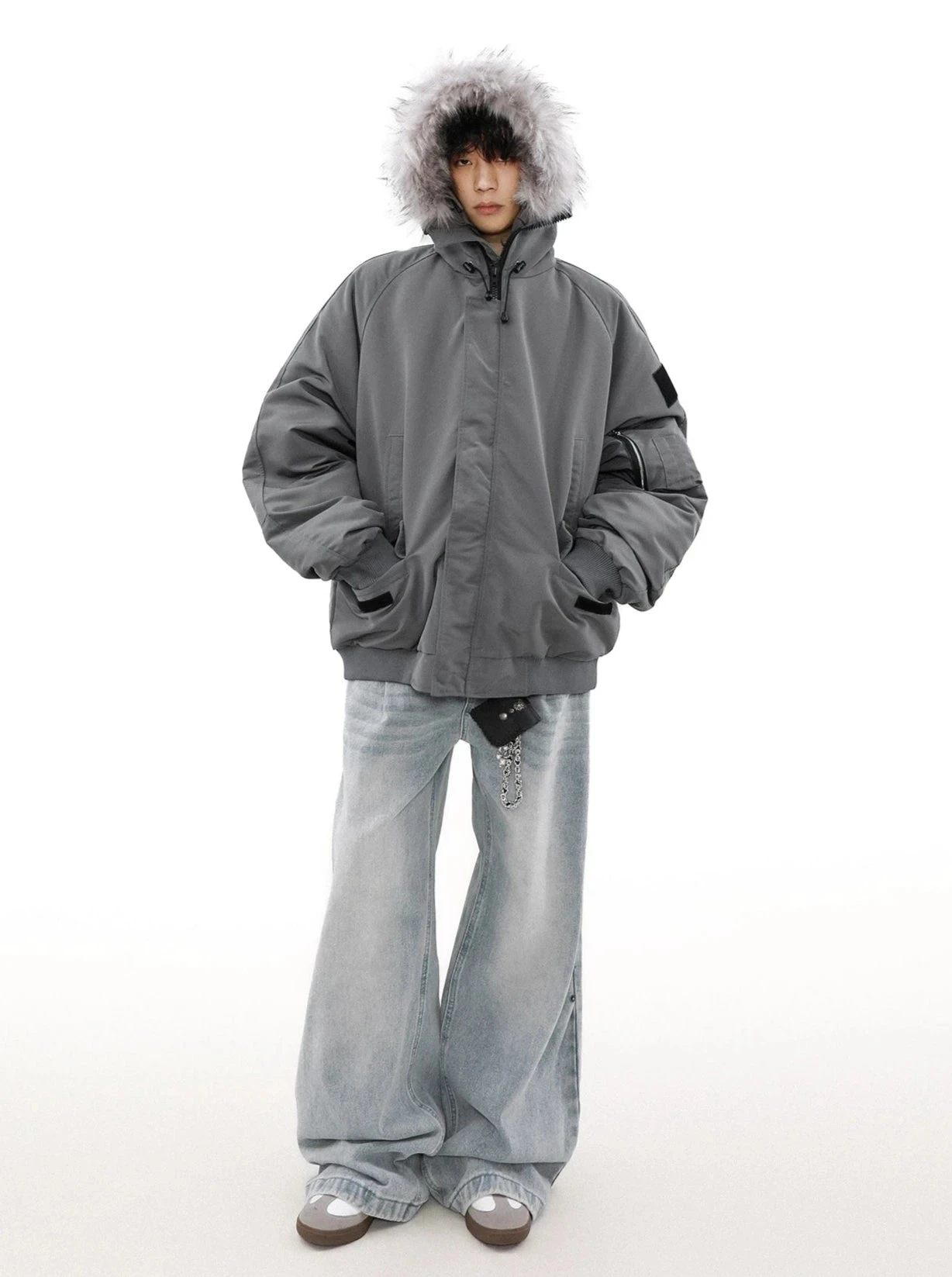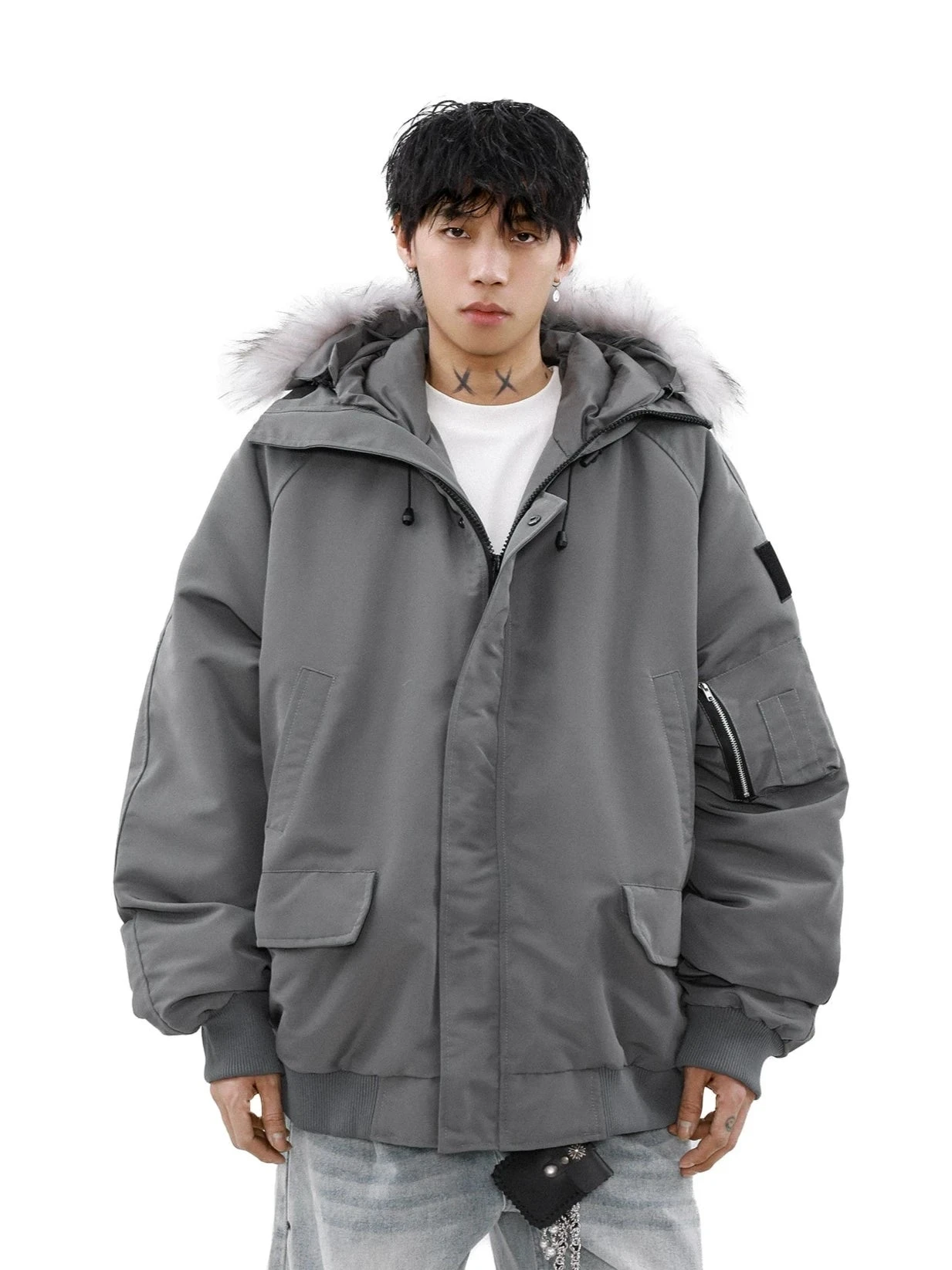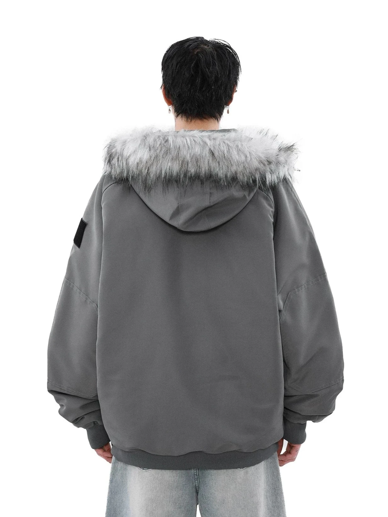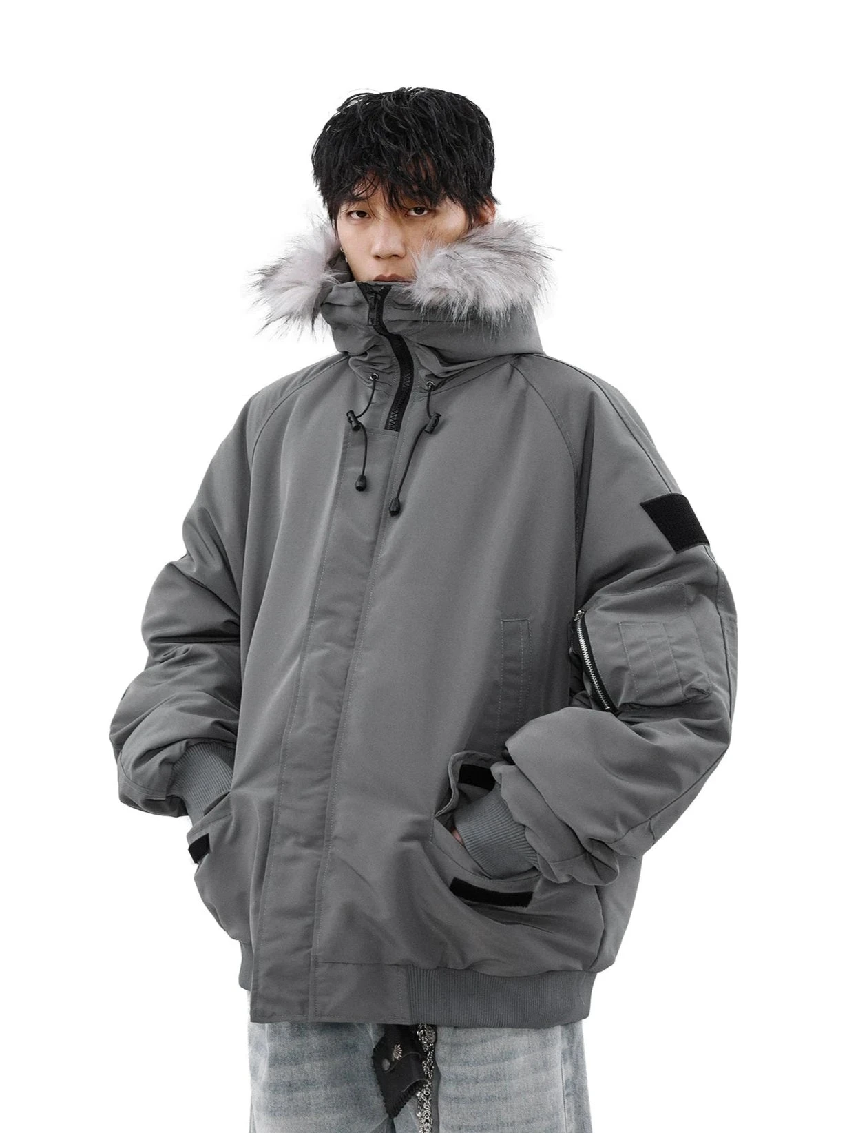 Constructed with a durable polyester outer shell and a cozy cotton filling, this jacket offers both weather resistance and comfort. The robust zipper closure, deep storage pockets, and a stylishly loose fit lend an air of laid-back sophistication, while the removable faux fur hood trim adds a touch of luxe versatility.