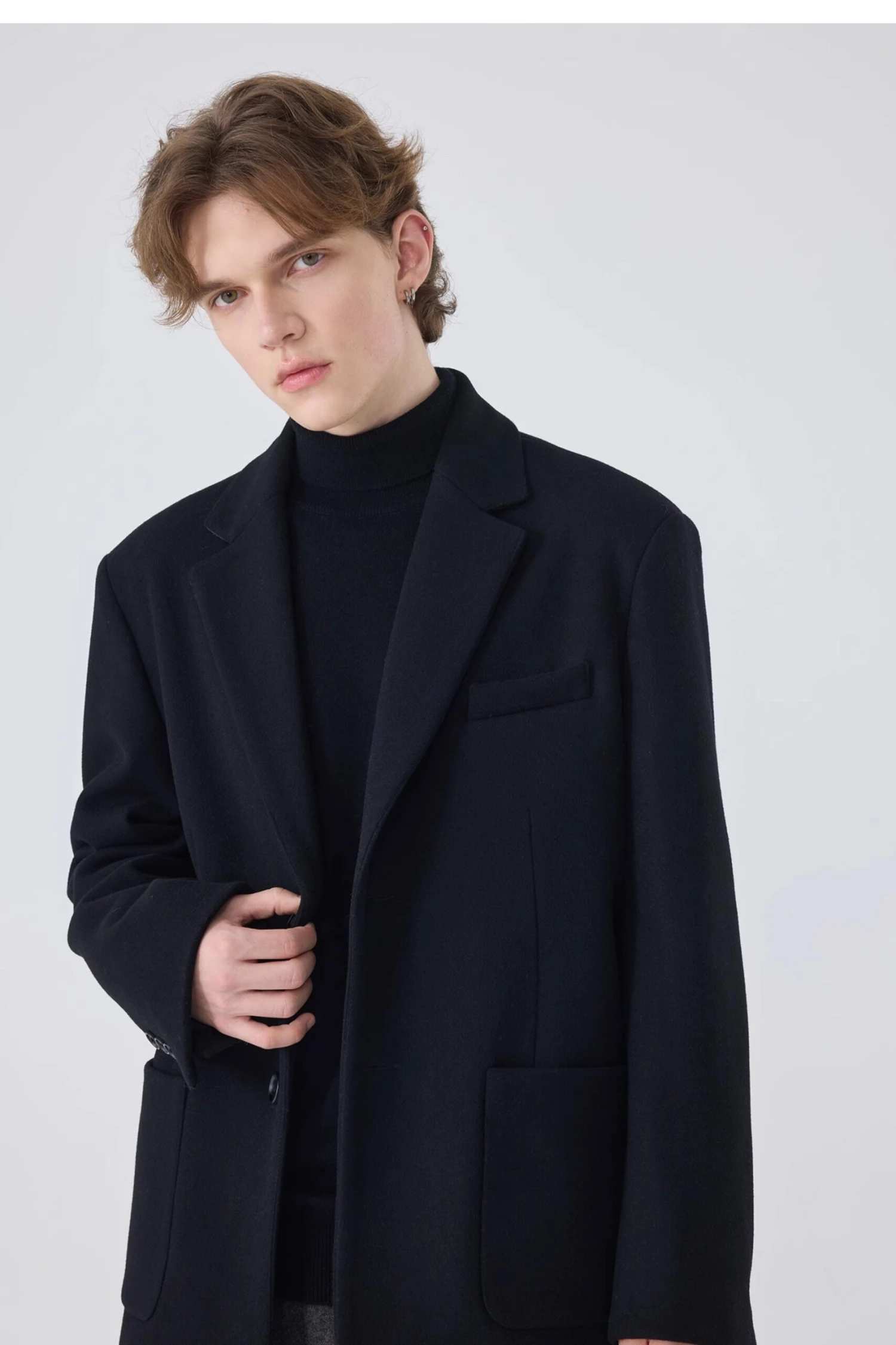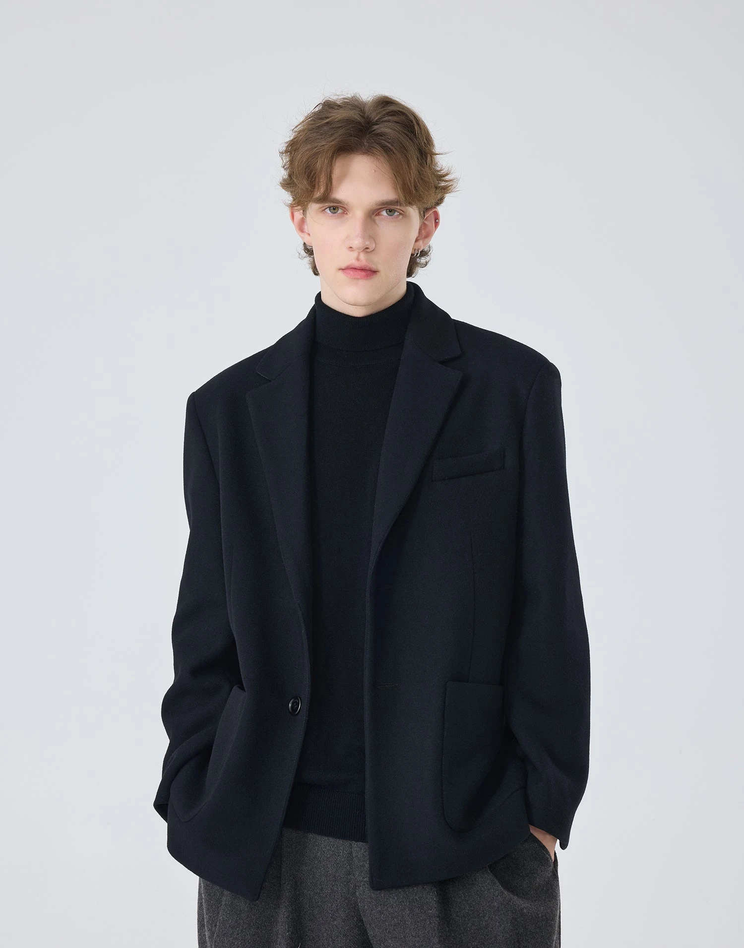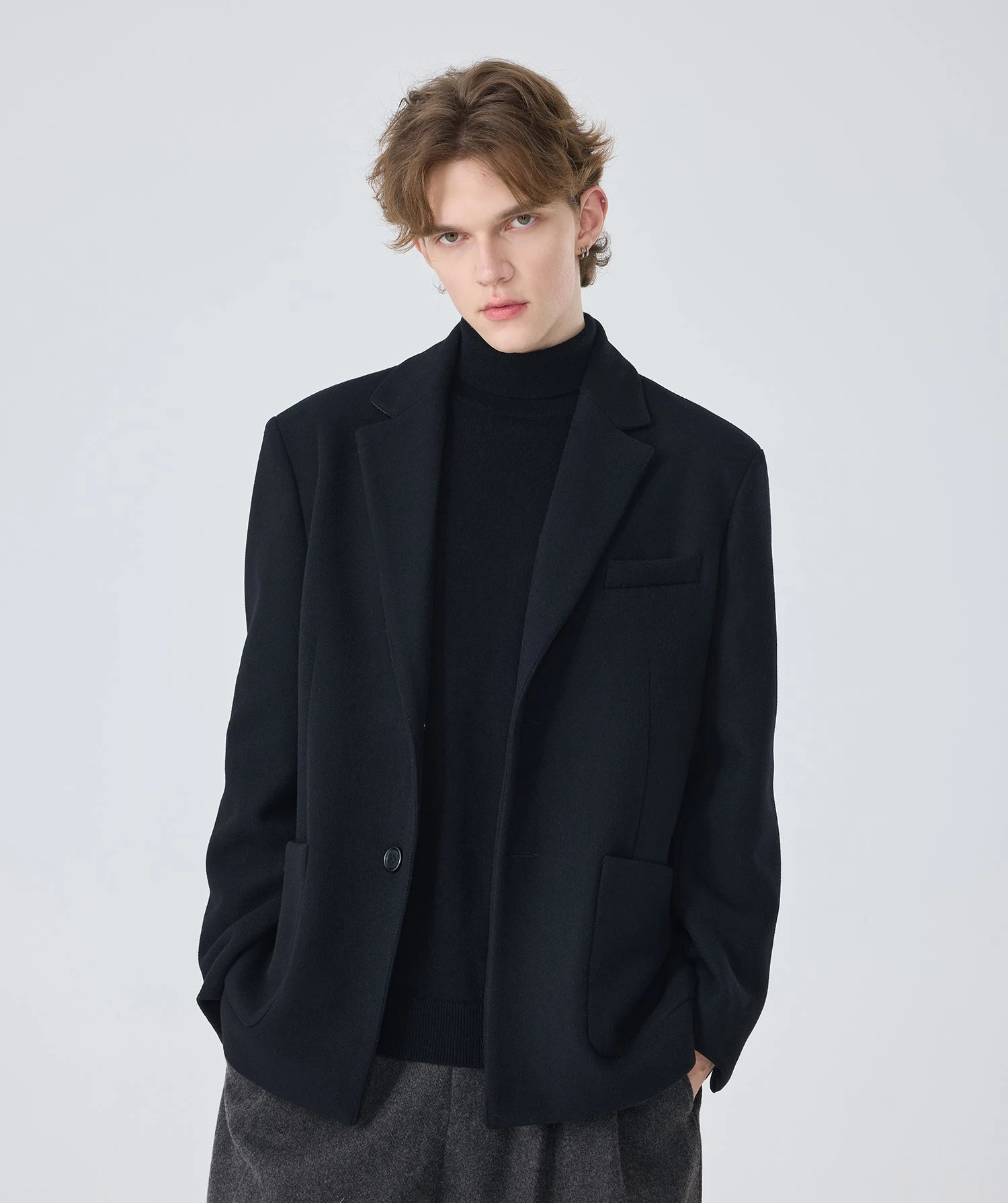 Designed with a relaxed fit and a sharp notched lapel, this single-breasted jacket brings effortless refinement to any look. Its clean silhouette makes it a staple for layering, whether you’re dressing it up or keeping it casual. Cut from a premium wool-blend fabric, this blazer combines softness with durability, offering warmth without feeling too heavy.