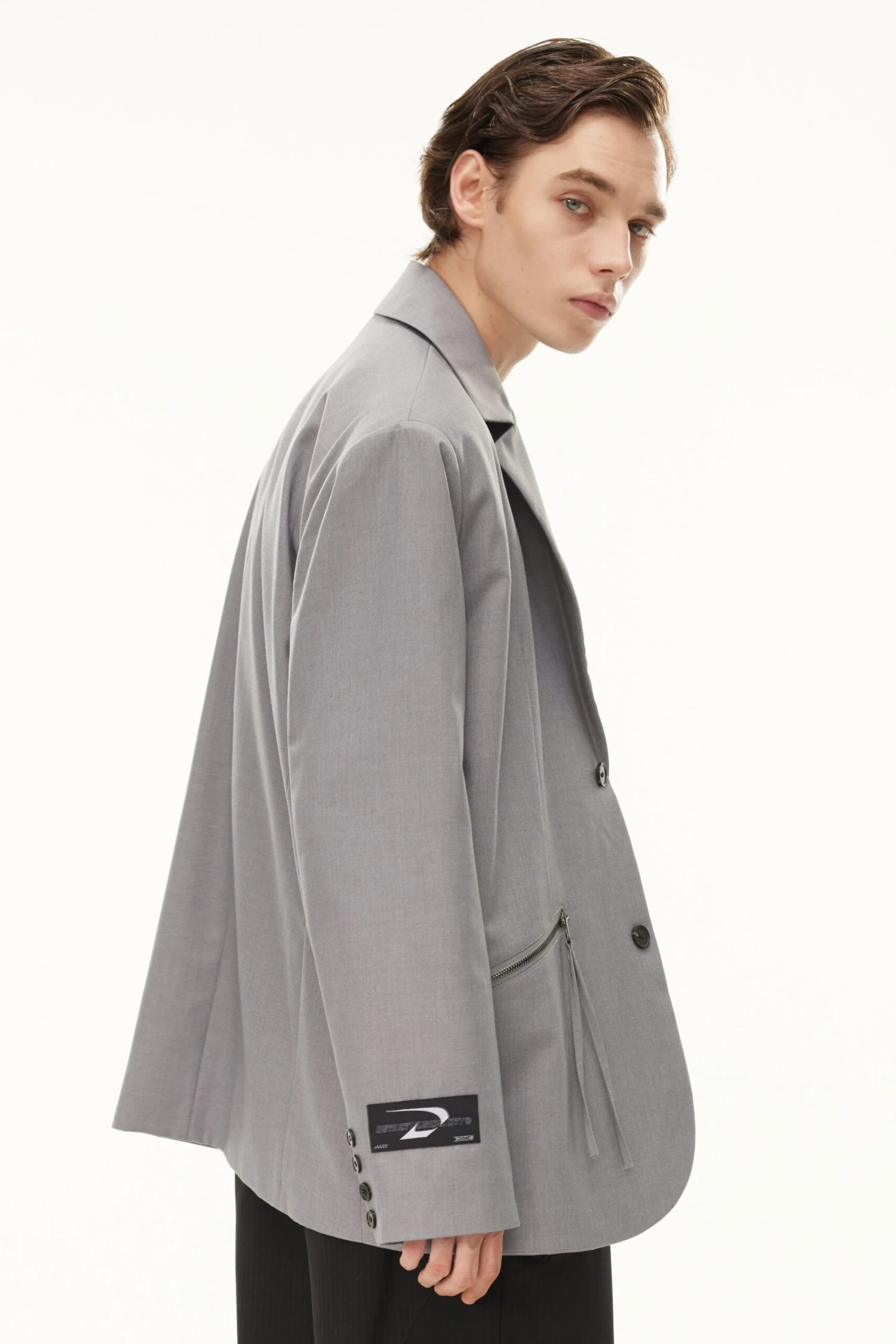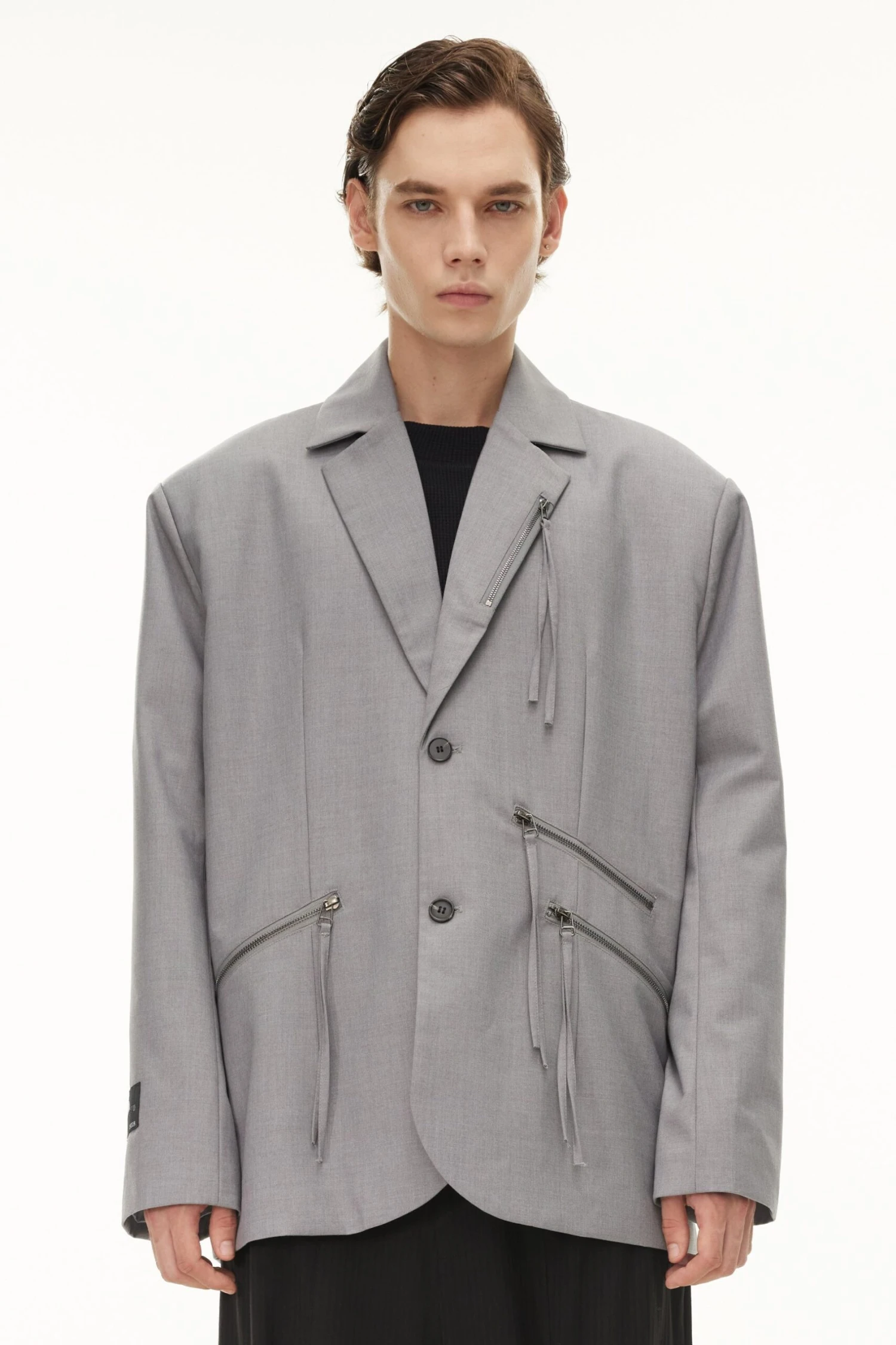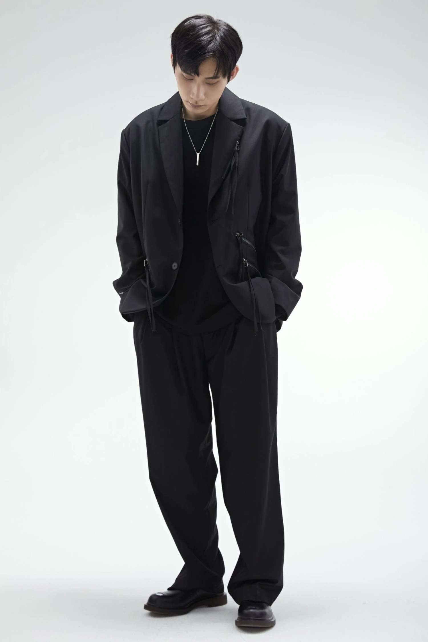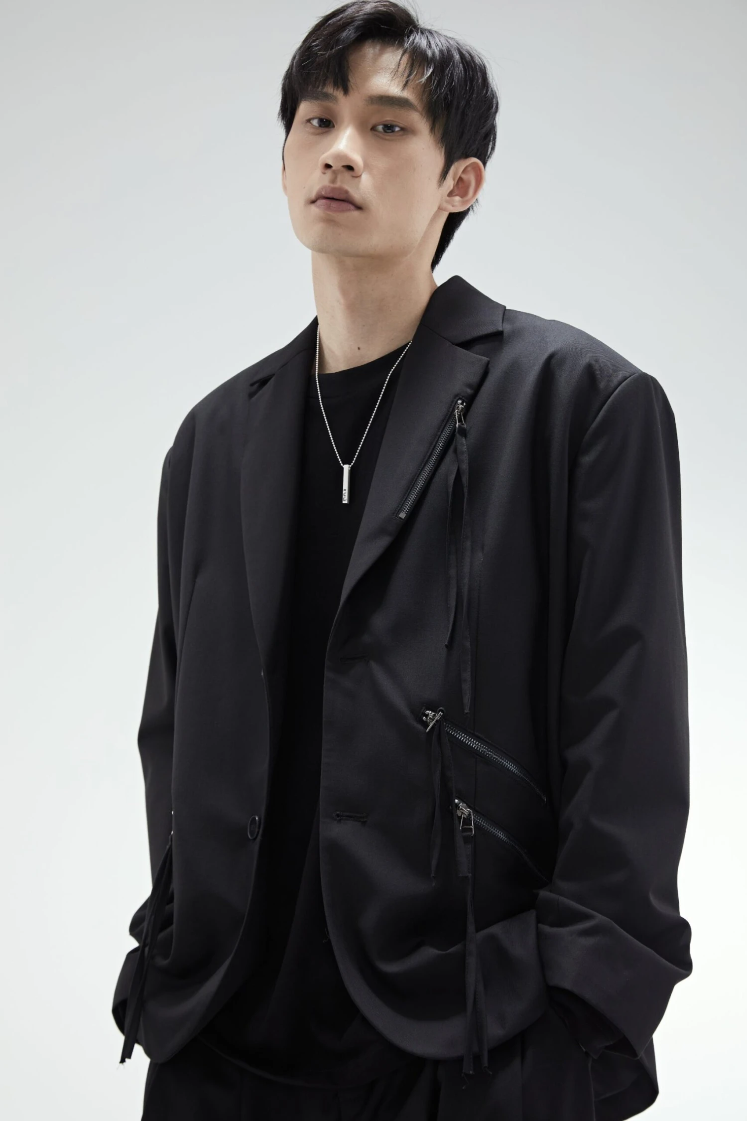 Cut from a smooth, matte-finish polyester blend with subtle stretch, this blazer features a single-breasted closure, narrow notch lapels, and distinctive decorative zip details with loose tassels that elevate its clean structure. The loose fit and padded shoulders give it a confident drape that’s both modern and effortless, while the back slit adds movement and breathability.