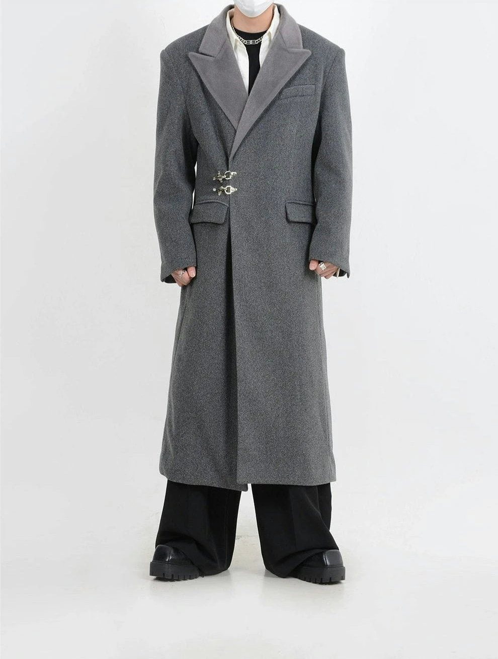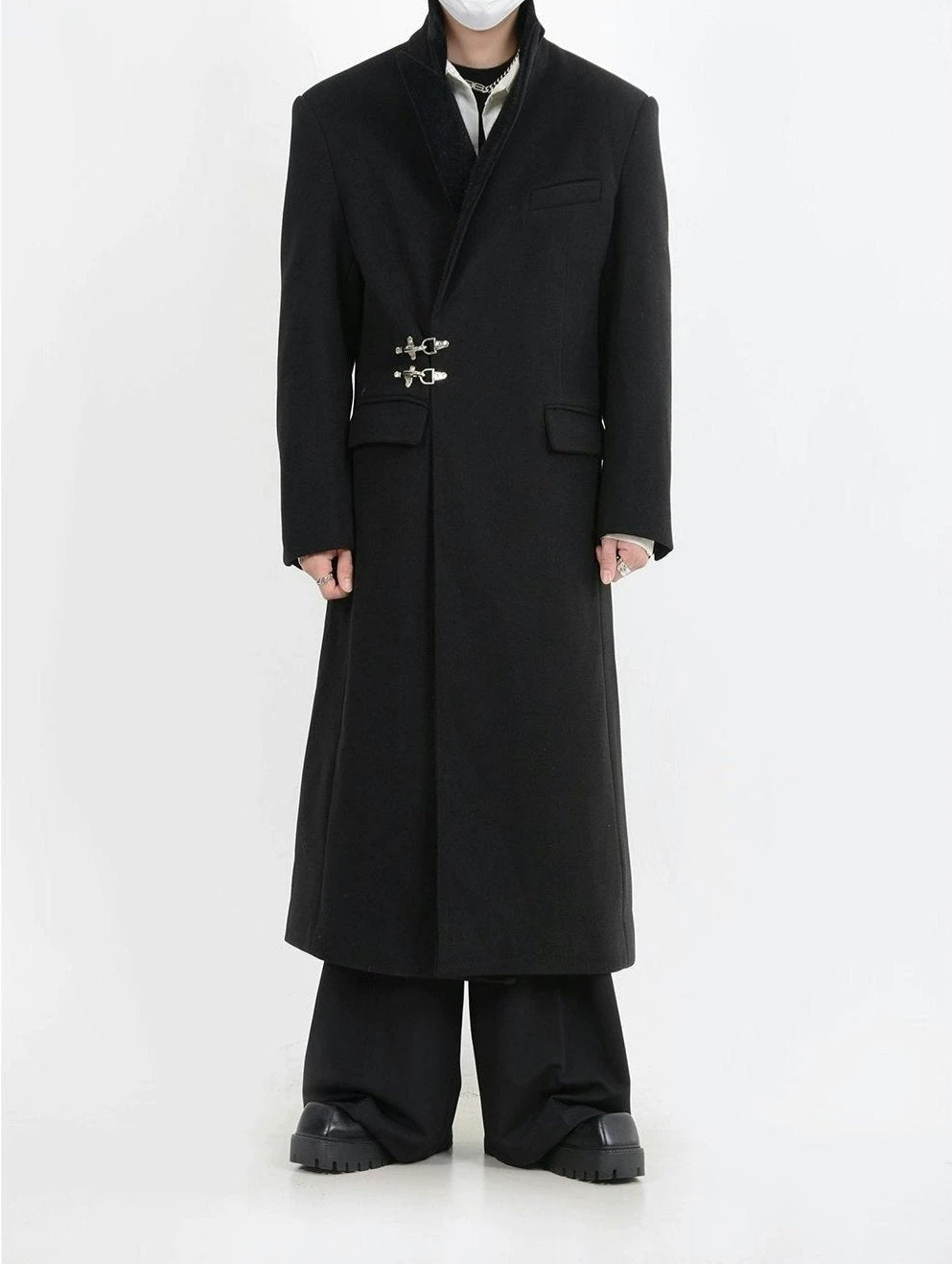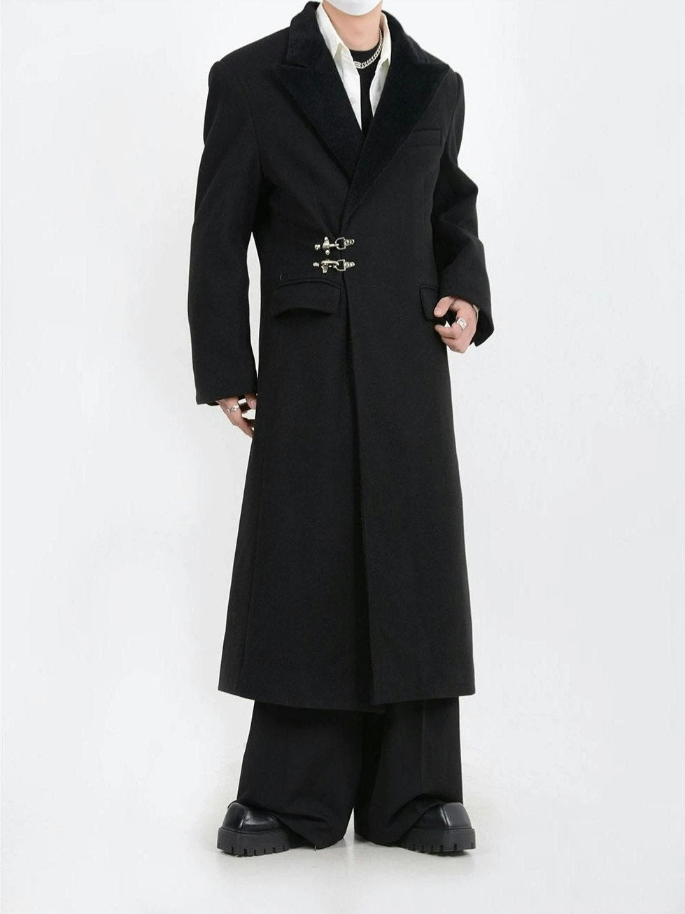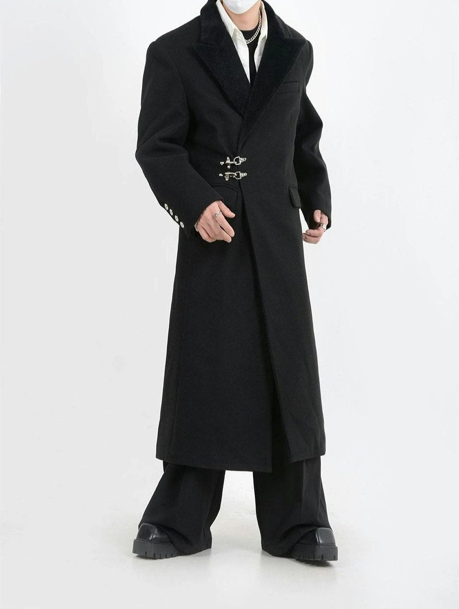 Expertly crafted from luxurious faux wool, this trench coat features a commanding velvet lapel and striking metal buckle closures for a modern edge. A monochromatic solid color palette ensures versatility, while the deconstructed design adds an effortlessly stylish and nonchalant appeal, perfect for the fashion-forward individual.