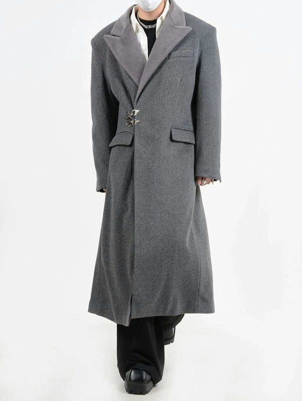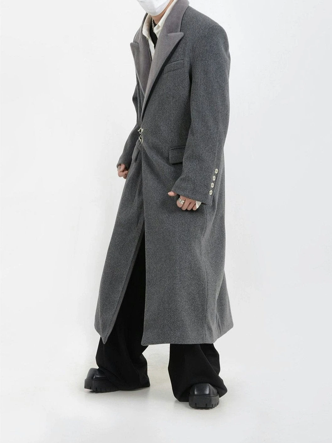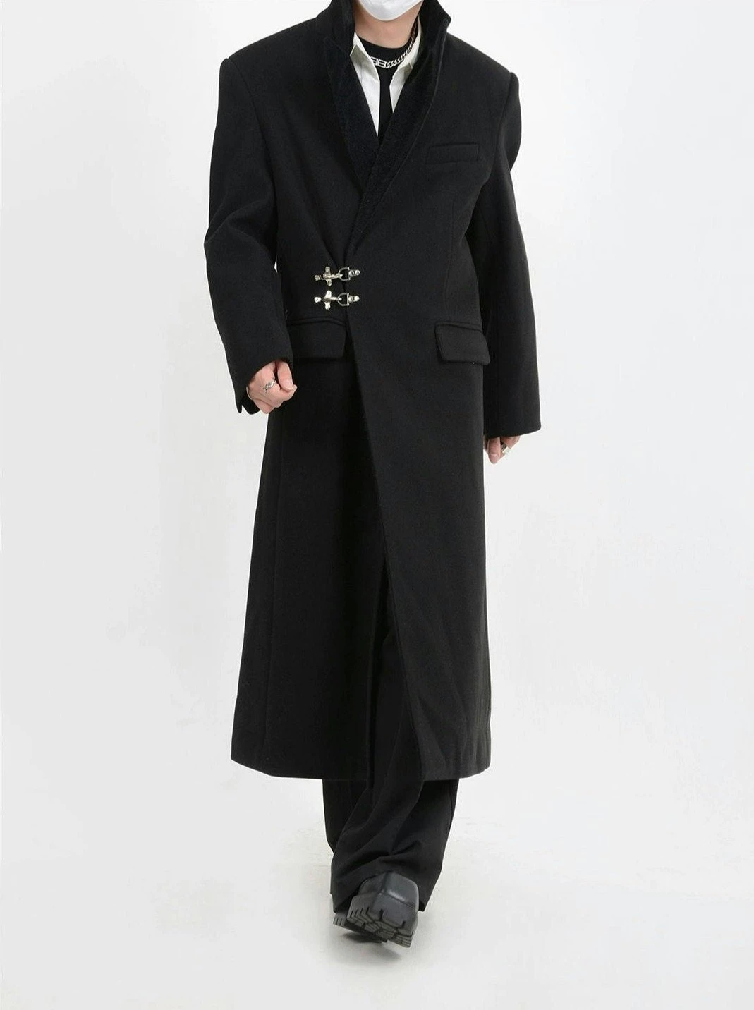 Expertly crafted from luxurious faux wool, this trench coat features a commanding velvet lapel and striking metal buckle closures for a modern edge. A monochromatic solid color palette ensures versatility, while the deconstructed design adds an effortlessly stylish and nonchalant appeal, perfect for the fashion-forward individual.