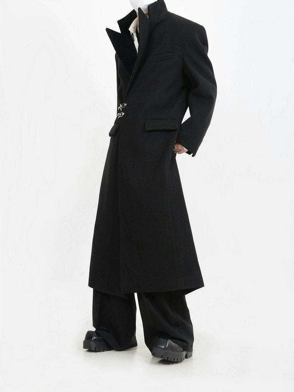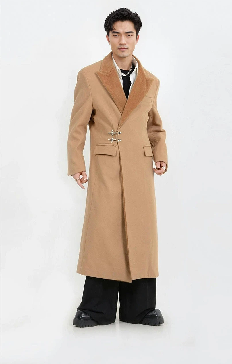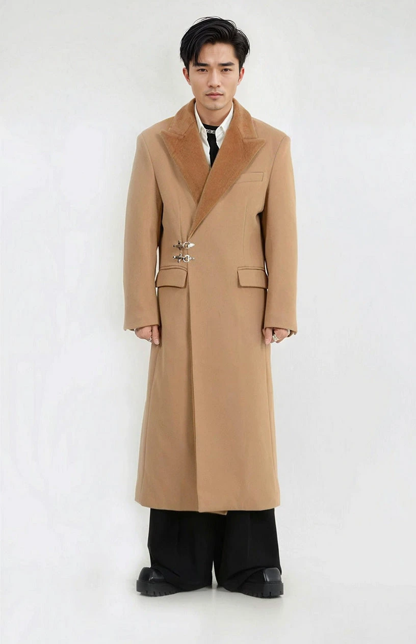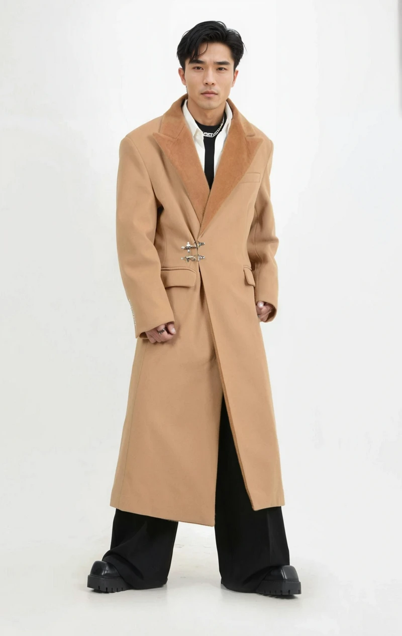 Expertly crafted from luxurious faux wool, this trench coat features a commanding velvet lapel and striking metal buckle closures for a modern edge. A monochromatic solid color palette ensures versatility, while the deconstructed design adds an effortlessly stylish and nonchalant appeal, perfect for the fashion-forward individual.