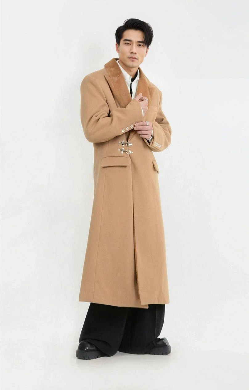 Whether styled over a sharp suit for professional settings or paired with casual ensembles for relaxed weekends, this coat’s loose fit and over-the-knee length provide both comfort and panache. It’s an ideal choice for those looking to make a statement in any leisure or social scene.