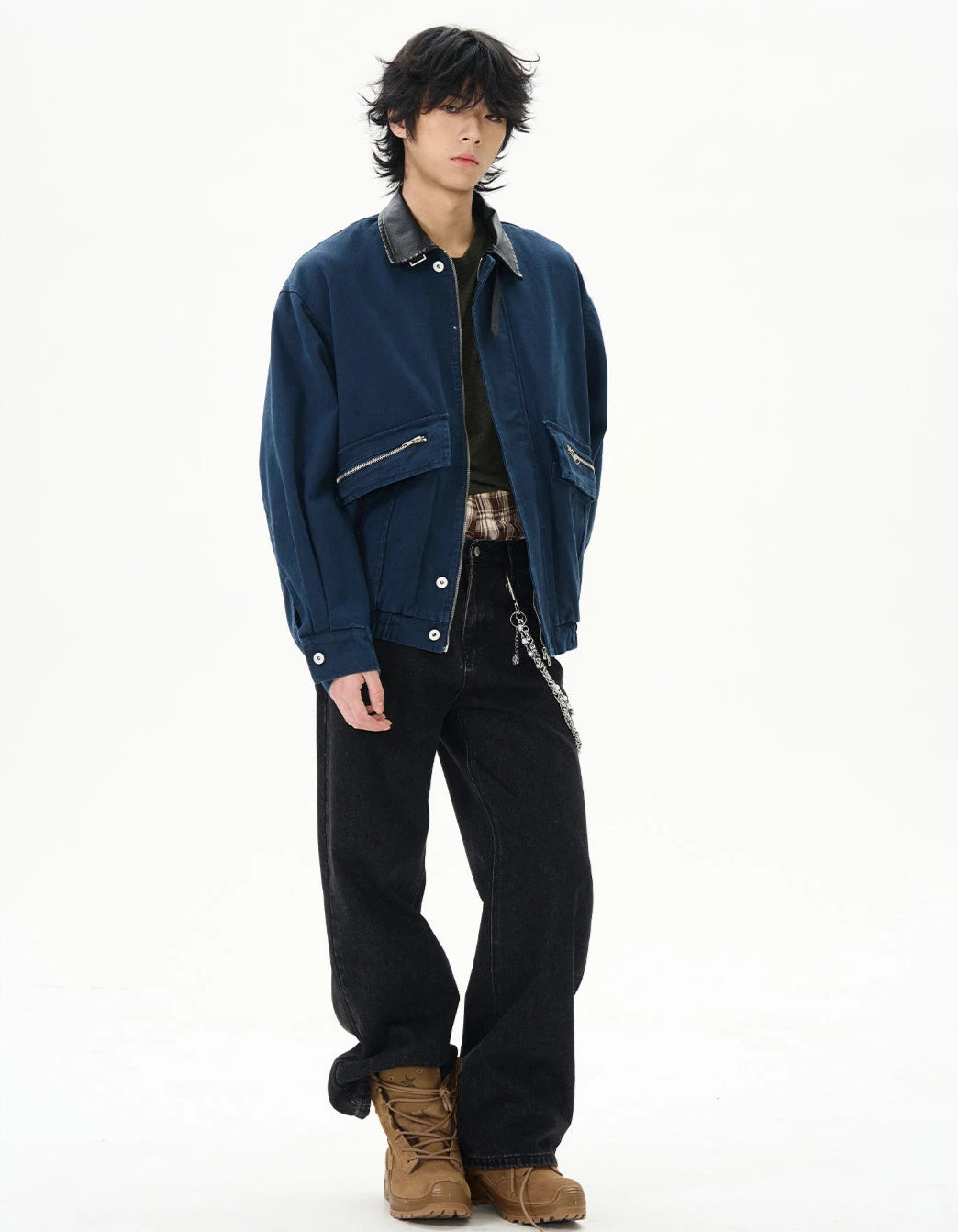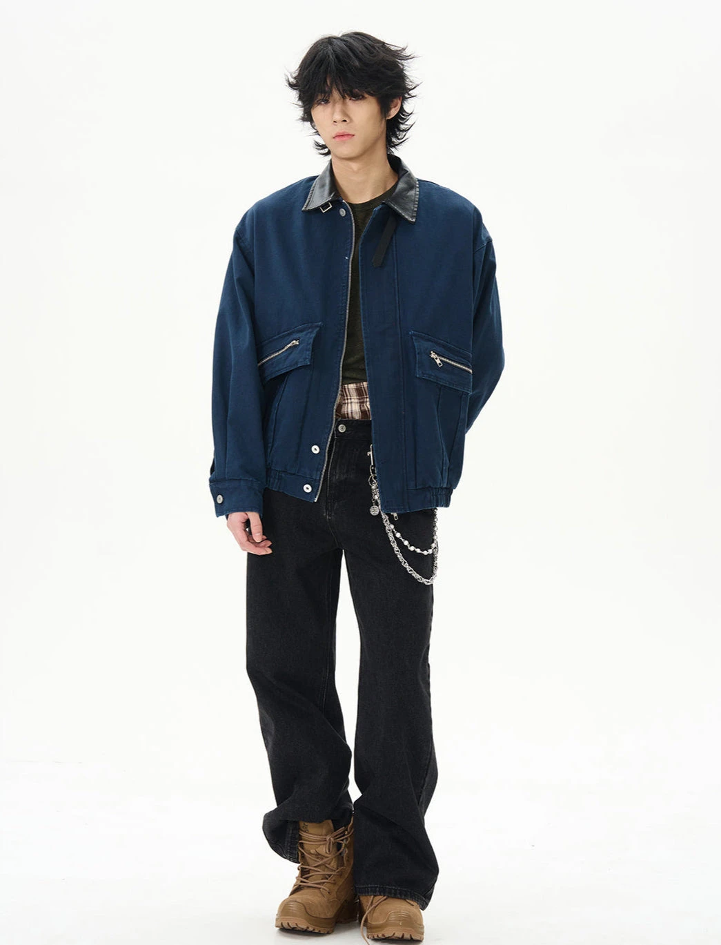 Crafted from durable medium-weight cotton, this jacket boasts washed detailing for a slightly worn-in, lived-in aesthetic, enhanced by multi-pocket styling with zipper closures. The elasticized hem and cuffs offer a comfortable fit while adding structure to the relaxed silhouette. The faux leather lapel elevates the look, making this jacket a unique choice for casual outings, creative work environments, and evening streetwear vibes.